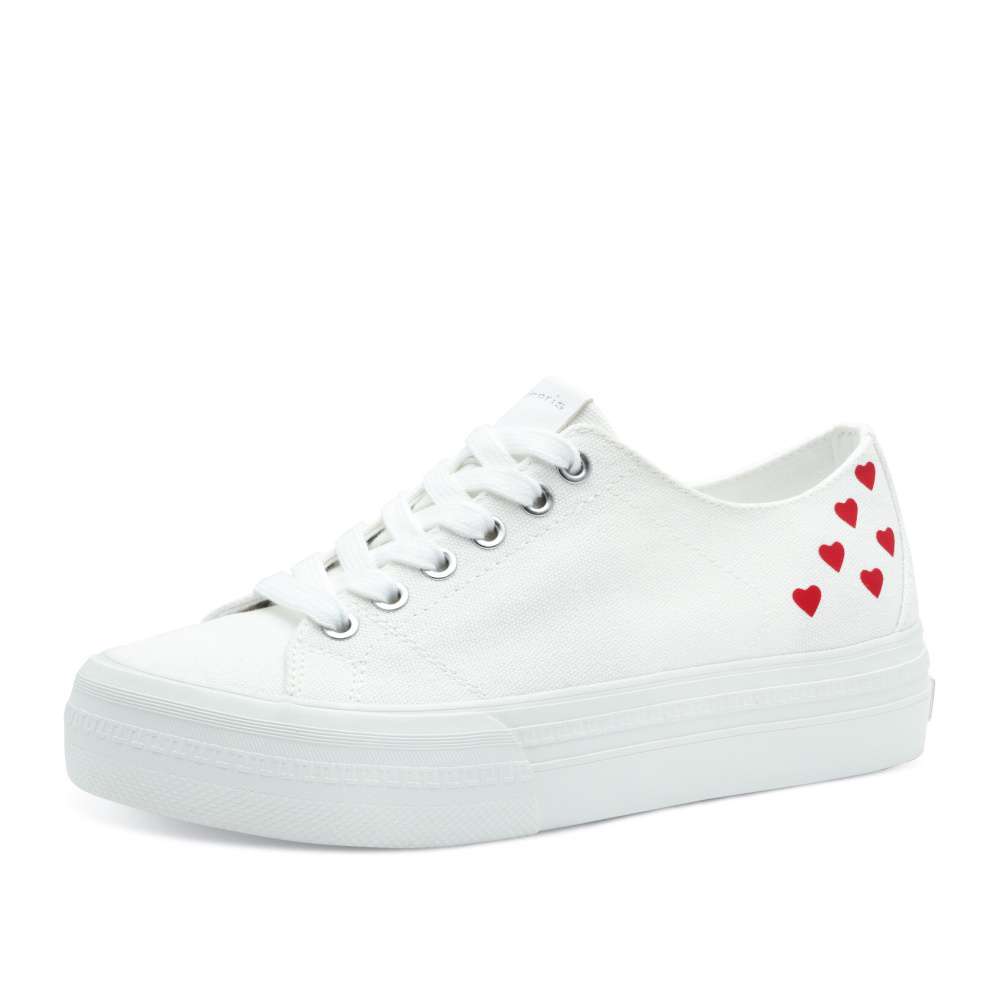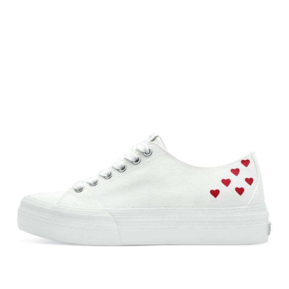 Roztomilé bílé tenisky se srdíčky, které dodají vašemu stylu hravý a veselý nádech jsou synonymem klasického a čistého stylu, který lze snadno kombinovat s různými outfity. Šněrování umožňuje pohodlné upravení podle vašich potřeb a vyšší podrážka zajišťuje nejen pohodlí při chůzi, ale také dodává teniskám moderní vzhled. Srdíčkový vzor na svršku boty přináší šarm a originalitu, ideální pro ty, kteří chtějí vyjádřit svou osobnost. S těmito teniskami budete vypadat a cítit se skvěle. Technologie: VEGAN – pro zodpovědný životní styl bez živočišných materiálů.