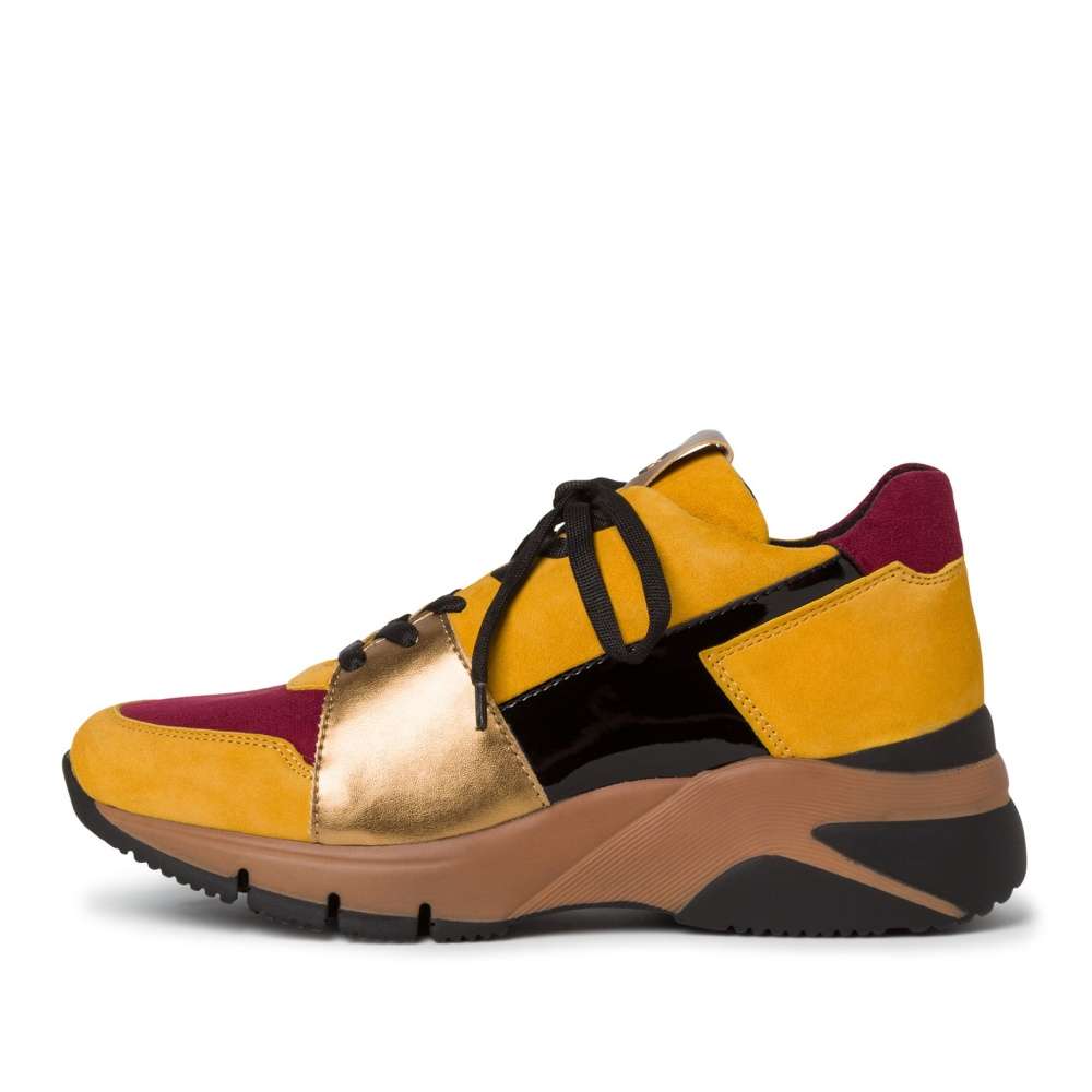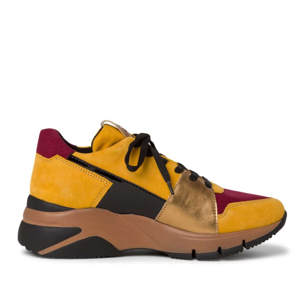 Tato teniska Vás na první pohled zaujme svým unikátním svrškem, který je poskládán z několika částí různých barev. Oblíbenou hořčicově žlutou doplňují detaily v metalické, černé a vínově barvě. Tento model oživí Vaše outfity jak do města, tak i do přírody.
