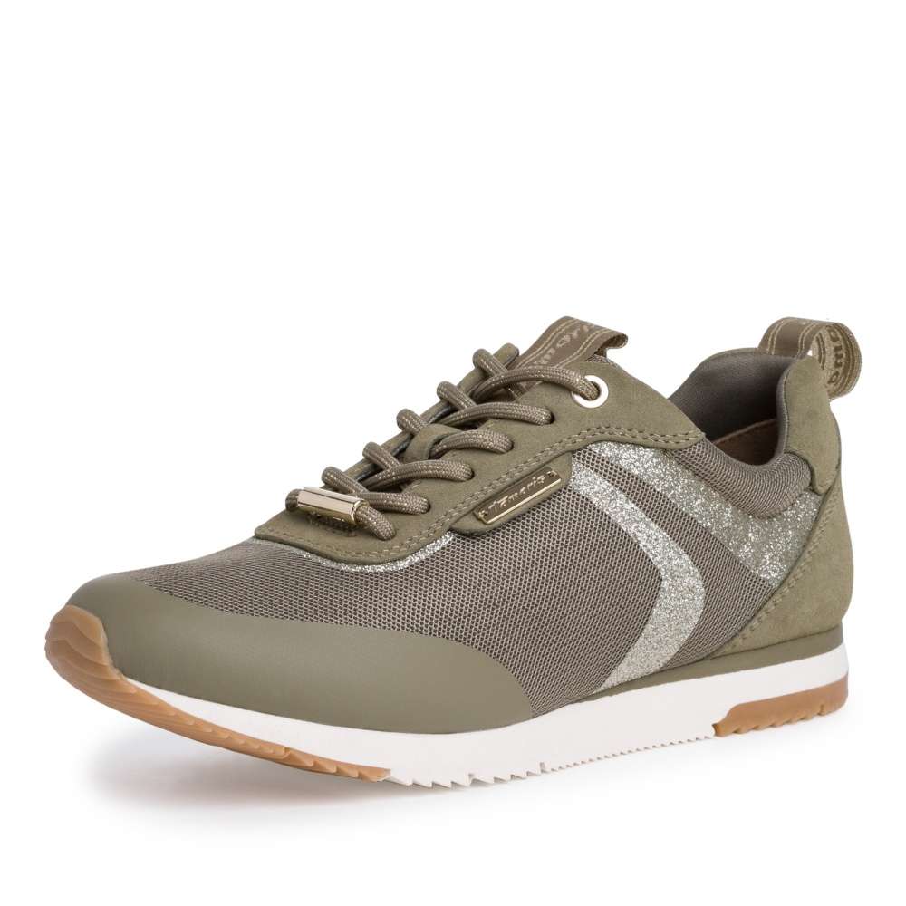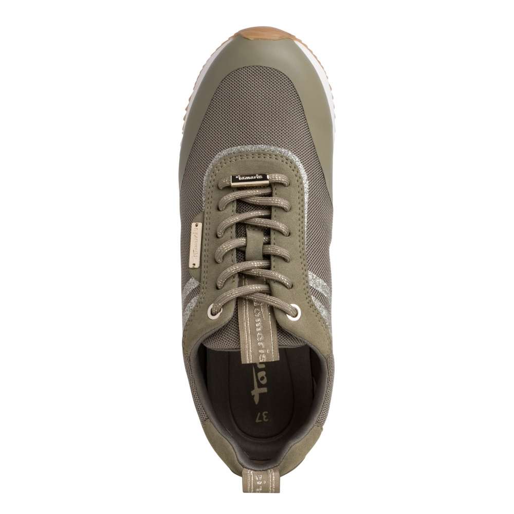 Pohodlné dámské tenisky značky TAMARIS, které rozzáří Váš den i botník. Svršek je doplněn třpytivými tvary po celém obvodu, čímž botičky vyniknou a budou se krásně lesknout na slunci. Nesmí chybět logo značky. Pro dokonalé pohodlí je zde zabudována měkká vyjímatelná stélka, a tak se nemusíte bát, že nezvládnete delší pochůzky. Tato obuv je vhodná jak na procházky v parku, tak do práce, nebo do kina.