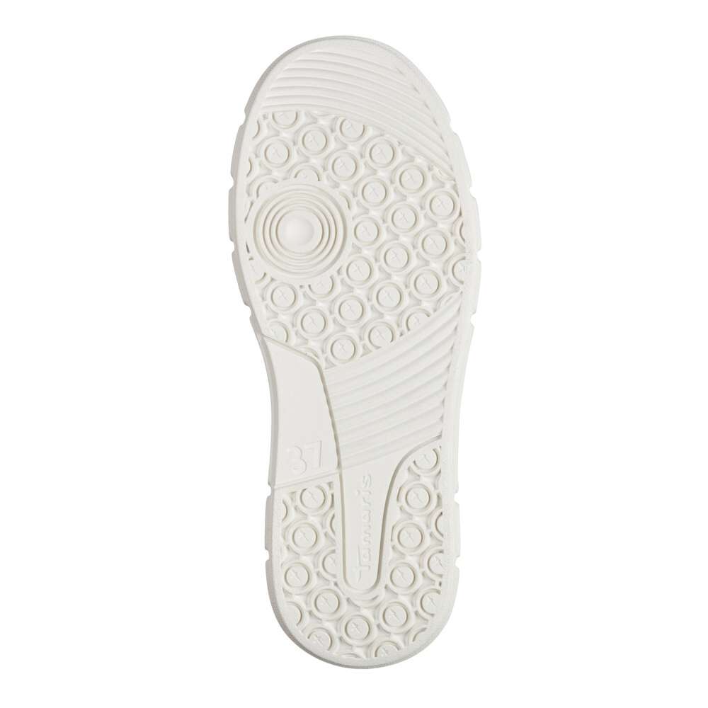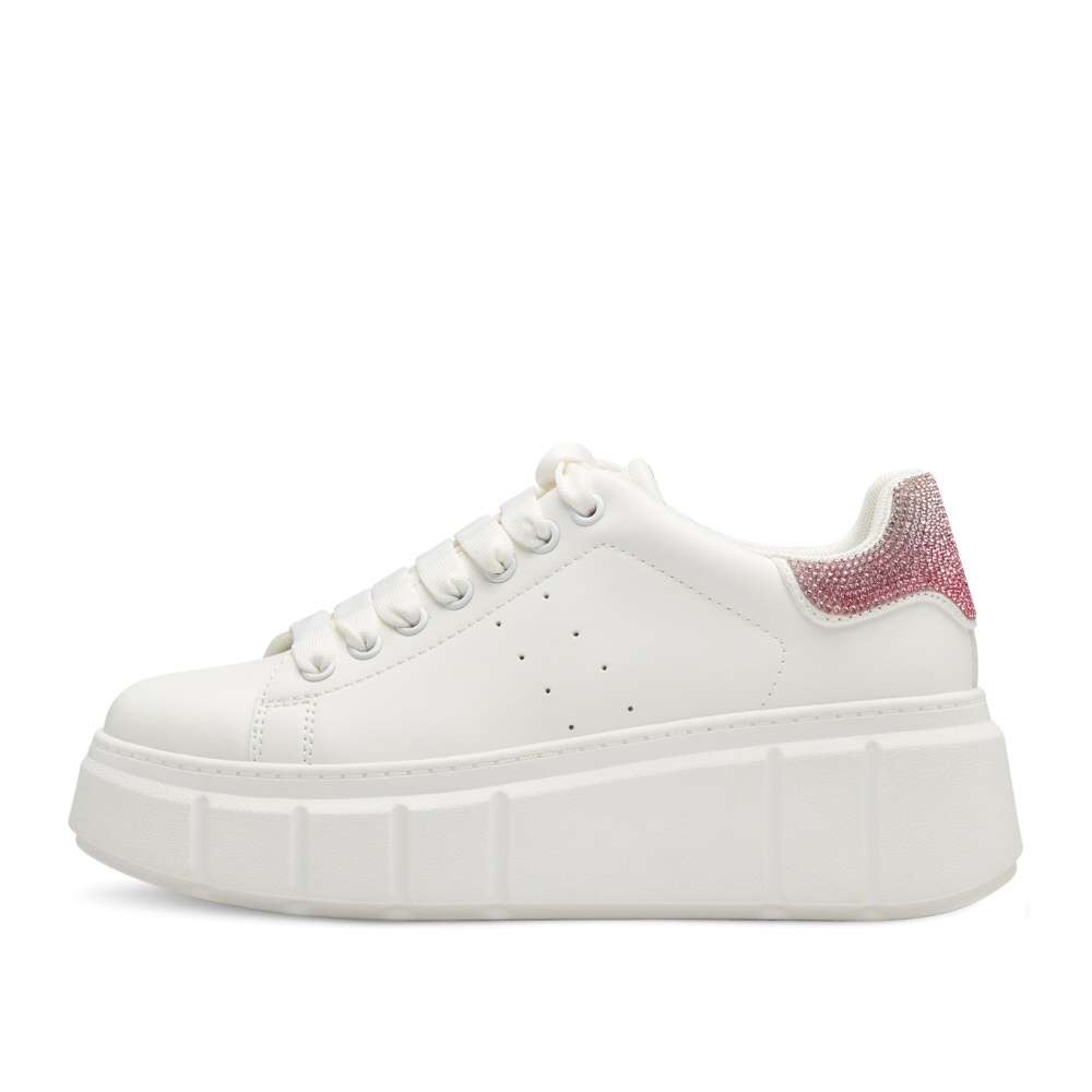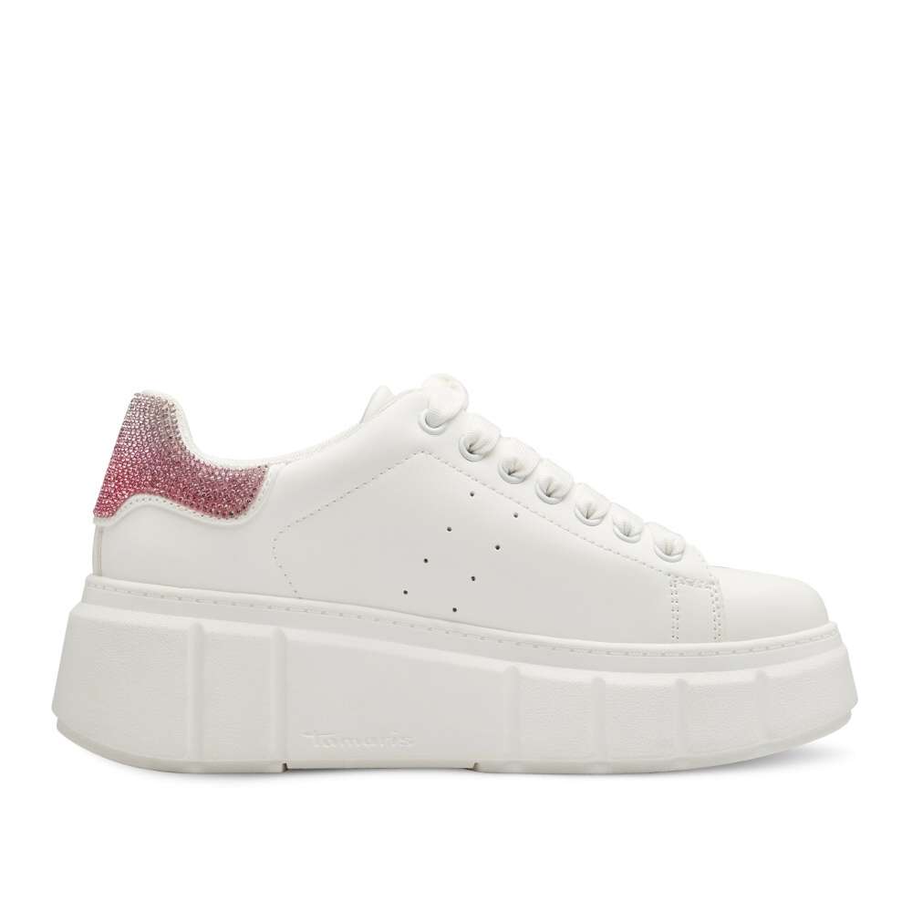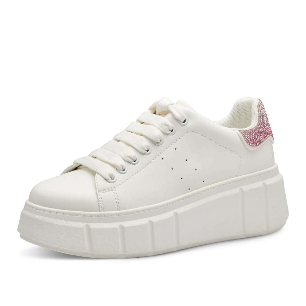 Tyto dámské bílé tenisky od značky Tamaris jsou kombinací klasického designu s nápadnými detaily, které dodávají obuvi jiskru. Zadní část tenisek je zdobená třpytivými kamínky, které dodají elegantní a stylový vzhled. Šněrování umožňuje přesně nastavit šířku pro pohodlné nošení během celého dne. Vyšší podrážka nejenom dodává obuvi moderní vzhled, ale také zvyšuje stabilitu a pohodlí při chůzi. Tato vyšší podrážka je trendovým prvkem, který dodává teniskám osobitý charakter. Tyto bílé tenisky Tamaris s třpytivými kamínky jsou ideální volbou pro ženy, které hledají kombinaci módního vzhledu a pohodlí.
