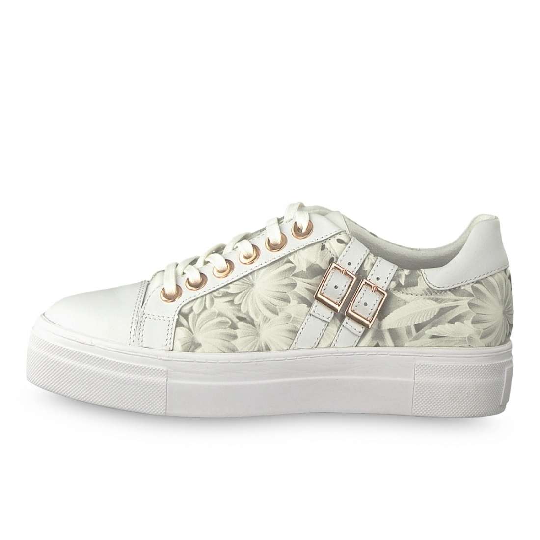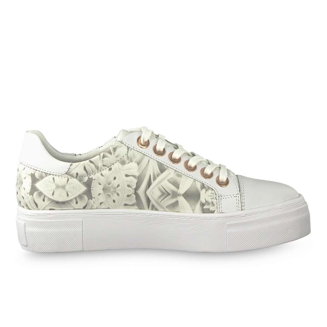 Bílé kožené tenisky s potiskem šedé barvy a zdobením z vnější části dvěma přezkami z dílny módního návrháře Marcel Ostertag Vás upoutají na první pohled. Nazouvání Vám ulehčí šněrování s výraznými kroužky v měděné barvě. Ideální obuv na procházku nebo do práce k džínům a košili.