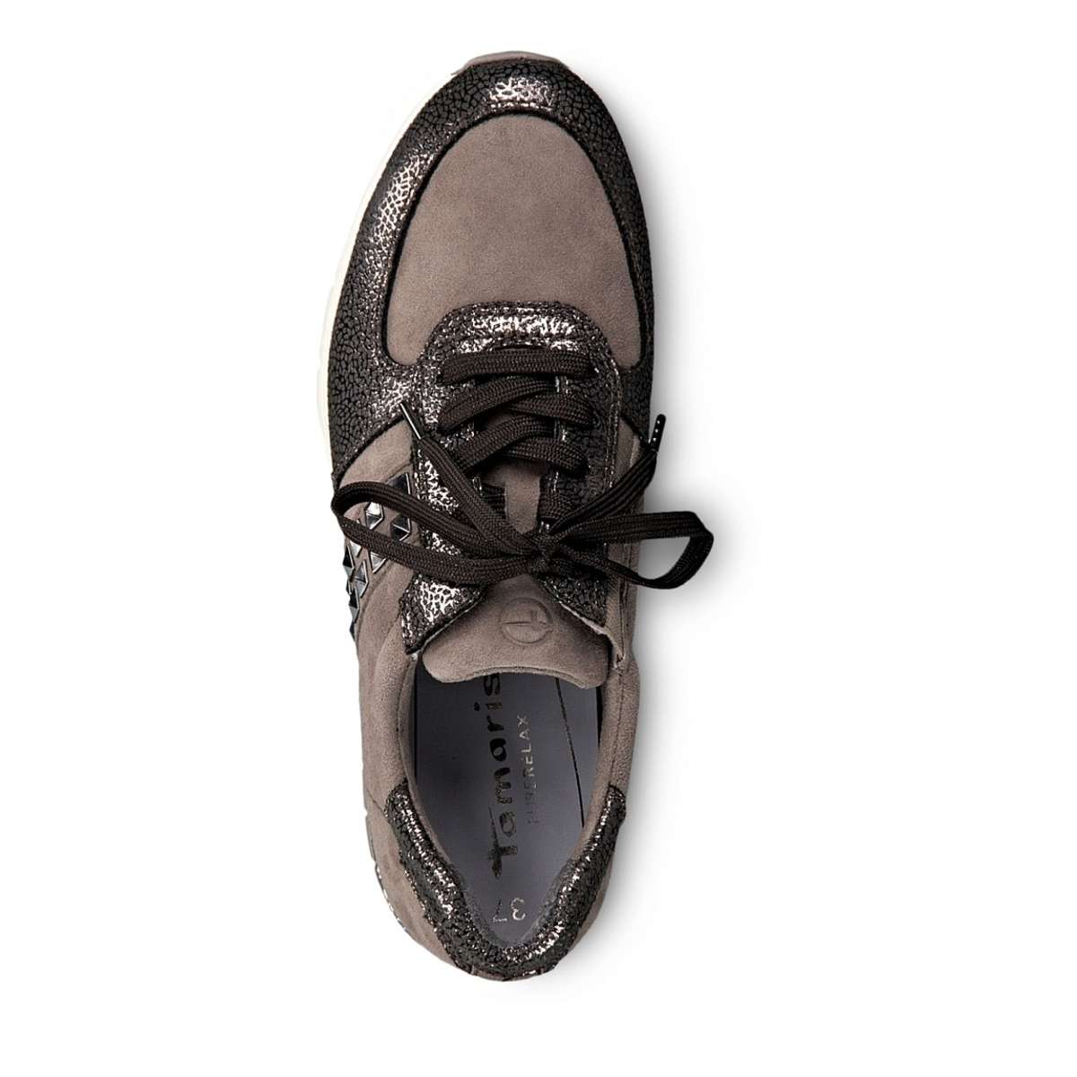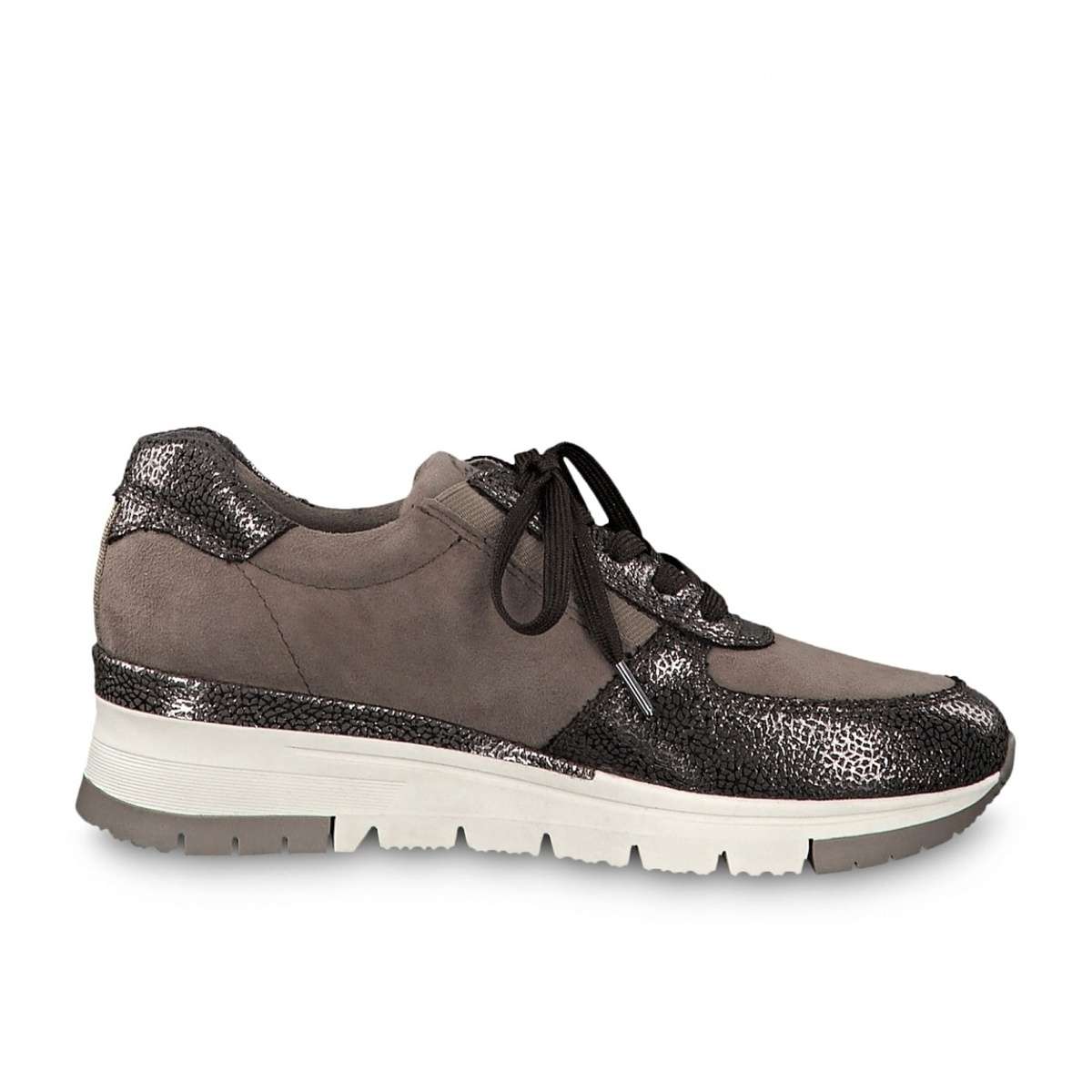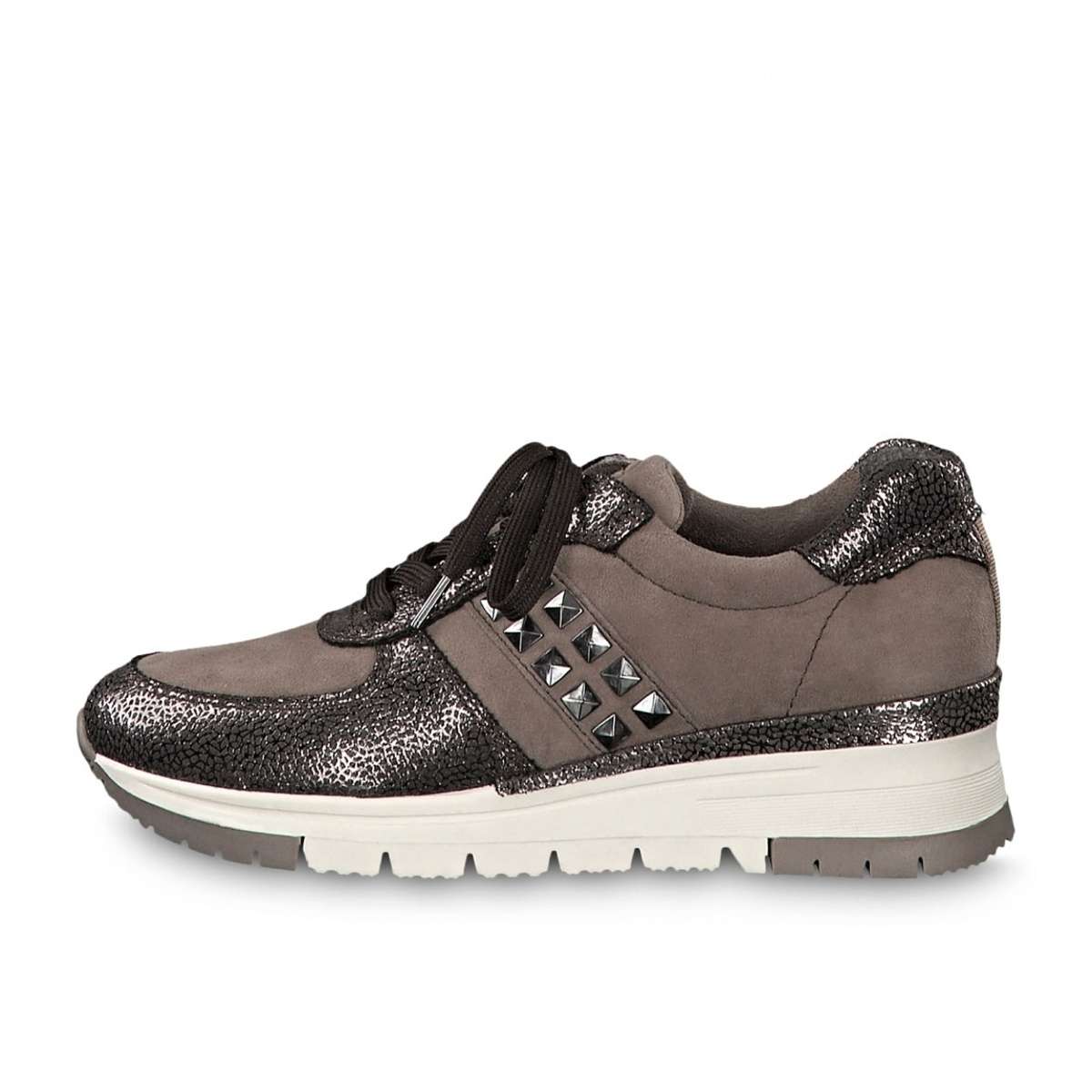 Dámské polobotky pro sportovně založené slečny i dámy, ale i pro všechny ostatní. Úžasné boty s vyšší pevnou podešví pro stabilní krok si šněrováním upravíte dle svých představ. Zdobení díly s metalickými odlesky a kovovou aplikací na vnější straně doladí tento vzor k dokonalosti. Užijete je jak na cestu do práce, tak na běžné chození po městě.