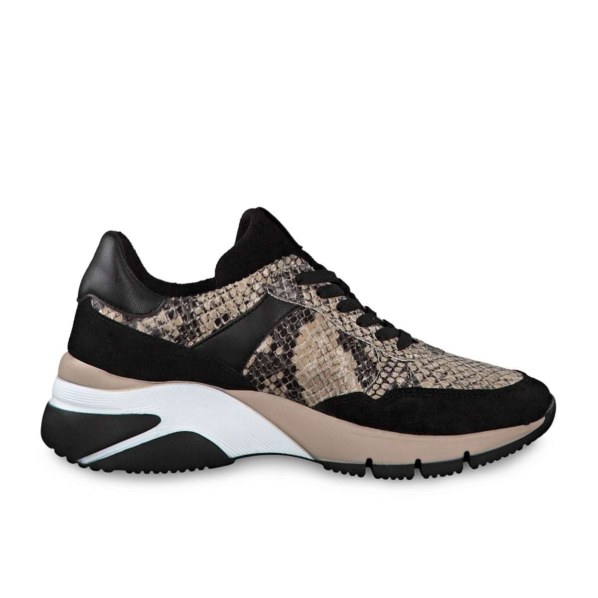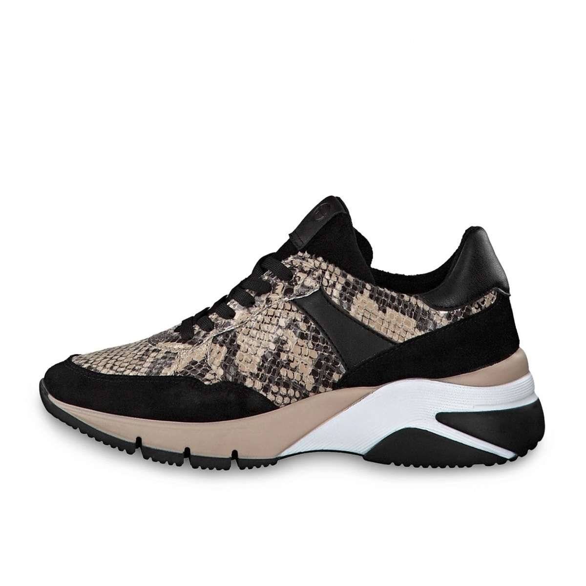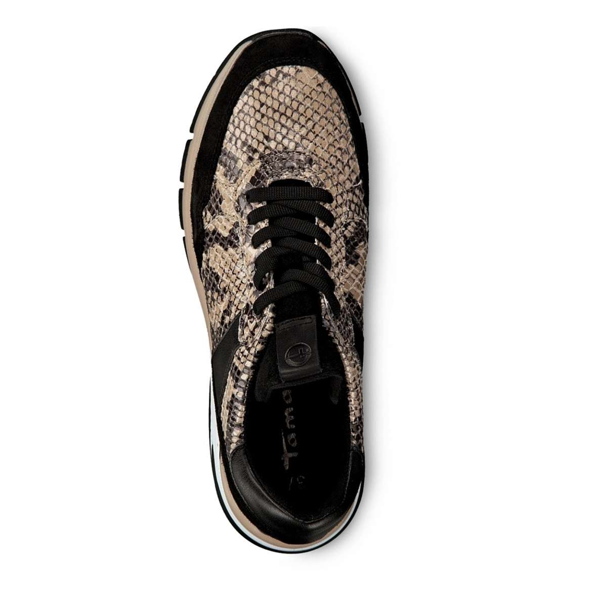 Dámská kožená teniska složená z černých a vzorovaných částí, značky TAMARIS.