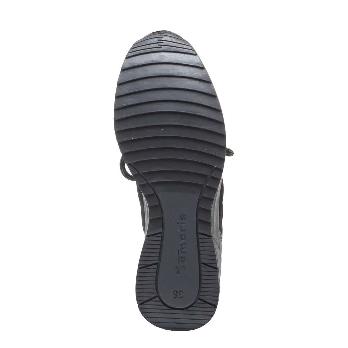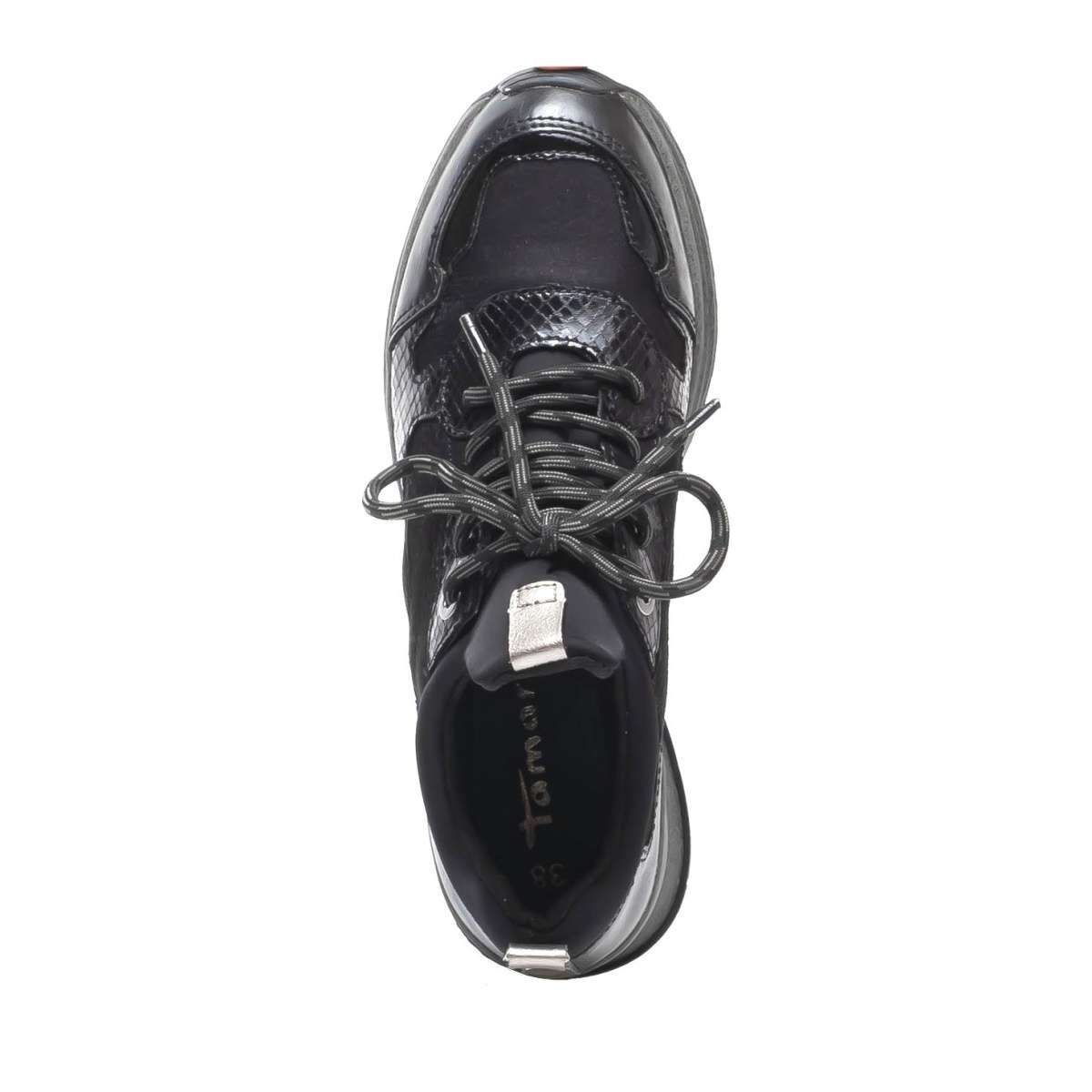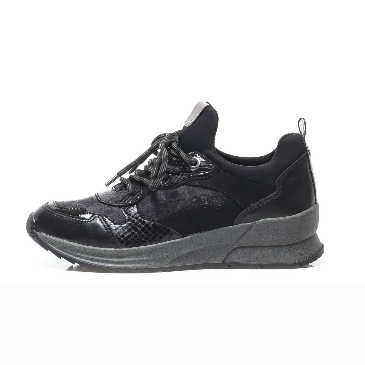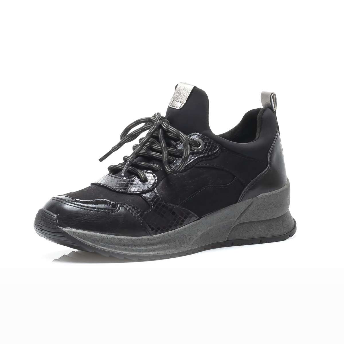 Dámské tenisky vynikají unikátní kombinací svrškových dílů v černé barvě. Lesklé dílce a designová podešev pak doladí obuv k dokonalosti. Šněrováním si boty upravíte přímo k Vaší noze. Tento velmi pohodlný a povedený model unosíte jak na procházky s dětmi, běžné pochůzky po městě, tak na cestu do práce.