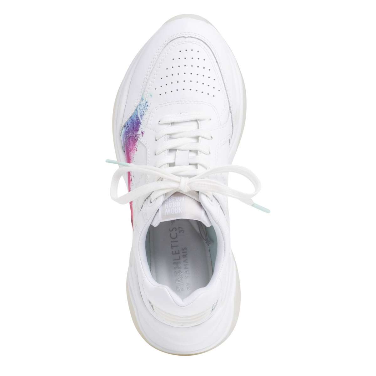 Tyto dámské kožené tenisky z řady Fashletics budou ideálním doplňkem Vašeho sportovního outfitu. Hladký kožený bílý svršek zdobí na vnější straně pestré barvy.TAMARIS řady „FASHLETICS“ spojuje módu s pohodlným sportovním stylem, který se hodí pro každý všední den. Kromě atletického vzhledu se tato nová řada soustředí především na lehkost a pružnost sportovních modelů.