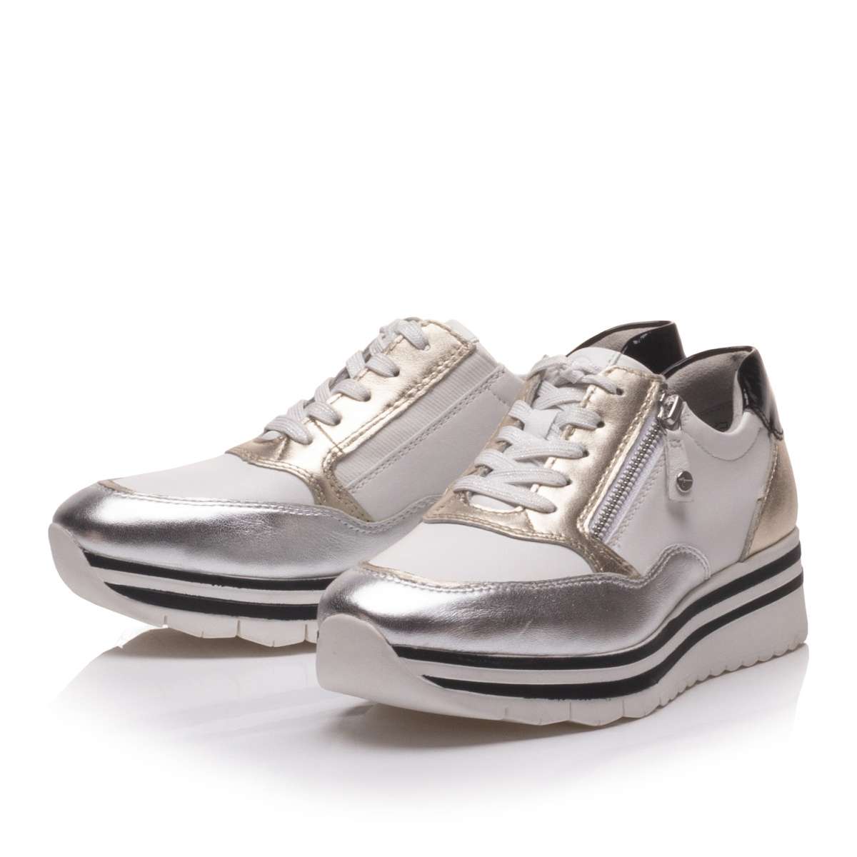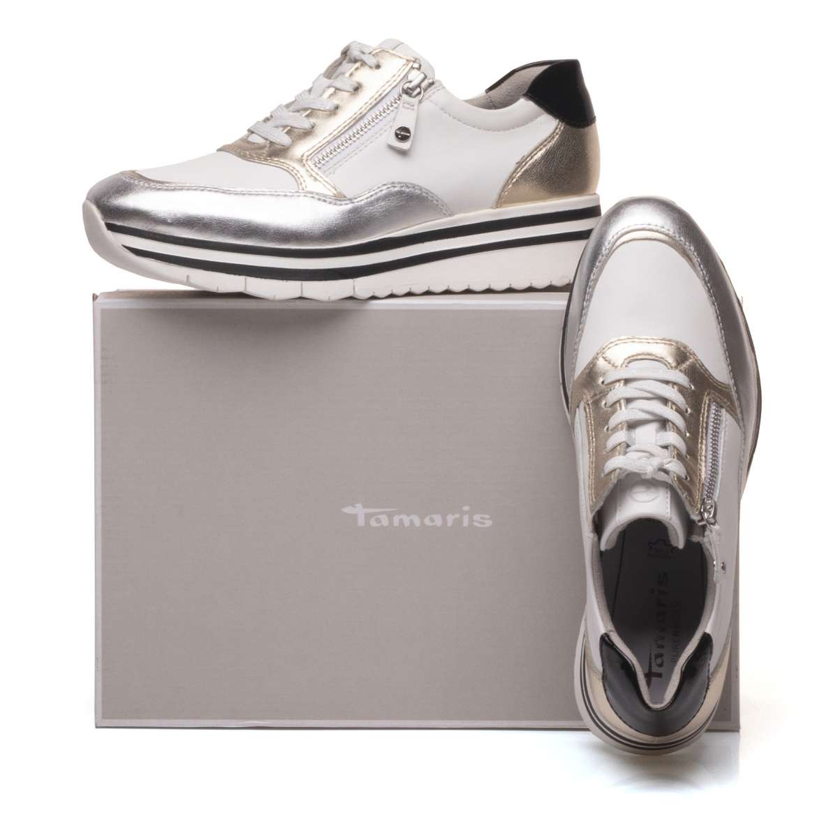 Dámské kožené tenisky značky TAMARIS, jsou úchvatné na první pohled. Barevná kombinace zlaté, stříbrné a bílé perfektně doladí každý Váš outfit. Na vnější straně je funkční zip pro snadné obutí a přizpůsobení přímo k Vaší noze. Vyšší podešev a úžasně měkká stélka se Vám postarají o pohodlný a příjemný zážitek při každém Vašem kroku. Tento model užijete vždy a všude, ať už k volnočasovým či pracovním povinnostem.