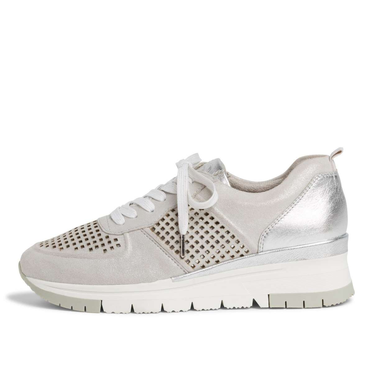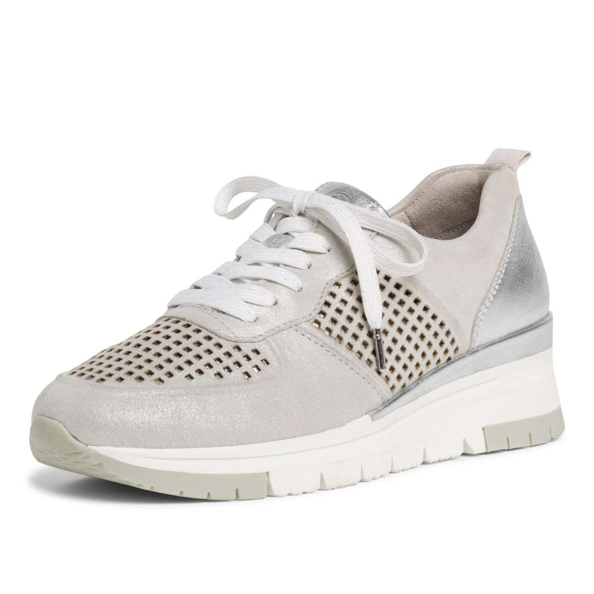 Dámské tenisky jsou šité z pravé kůže stříbrné barvy doladěné povrchovou perforací. Na vnitřní straně je pružná gumička pro snadné obutí a přizpůsobení přímo k Vaší noze. Vyšší podešev a úžasně měkká stélka se Vám postarají o pohodlný a příjemný každý krok. Tento model užijete vždy a všude, ať už k volnočasovým či pracovním povinnostem.