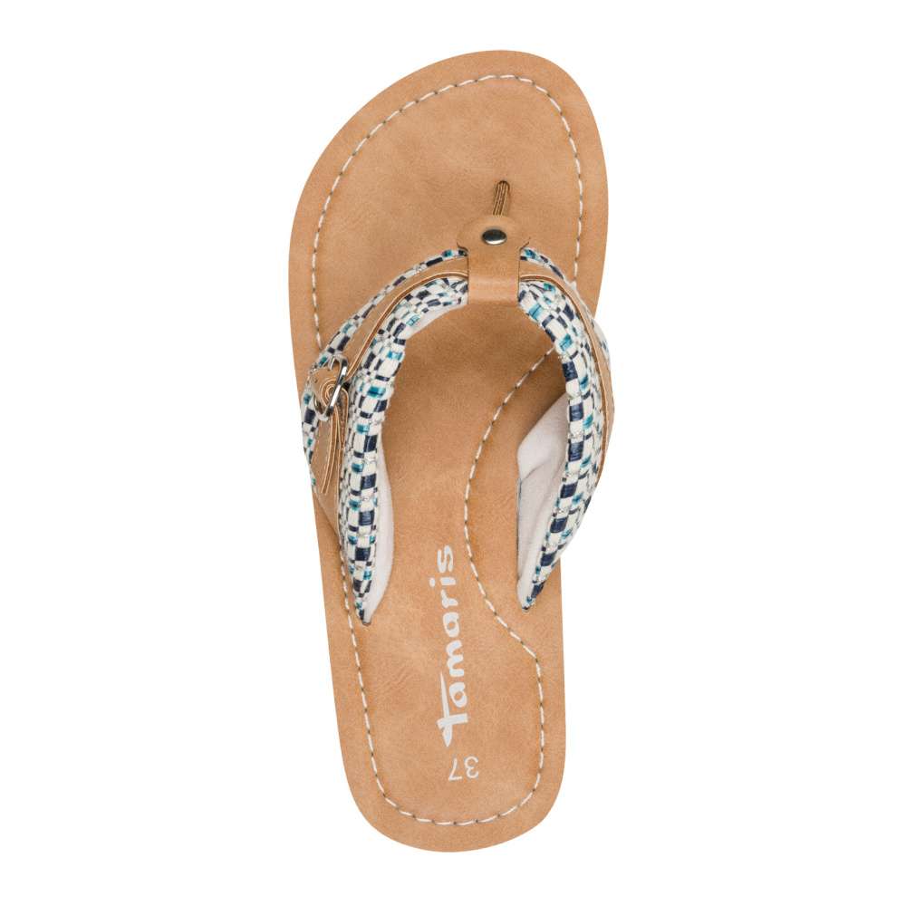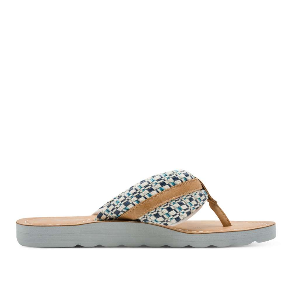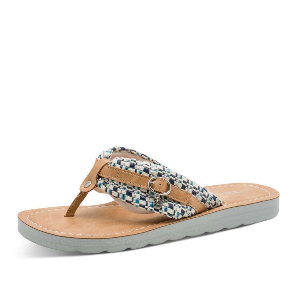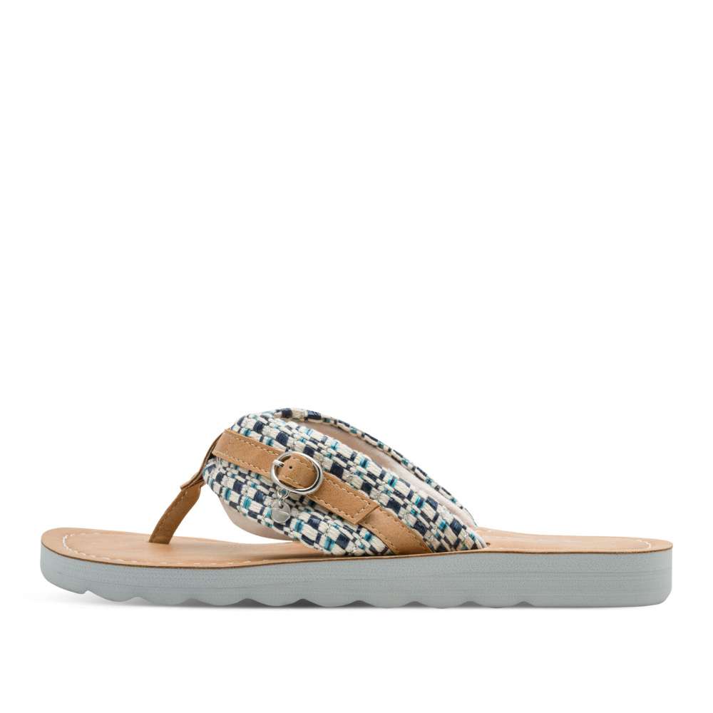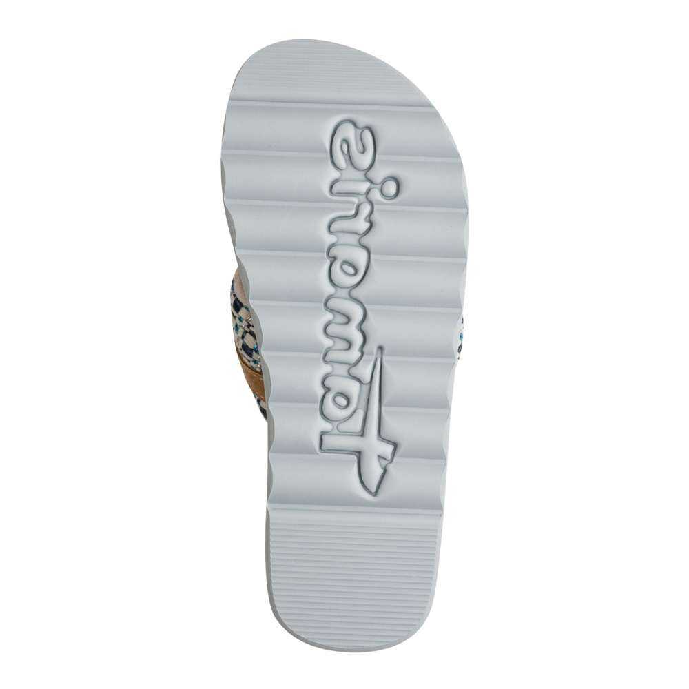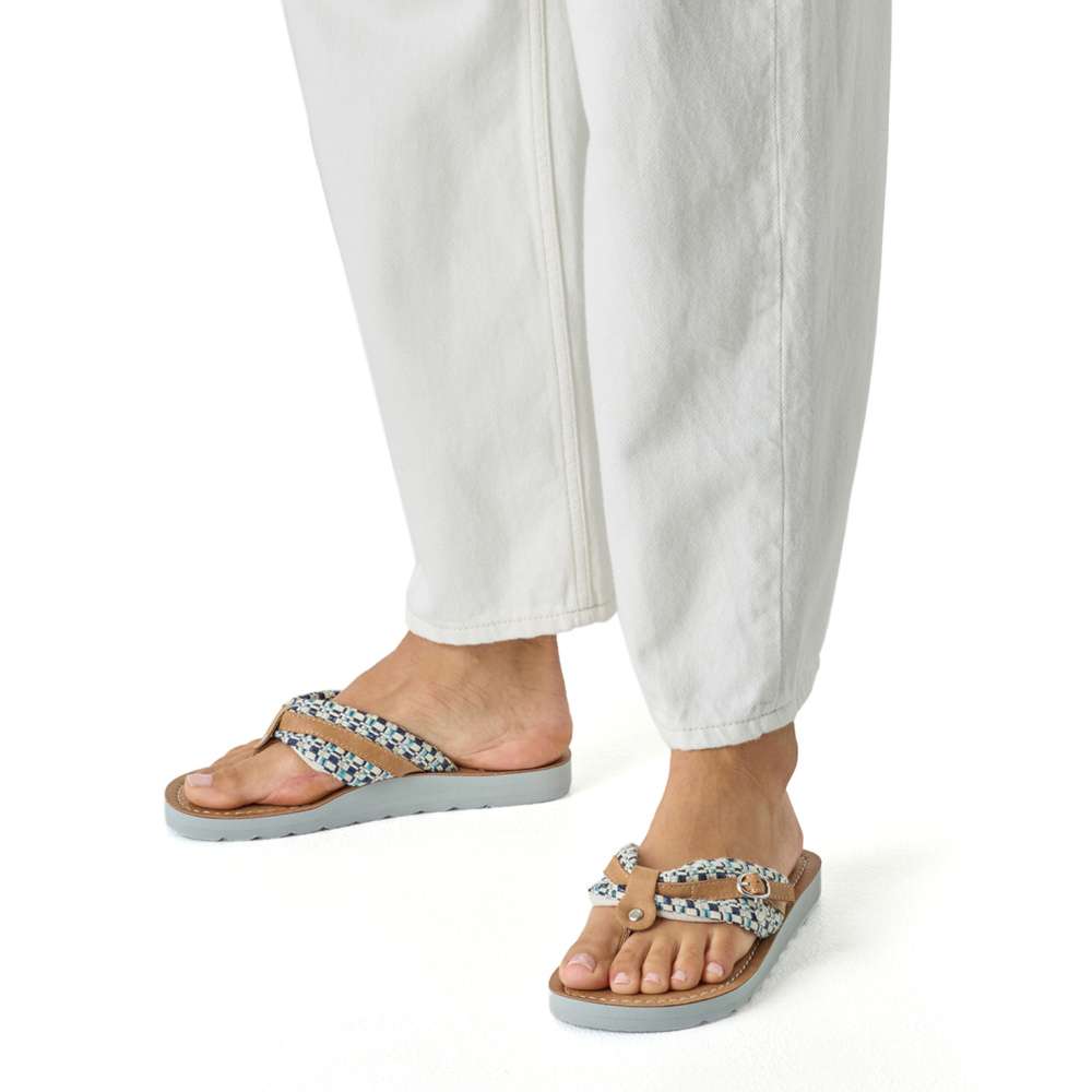 Veselé dámské žabky s modrou podrážkou – pohodlí a styl v jednom. Tyto žabky jsou jako stvořené pro ženy, které milují barvy, pohodlí a neotřelý design. Na první pohled zaujme široký textilní pásek s pestrobarevným tkaným vzorem v odstínech modré, bílé a stříbrné. Pásek je doplněn malou dekorativní přezkou v koženém designu, která celé botě dodává hravý, ale zároveň promyšlený vzhled. Měkká stélka v přírodním tónu je příjemná na došlap a perfektně doplňuje celkový letní charakter boty. Modrá podešev je lehká a pohodlná, s výrazným vlnitým profilem, který může přispět k lepší stabilitě a usnadnit chůzi na různých površích. Tento model je vhodný na procházku městem nebo do práce k letním šatům.