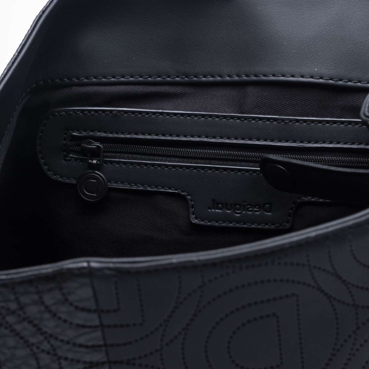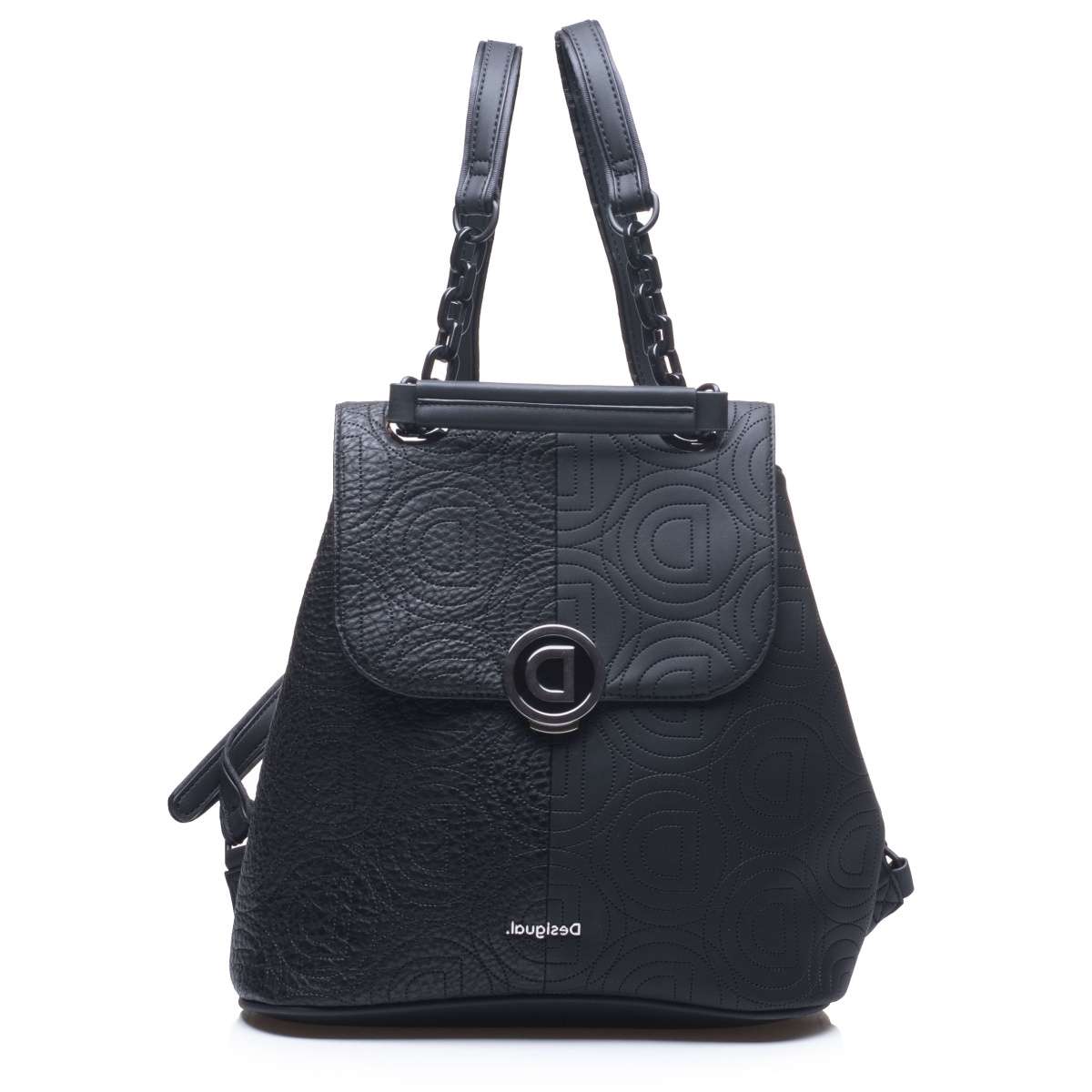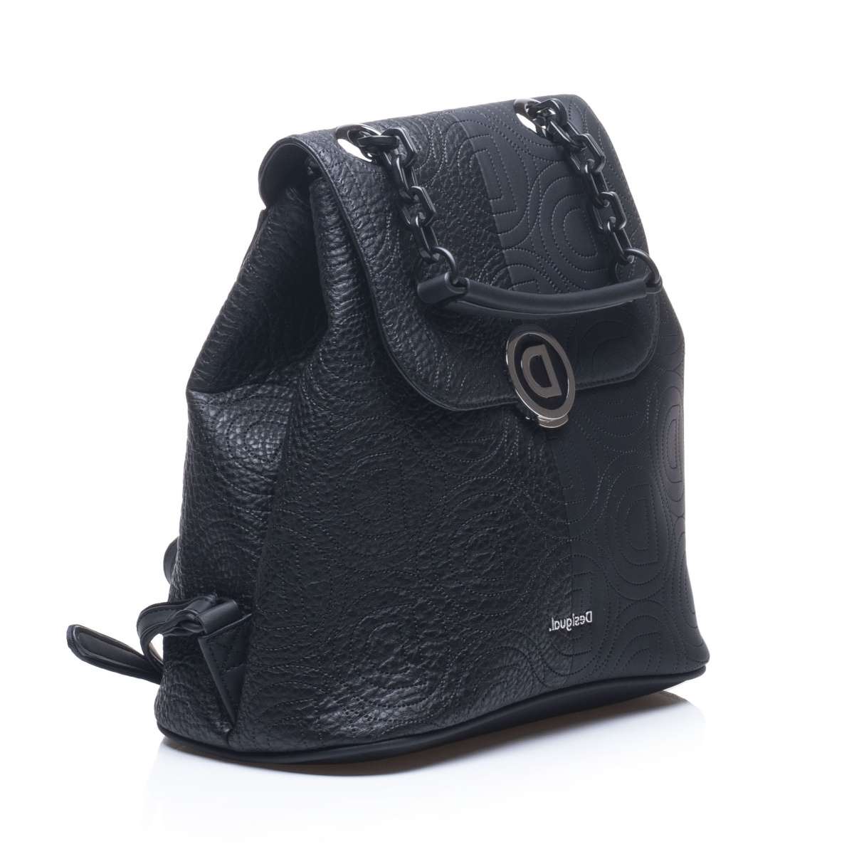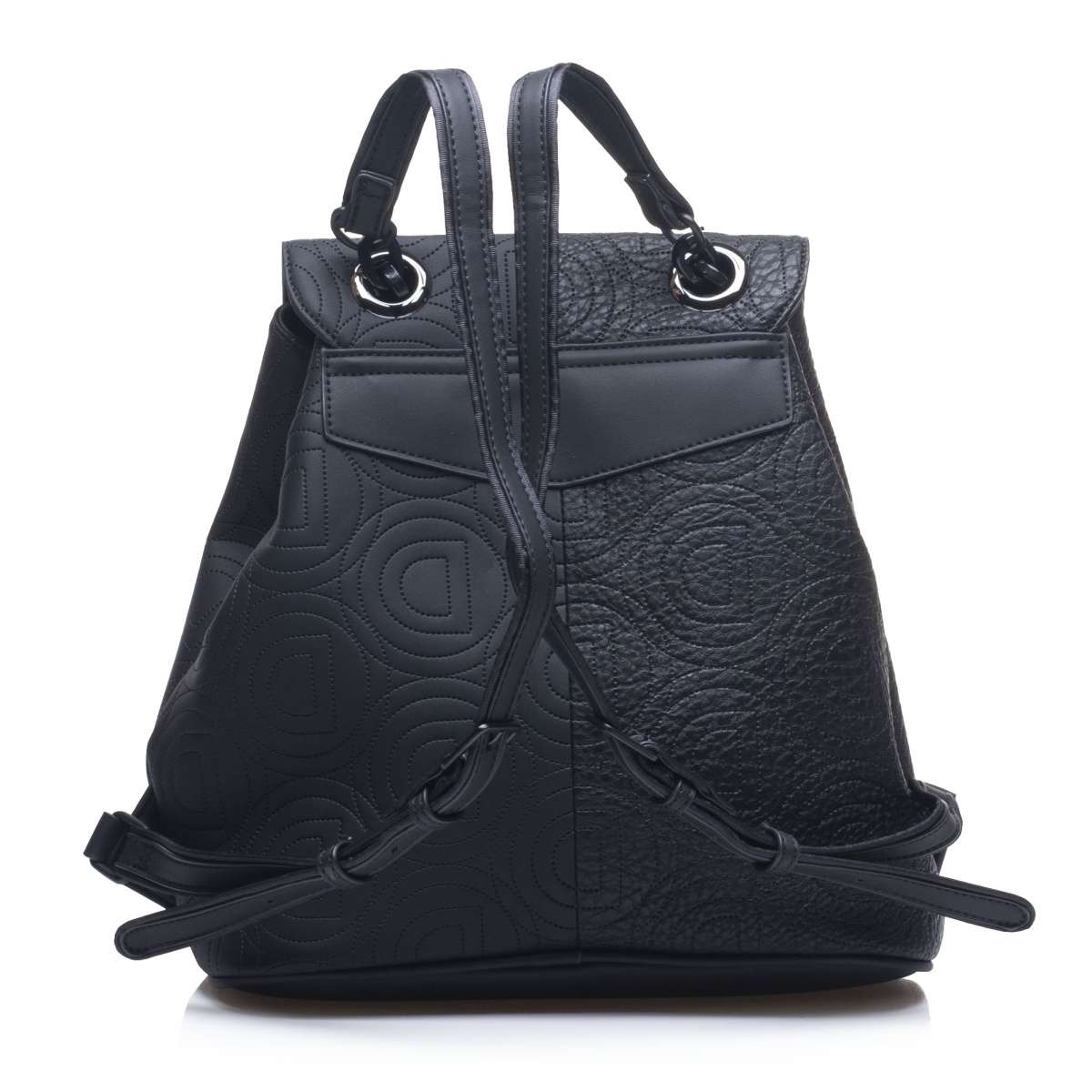 Dámský batůžek se zdobnou klopou má prošívaný svrchní materiál s motivem loga značky Desigual a je unikátním kouskem pro každou moderní ženu.
