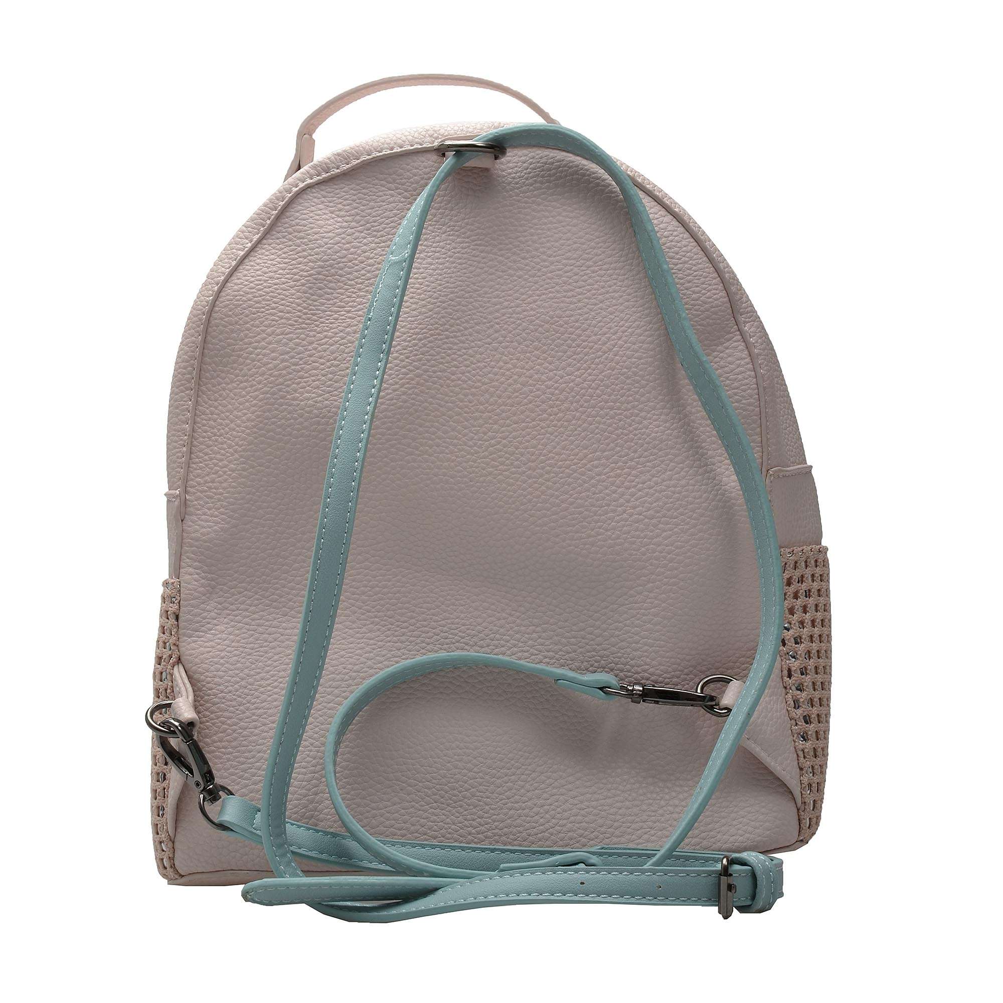 Svršek kabelky je vyroben ze syntetického materiálu v několika barevných provedeních se stříbrným podkladem ve spodní části. Přední strana batohu je zdobena dvěma zipy.