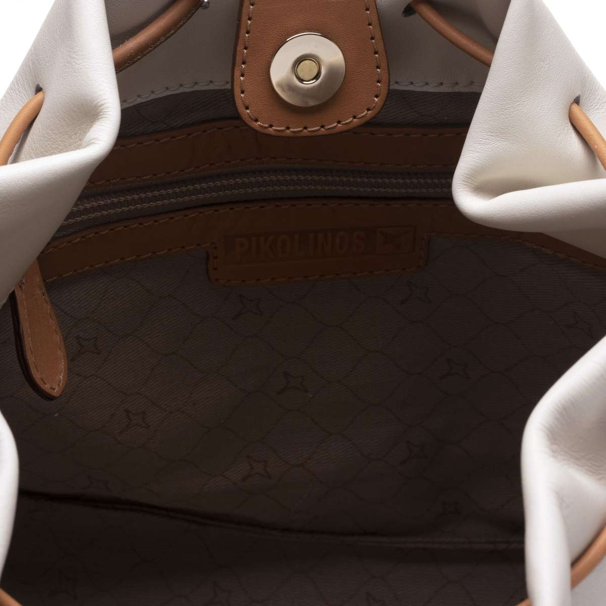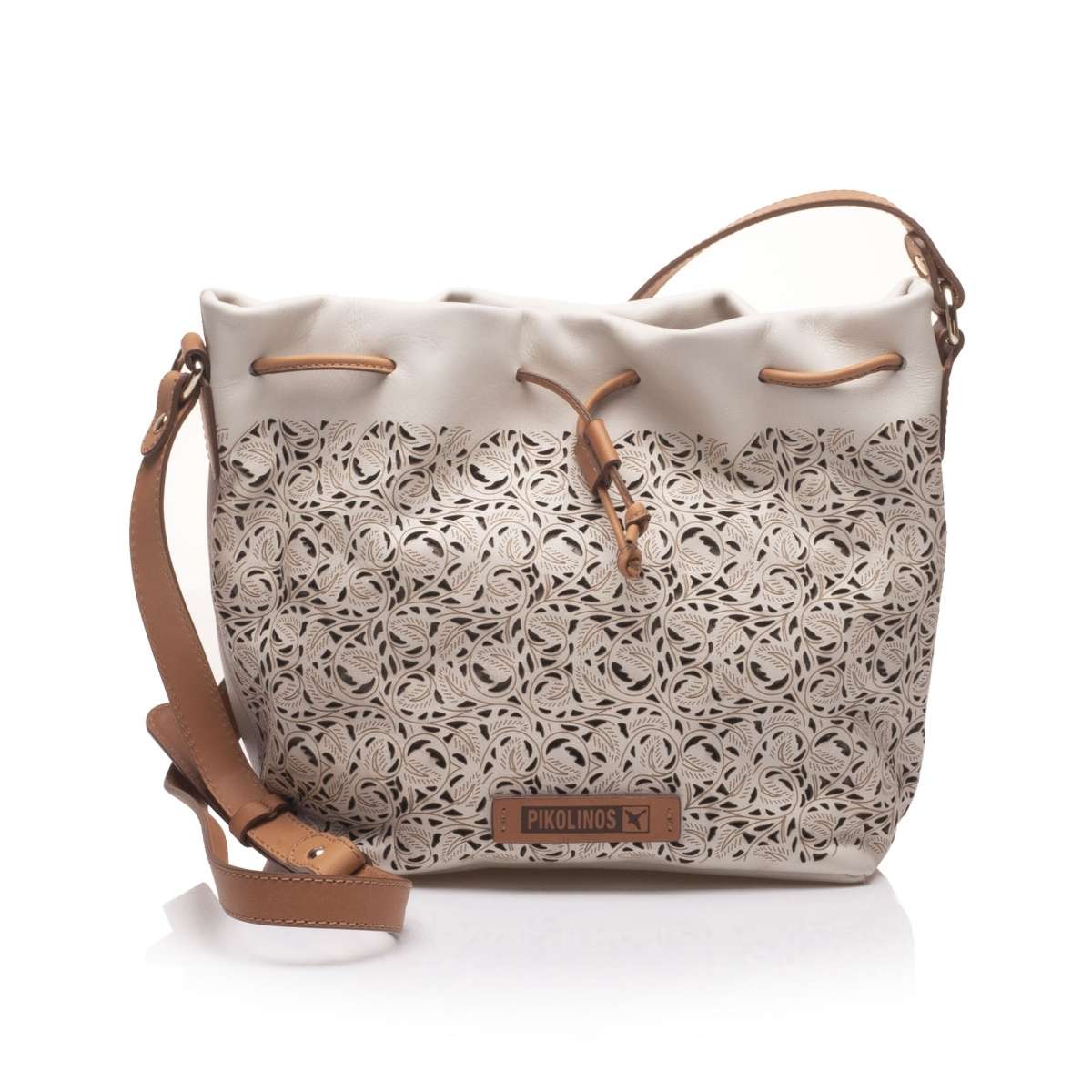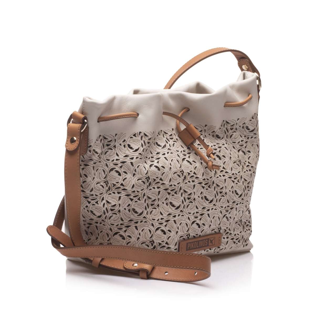 Nádherná dámská kabelka vyrobena z přírodní usně je od značky Pikolinos a díky světle béžové barvě s hnědými detaily tvoří skvělý harmonický celek. Určitě si oblíbíte stahovací kožené šňůrky v horní části, stylovou vzorovanou perforaci a také logo značky.