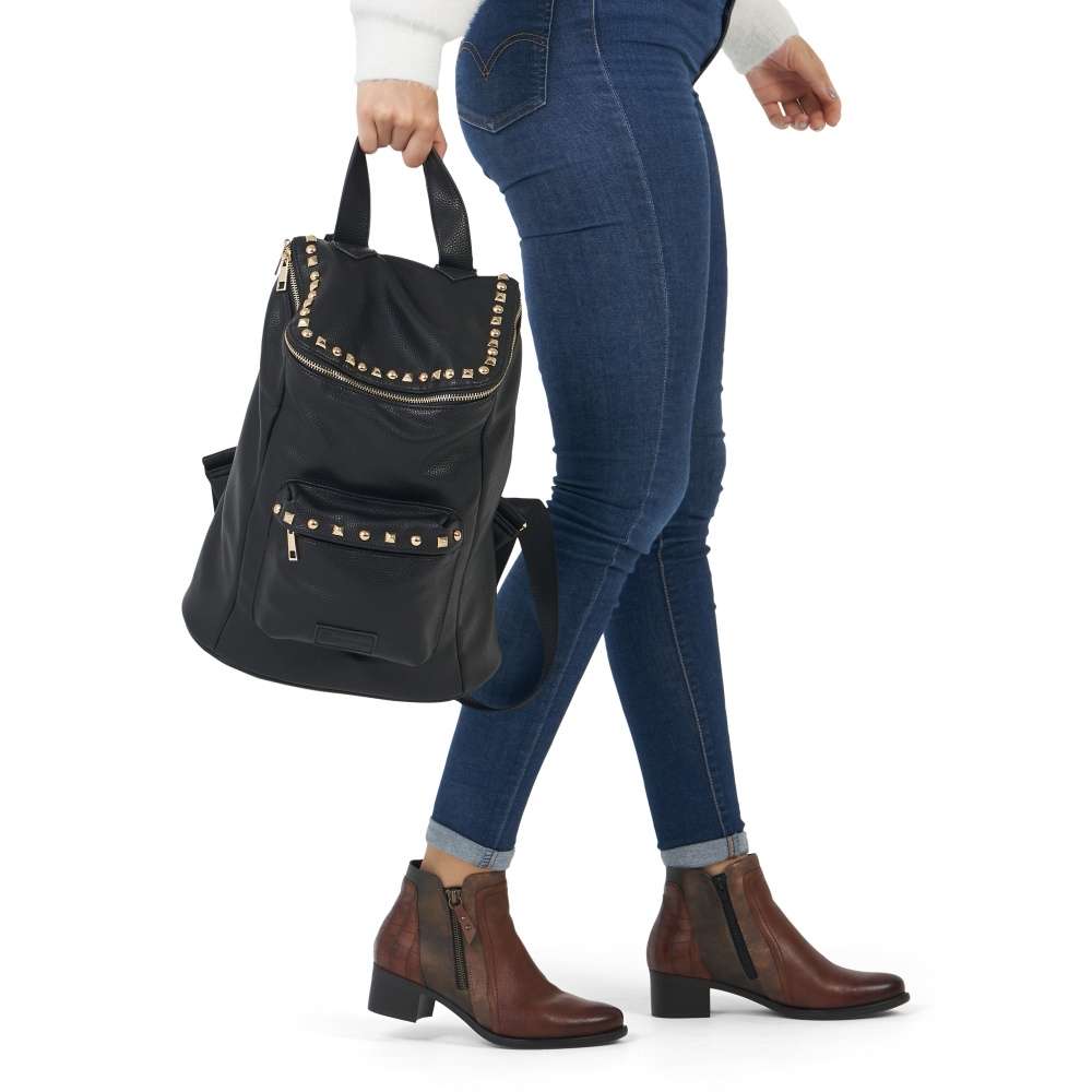 Detailní informace Tento originální batoh značky Remonte (je vyšší řadou značky Rieker) Vás díky své jedinečnosti zaujme hned na prví pohled. Jeho černý svršek zdobí zlaté kovové cvočky a malá kapsička uzavíratelná na zip, do které můžete schovat své drobnosti. V hlavním úložném prostoru jsou další menší kapsičky. Batoh má dva dálkově nastavitelné popruhy pro nošení na zádech i ucho pro přenášení v ruce. Tento baťůžek je nádherným doplňkem a funkčním pomocníkem na Vašich cestách.
