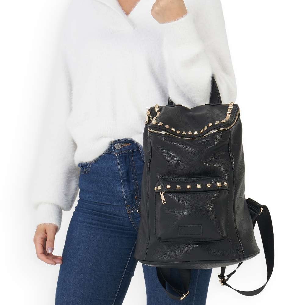 Tento originální batoh značky Remonte (je vyšší řadou značky Rieker) Vás díky své jedinečnosti zaujme hned na prví pohled. Jeho černý svršek zdobí zlaté kovové cvočky a malá kapsička uzavíratelná na zip, do které můžete schovat své drobnosti. V hlavním úložném prostoru jsou další menší kapsičky. Batoh má dva dálkově nastavitelné popruhy pro nošení na zádech i ucho pro přenášení v ruce. Tento baťůžek je nádherným doplňkem a funkčním pomocníkem na Vašich cestách. Rozměry: cca v 31cm x š 36cm