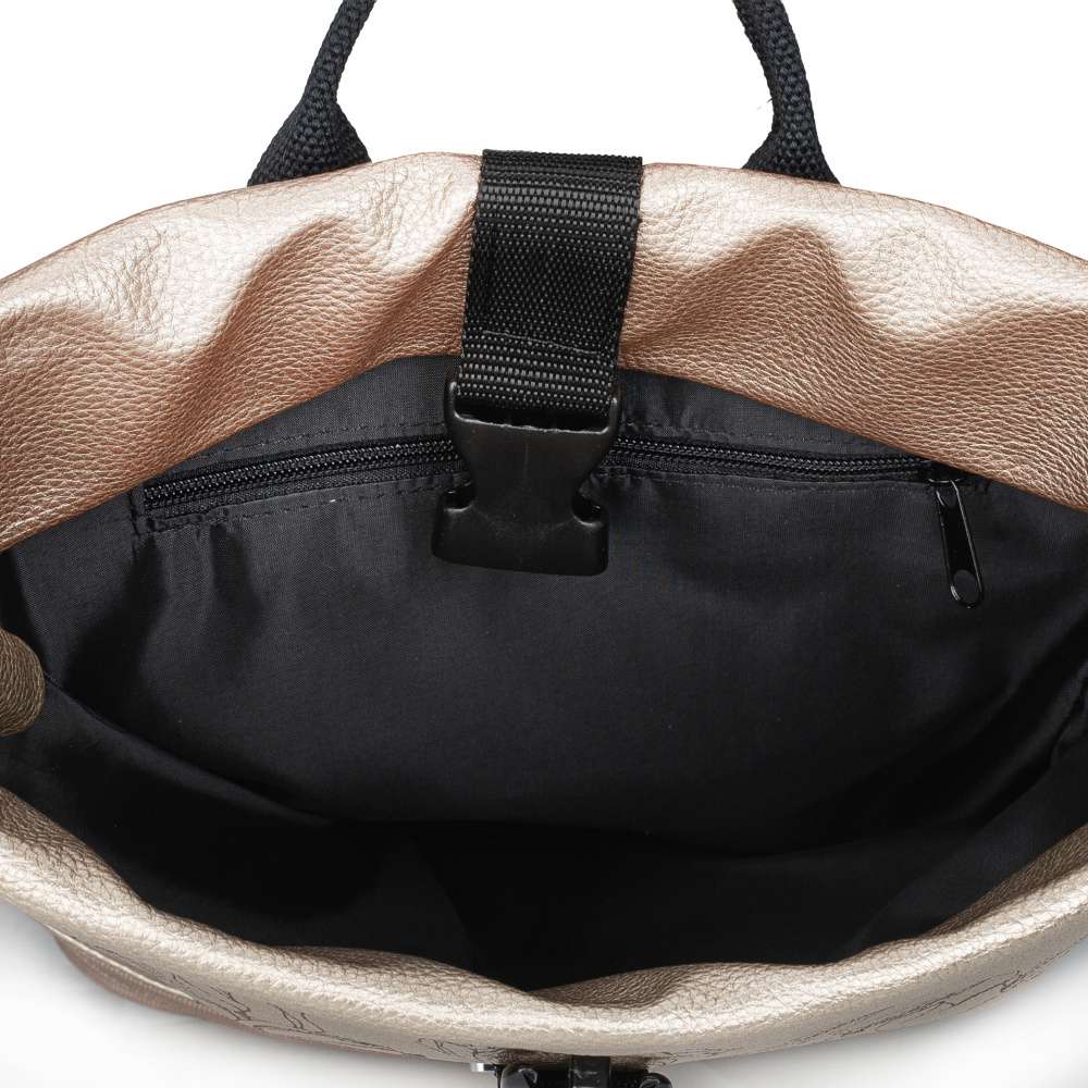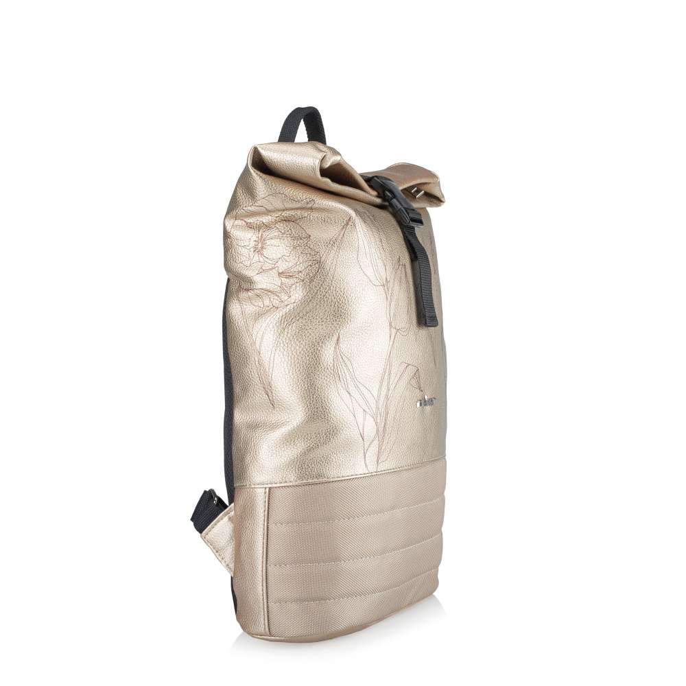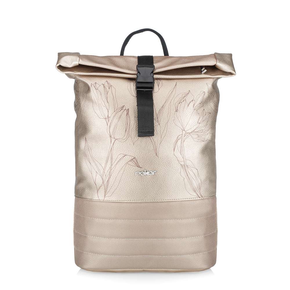 Nechte se unést kouzlem detailů, které dělají tento batoh RIEKER opravdu výjimečným. Efektní kombinace materiálů s jemnými zlatými odlesky ve spojení s unikátním potiskem tulipánů vytváří doslova malý módní šperk, který rozzáří každý váš outfit a dodá mu nezaměnitelný charakter. Precizní prošívání spodní části dodává batohu hloubku a stříbrné logo značky působí jako jemný podpis originality. Promyšlené řešení úložného prostoru vám zpříjemní každý den. Zadní kapsa na zip, kopírující velikost batohu, bezpečně uschová vaše dokumenty či cennosti. Hlavní komora uzavřená zipem a sponou poskytuje dostatek místa na vše, co potřebujete mít po ruce, zatímco menší vnitřní kapsy udrží vaše drobnosti dokonale uspořádané. Nastavitelné popruhy se přirozeně přizpůsobí vaší postavě a zajistí maximální pohodlí při nošení na zádech, zatímco krátký úchyt umožní nošení v ruce. Tento batoh RIEKER je dokonalým spojením stylu a praktičnosti – doplněk, který vás bude provázet každý den a dodá vašemu outfitu jiskru originality a ženského půvabu.