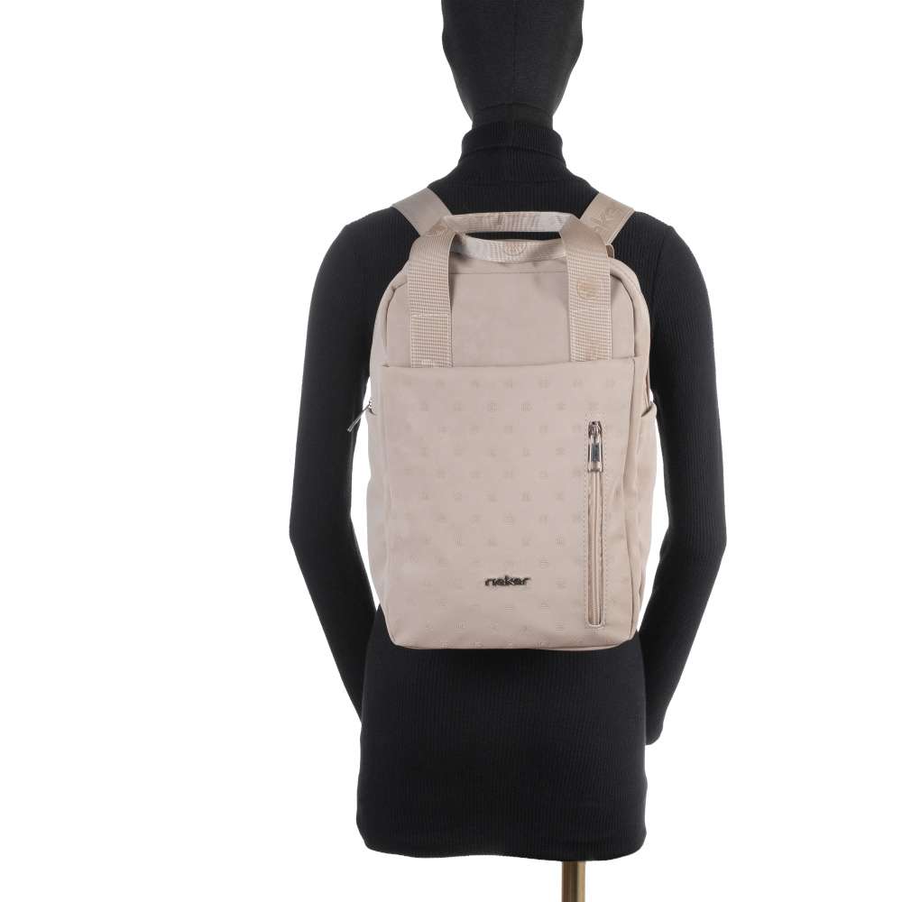 Batoh značky RIEKER v jemném odstínu zaujme okouzlujícím vzorem, který mu dodává stylový vzhled. Přední část zdobí stříbrné logo značky, které podtrhuje originalitu celého designu. Nejen vzhled je dokonale propracovaný, ale také praktické využití je dokonale vyřešeno. Na přední straně najdete kapsu s magnetickým klipem a menší kapsu na zip, ideální pro uložení drobností. Zadní část batohu je také vybavena praktickou kapsou, zatímco postranní kapsy umožňují rychlý přístup k nezbytnostem. Po rozepnutí vrchního zipu se dostanete do hlavního prostoru, který zahrnuje dvě menší kapsy pro dokonalou organizaci vašich věcí. Batoh má dva krátké úchyty pro pohodlné nošení v ruce, které navíc svým dekorem nápisem RIEKER zvýrazní jedinečnost tohoto modelu a komfortní nošení na zádech zajistí nastavitelné popruhy. Tento batoh RIEKER je ideálním doplňkem pro ženy, které milují praktičnost ve spojení s nápaditým designem a chtějí mít své věci vždy stylově uspořádané – ať už na procházce městem, cestováním nebo ve volném čase.