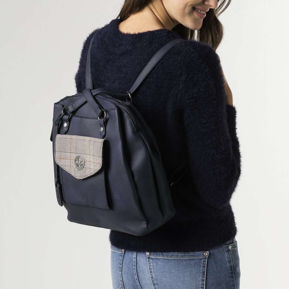 Tento jednoduchý dámský batoh tmavě modré barvy je zdobný károvou klopou s kovovým logem na přední kapsičce. Tento batůžek bude Vaším výjimečným doplňkem k různým outfitům.