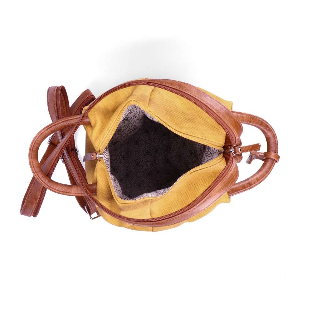 U horního okraje má batoh zip, po jehož rozepnutí se otevře vnitřní kapsa, kde na jedné straně je kapsa na zip a na druhé pak dvě kapsy na drobnosti.