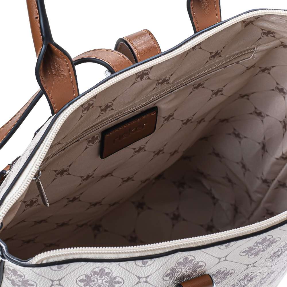Jednoduchý světlý svršek doplněný hnědými doplňky je zdoben potiskem logem značky a na přední straně kovovým nápisem Rieker.