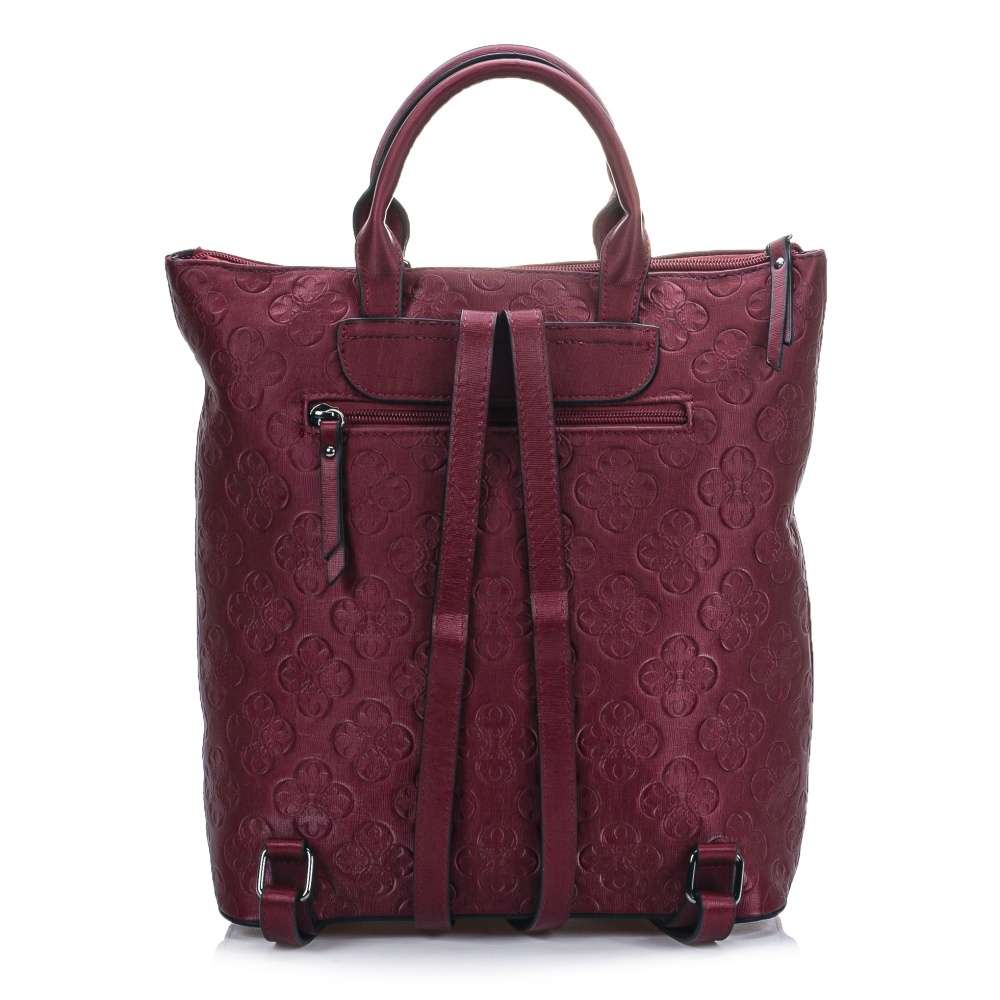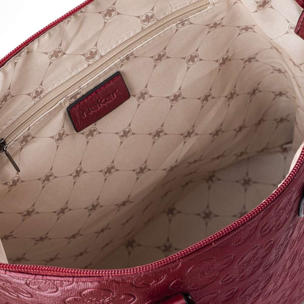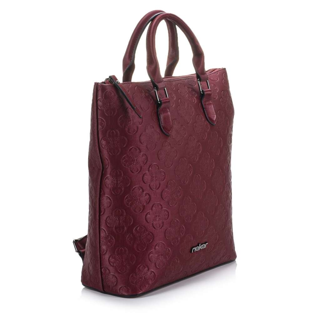 Tento dámský batoh od značky Rieker má svršek v tmavě červené barvě. Na první pohled Vás zaujme svým vytlačeným vzorem, který dodává ten správný šmrnc. Ze zadní strany Vás určitě potěší malá kapsička na drobnosti. Uzavírá se zipem, po jehož rozepnutí se Vám nabízí několik dalších kapes například na mobil nebo klíče. Má dvě ucha, ale také dva velikostně regulovatelné zadní popruhy, které si můžete nastavit dle svých představ. Poslouží Vám jako skvělý doplněk do města na nakupování s kamarádkou.
