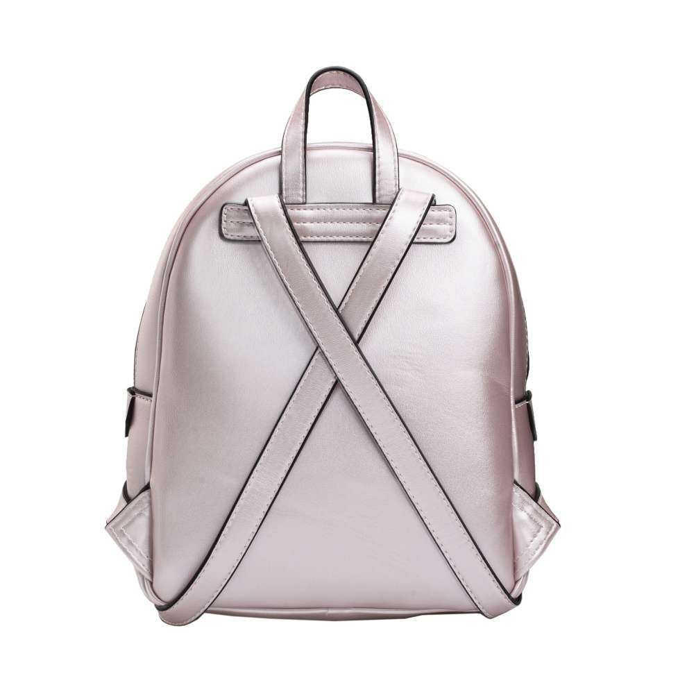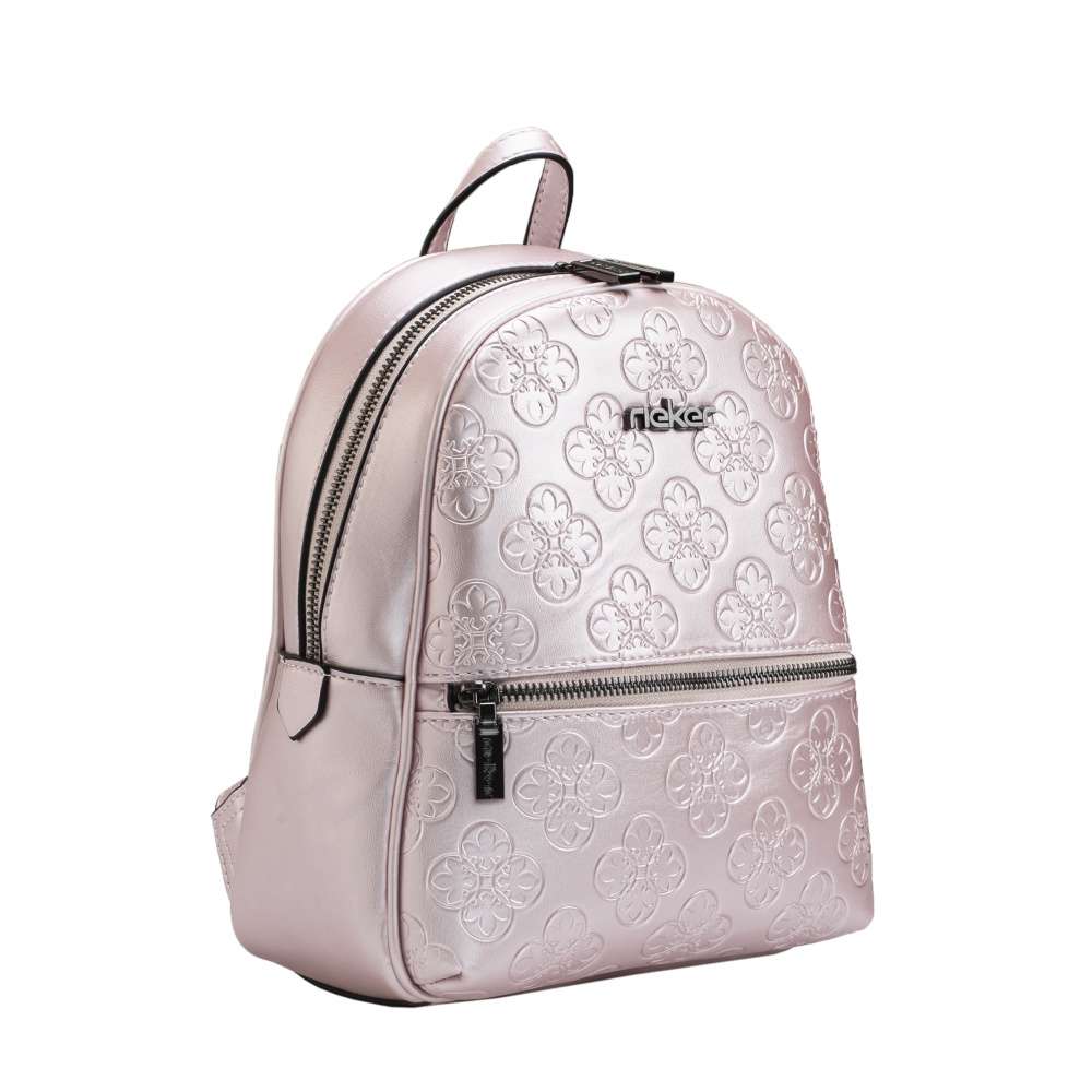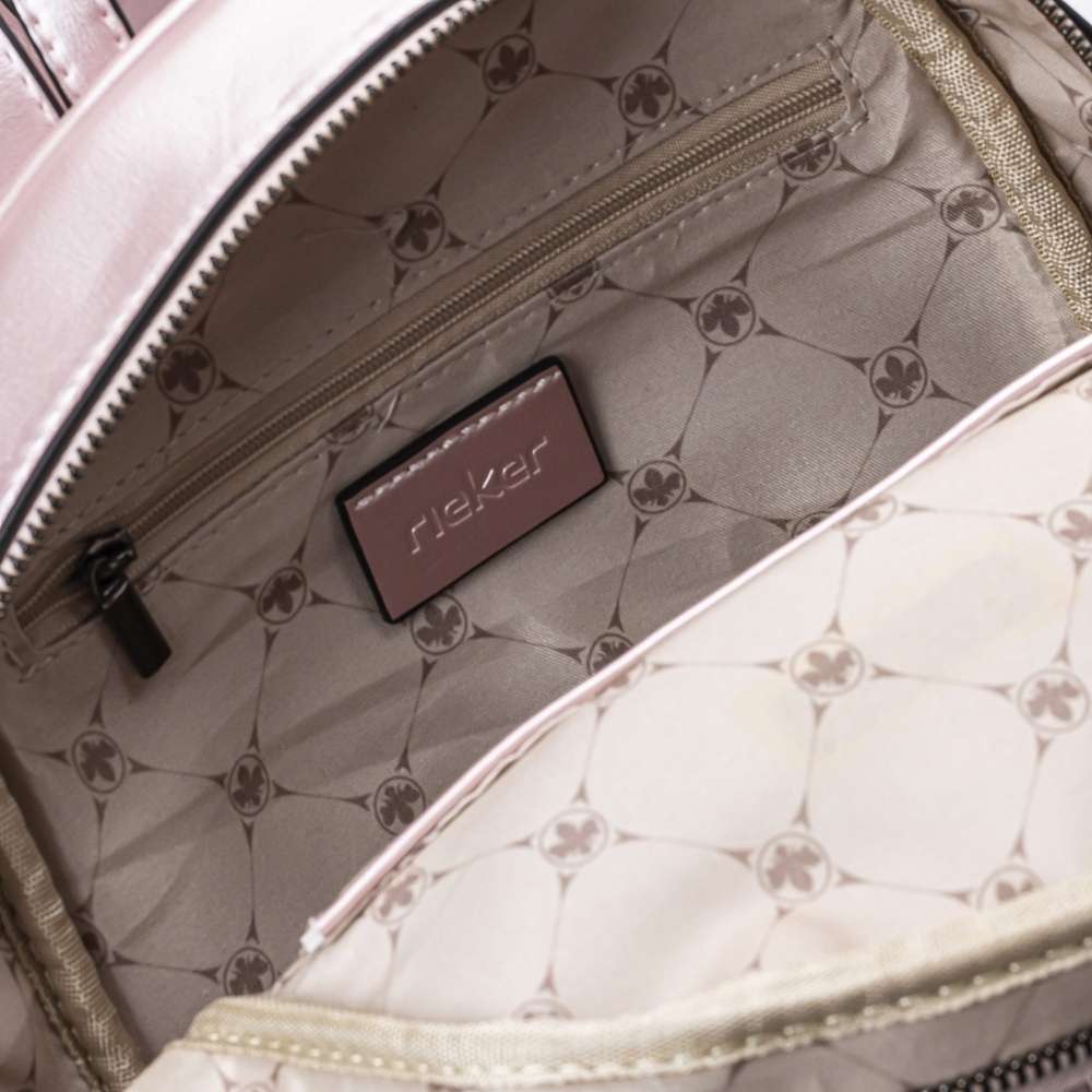 Menší dámský batoh od značky Rieker si oblíbíte díky krásném metalickém svršku v růžové barvě. Elegantní vzhled vytváří hladký materiál a vytlačený vzor z přední strany. Batoh se uzavírá zipem, po jehož rozepnutí naleznete několik dalších kapes například pro Váš mobil a klíče. Má ucho, ale také dva velikostně regulovatelné zadní popruhy, které si můžete nastavit dle svých představ. Bude Vašim báječným doplňkem k různým outfitům. Rozměry: cca v 27 cm x š 22 cm Vnitřní uspořádání: batoh není dělený