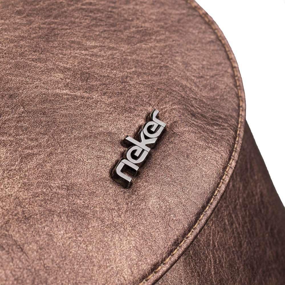 Jednoduchý hnědý svršek doplněný kovovými doplňky je zdoben zipem na přední straně i nápisem Rieker.