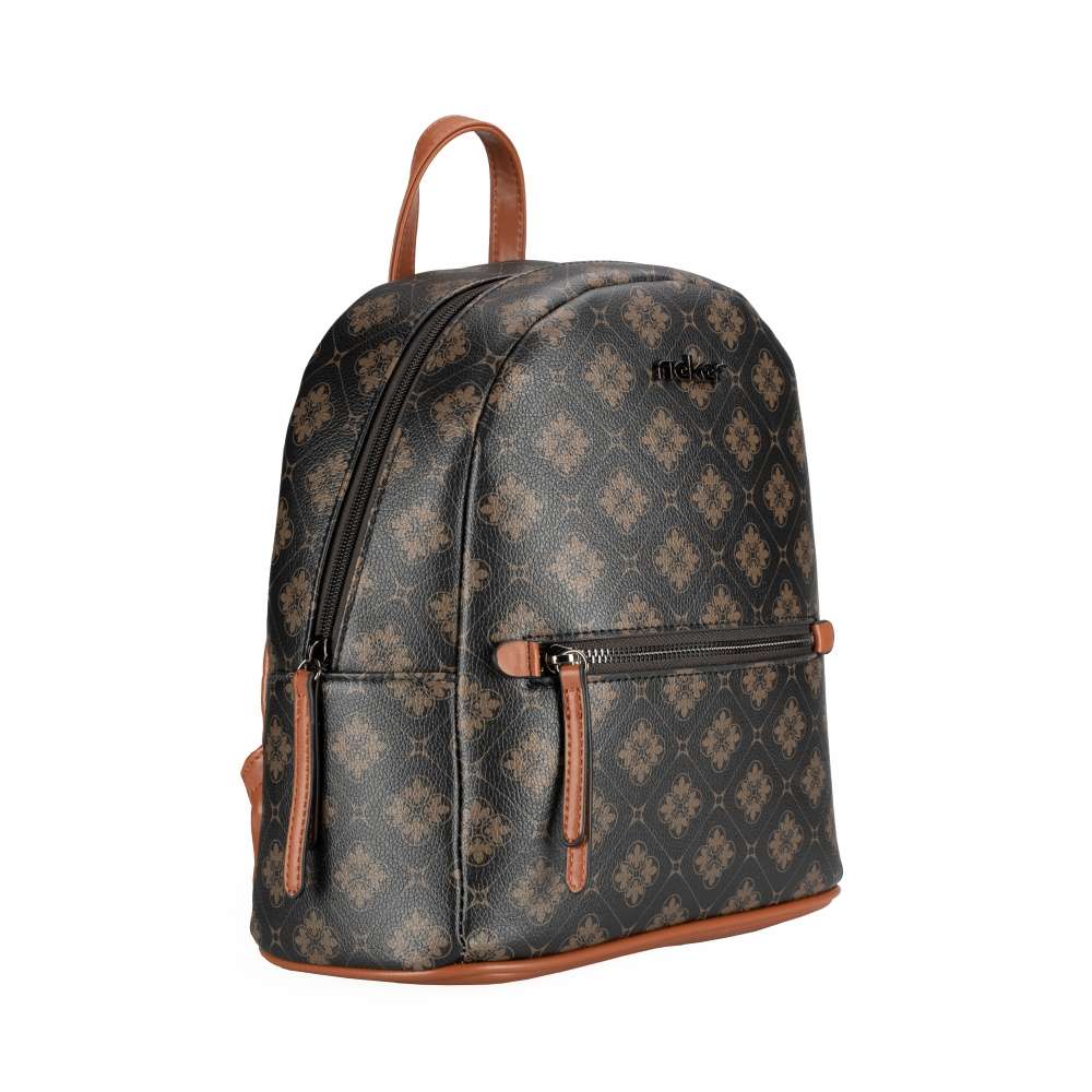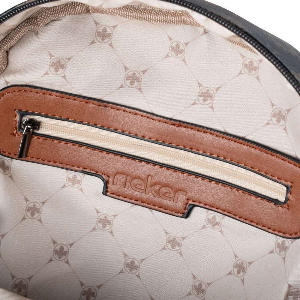 Tento dámský batoh od značky Rieker má svršek v černé barvě s hnědými detaily. Je také obohacen kontrastním vzorem, který dodává ten správný šmrnc. Na přední straně Vás jistě potěší kapsička pro drobnosti. Batoh se uzavírá zipem, po jehož rozepnutí naleznete několik dalších kapes například pro Váš mobil a klíče. Má ucho, ale také dva velikostně regulovatelné zadní popruhy, které si můžete nastavit dle svých představ. S tímto skvělým kouskem zaujmete už na první pohled, bude Vám dělat skvělého společníka při různých příležitostech. Rozměry: cca v 29 cm x š 27 cm Vnitřní uspořádání: batoh není dělený