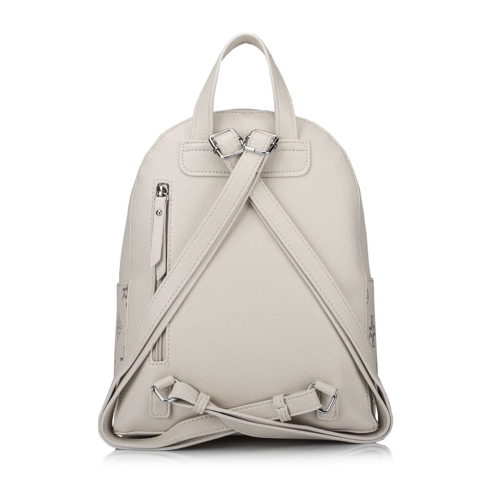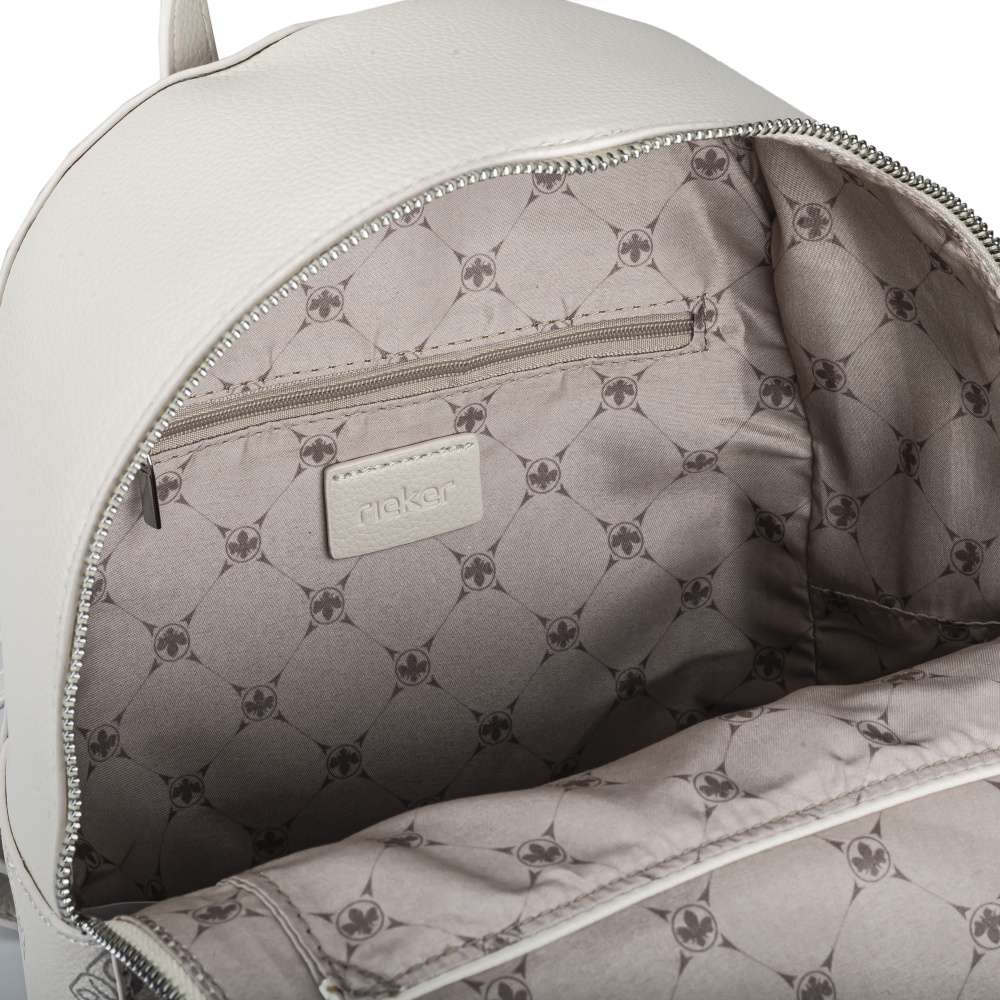 Stylový dámský batůžek značky RIEKER, je to pravé, co potřebuje každá žena ve svém šatníku. Na přední straně svršku jsou po celém obvodu loga značky a stylové ozdoby připomínající květinky. Na zádech má model malou kapsičku, a když otevřeme velkou kapu, najdeme další dvě kapsy na drobnosti. Jedna je na zip, může sloužit na klíče a druhá je bez zavírání. Batoh bude skvělou volbou pro dámy, které se chtějí cítit pohodlně po celý den.