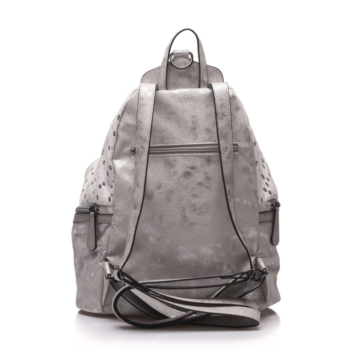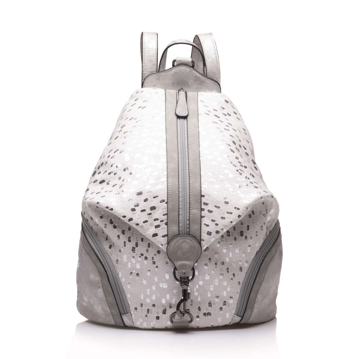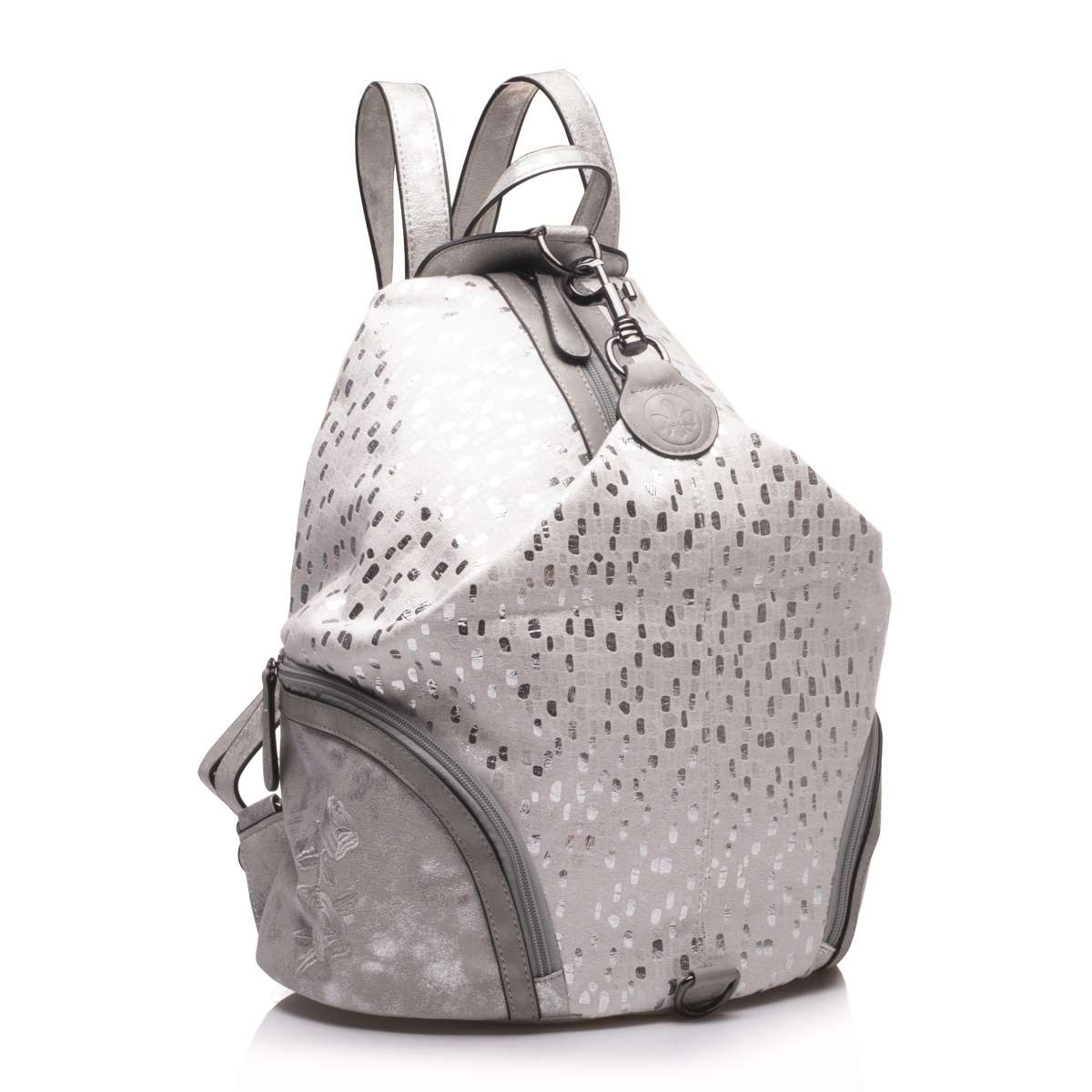 Tento stylový batoh od značky Rieker s šedými detaily je navíc zpestřený lesklým a metalickým třpytem na světlém podkladu. Má praktické boční kapsy s decentní výšivkou ve tvaru růže a funkční karabinu.