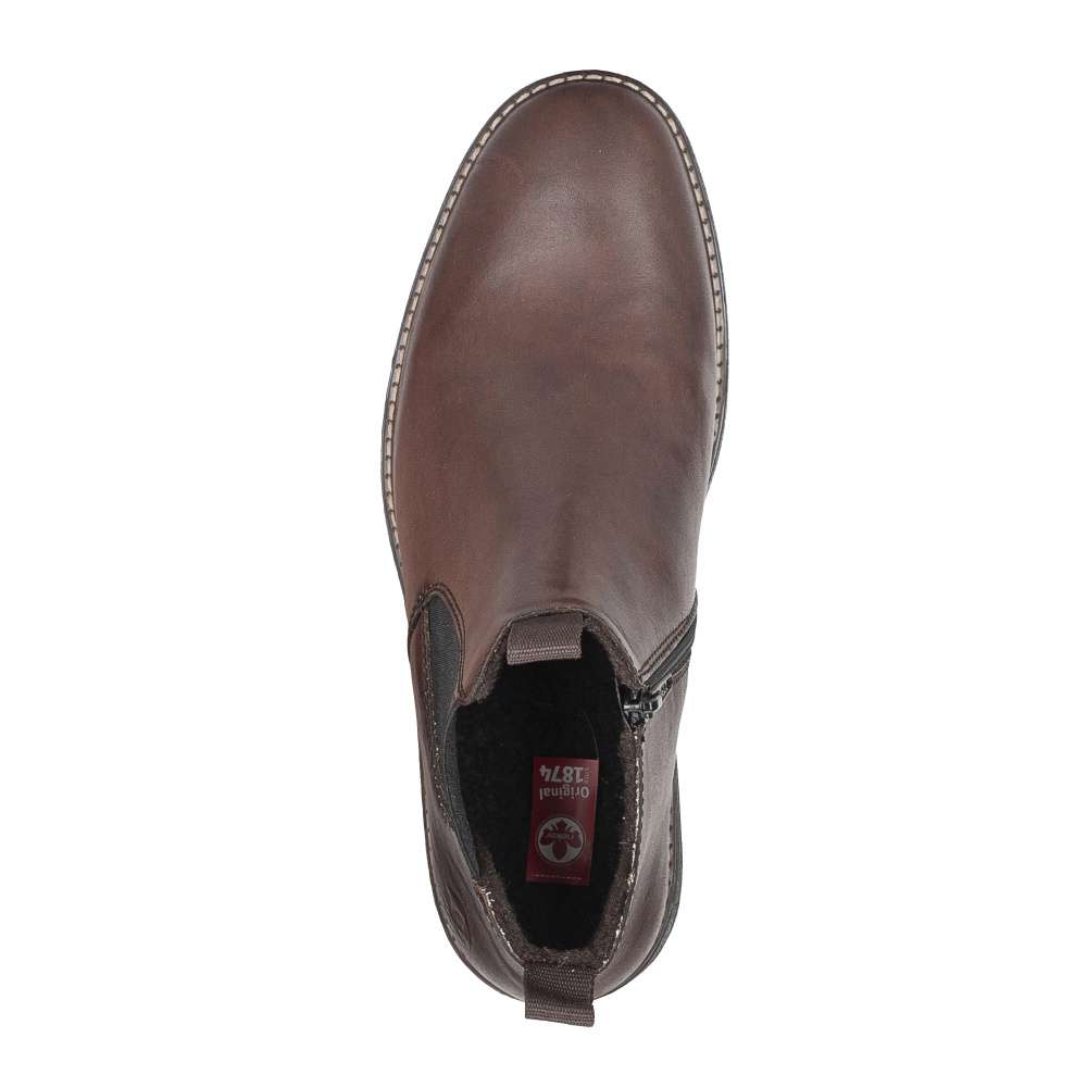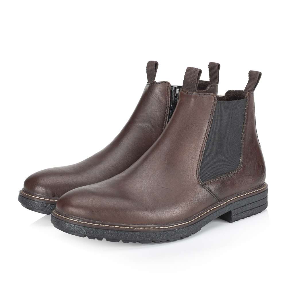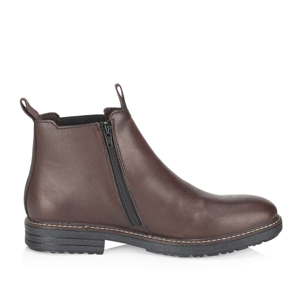 Detailní informace Exkluzivní pánská obuv RIEKER se dvěma poutky při horním okraji v nádherném hnědém provedení. Vrchní materiál je vyroben z hladké přírodní usně decentně ozdobený prošíváním a vytištěným logem. K obouvání Vám skvěle napomůže funkční zip a pružná gumička na vnější straně. S měkkou stélkou a hrubší podešví se můžete těšit na pohodlnou a komfortní chůzi po celý den nošení. Tyto boty budou skvěle ladit ke kabátu jakékoli barvy.