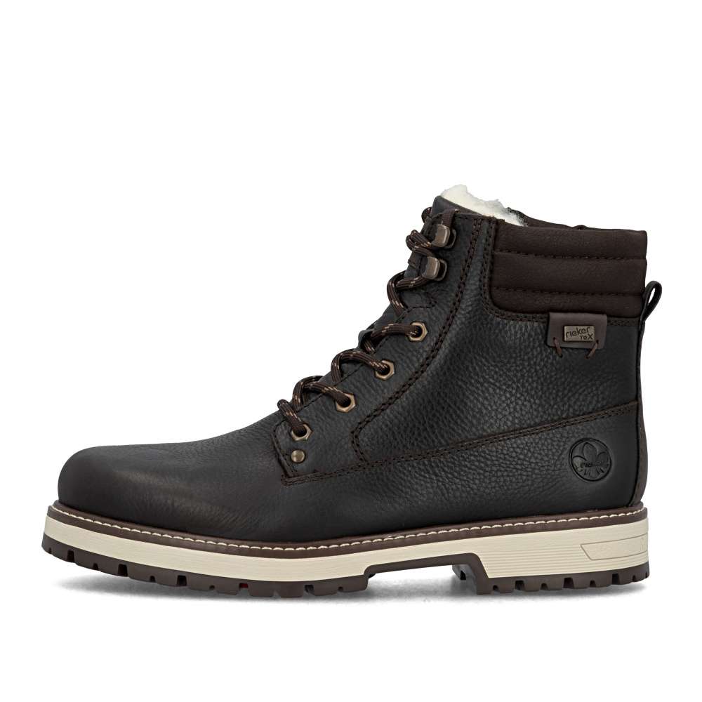 Tento trendy model pánské zimní kotníkové obuvi značky Rieker Vás jistě zaujme nejen svým vzhledem, ale také funkčností. Hladký kožený svršek v hnědé barvě je doplněn o prošitý lem horního okraje, který dokonale doplňuje jejich vzhled. Pohodlí a sucho při nošení Vám zaručí kombinace speciální membrány s technologií TEX, podšívka vyteplená hřejivou ovčí vlnou a měkká vyjímatelná stélka. Šňůrky ve spojení s funkčním zipem usnadní obutí a přizpůsobení si boty přímo na nohu. Unikátní prvek RIEKER Grip v podešvi zabrání uklouznutí a Váš krok bude stabilní v mrazu i sněhu díky němu. V tomto kousku budete vypadat stylově za každé situace, a zároveň si budete připadat chráněni před nepřízní počasí. Technologie: Antistress - podešev je díky této technologii lehká, flexibilní a absorbuje nárazy při došlapu a snadno se přizpůsobí každé noze. Rieker TEX - funkční vrstva, díky které je bota nepromokavá a přesto prodyšná. RiekerGrip – dvoupolohový bezpečnostní systém s hroty pro chůzi na kluzkém povrchu a ledě. Pro správnou funkci je třeba udržovat podrážku čistou. Podšívka je vyrobena z pravé ovčí vlny. Tato bota je vybavena vyjímatelnou stélkou.