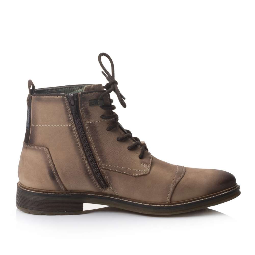 Pánské kožené kotníky, značky BUGATTI. Svršek Světlý svršek se stínováním má elegantní prošívání, vytlačený název značky a na zadní části textilní designovou vsadku s logem. Z vnitřní strany je všitý zip, který Vám usnadní obutí. Kontrastní textilní podšívka je lehce hřejivá, takže v tomto modelu můžete vyrazit i v chladnějším počasí. Stélka Vyjímatelná stélka je opatřena technologií Air Clima Comfort díky níž se budete cítit pohodlně a v suchu při každém nošení. Podešev Podešev z kvalitní syntetiky s decentním vzorkem zabrání uklouznutí. Tyto pohodlné kotníkové boty využijete do práce i do města. Technologie: Air Clima Comfort Vyjímatelná stélka: ANO