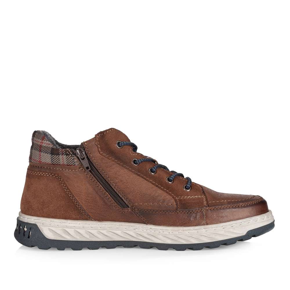 Pánská ležérní obuv s károvaným lemem a designovými prvky bude tím pravým kouskem do Vašeho botníku. Svrchní materiál hnědé barvy je vyroben kombinací textilu a pravé přírodní usně. Šněrováním si obuv můžete upravit přesně podle Vašich představ a funkční zip na vnitřní straně skvěle napomůže při nazutí. Hřejivá textilní podšívka s pohodlnou stélkou se postarají o komfort při celodenní chůzi. Kvalitní podešev se vzorkem zabrání uklouznutí a zajistí Vám pocit bezpečí. Tento stylový model můžete obout snad k jakékoliv příležitosti.