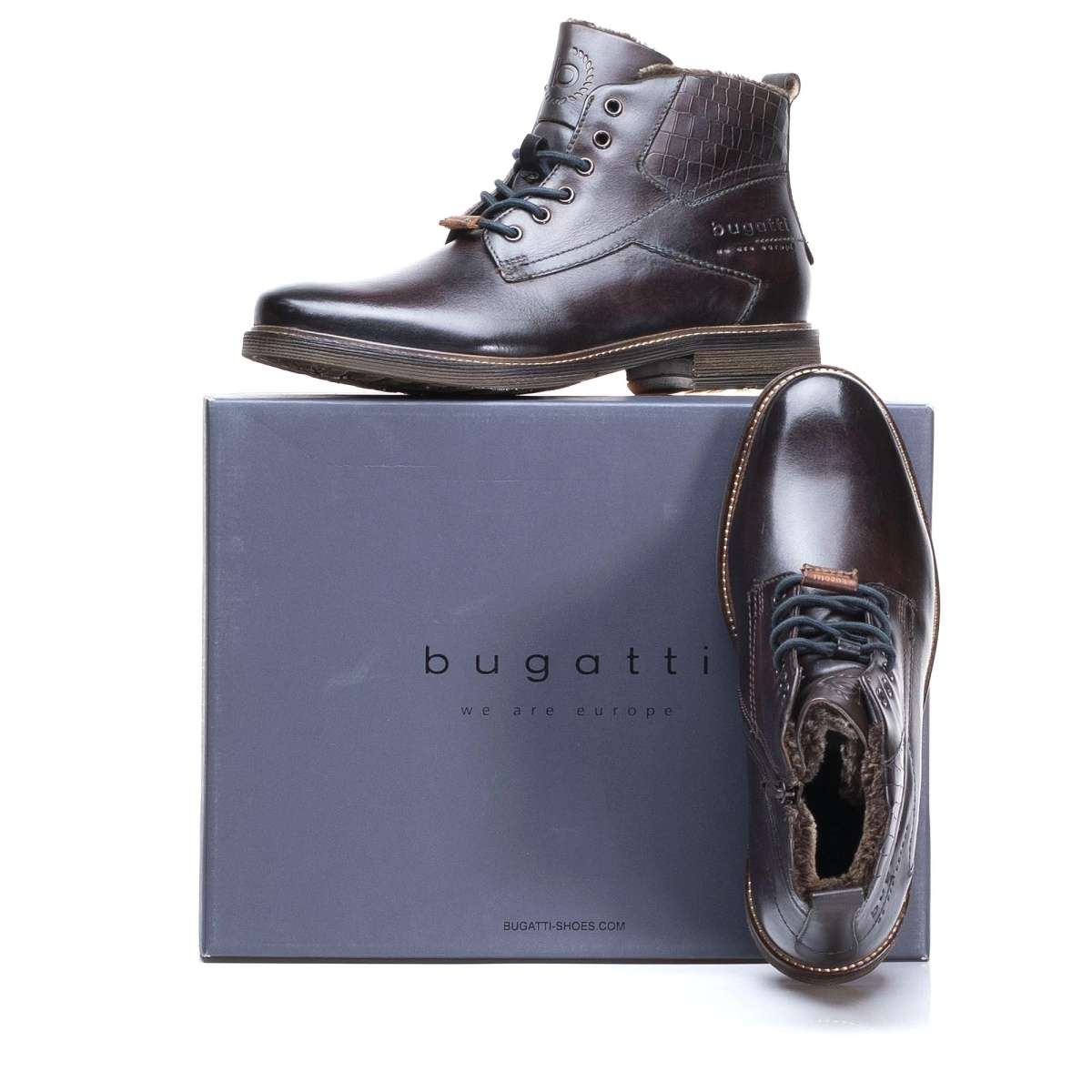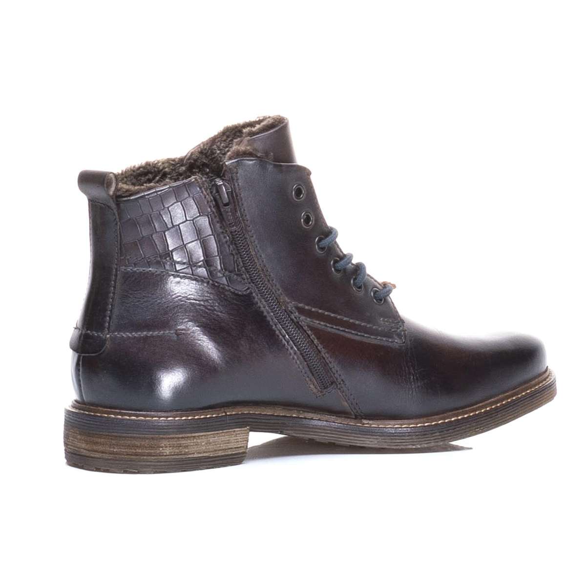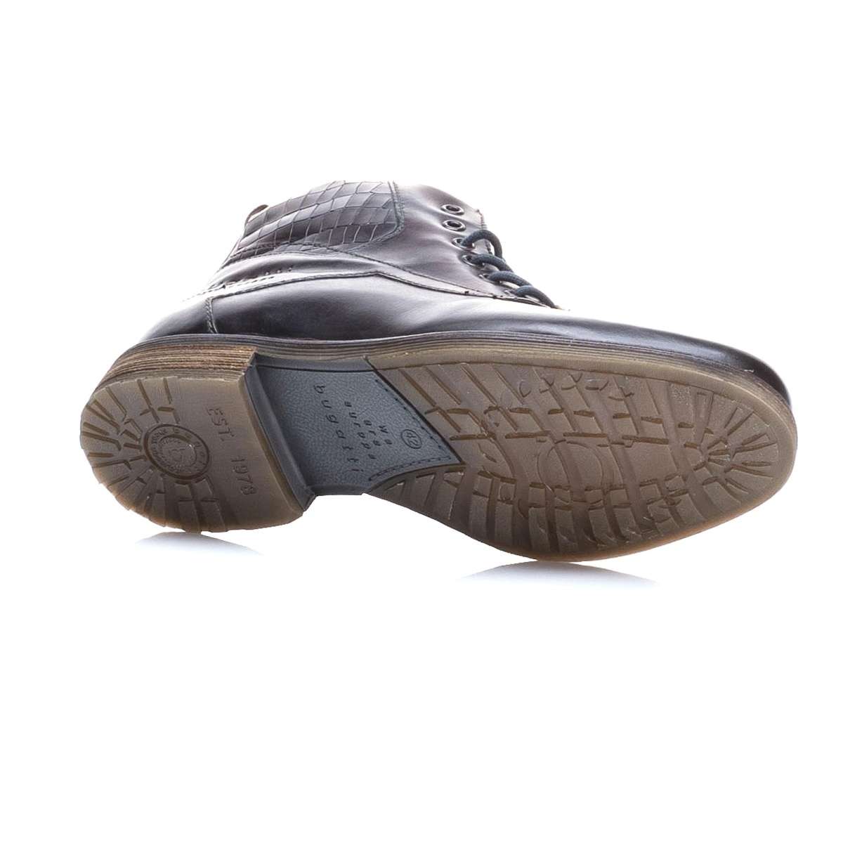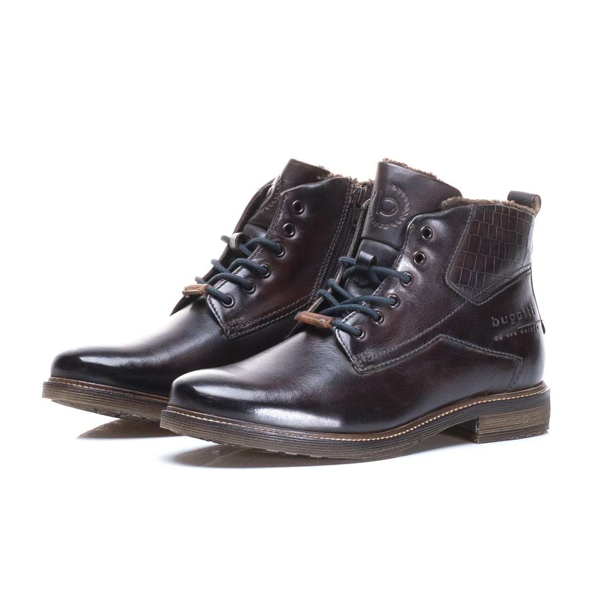 Kožené kotníkové boty pro stylového muže ke každodenním pochůzkám městem. Mají hladký povrch, kulatou špičku a zdobným prvkem je kožená nášivka na tkaničkách s nápisem Bugatti a kontrastní šití po obvodu podešve. Šněrováním si obuv upravíte dle vlastních požadavků a o snadné nazouvání se postará funkční zip na vnitřní straně. Tyto kotníky budou skvěle vypadat s jeansy a péřovou bundou při Vašich procházkách městem.