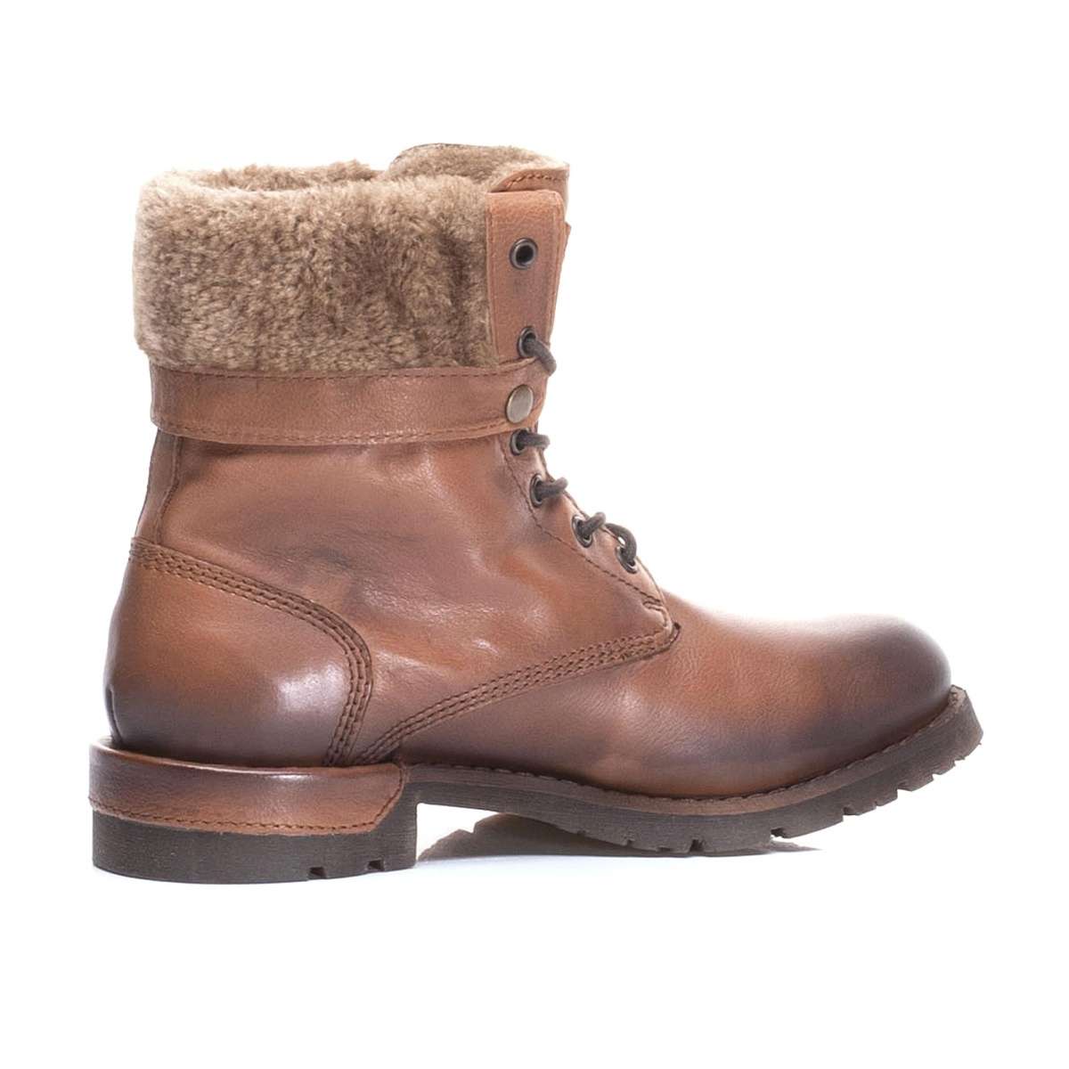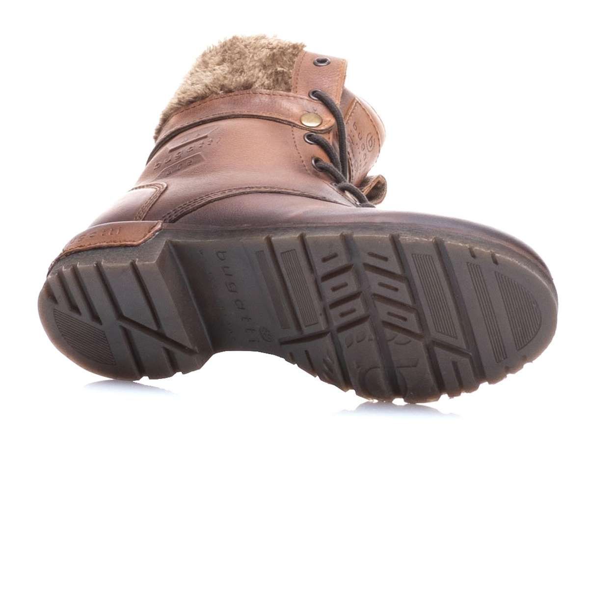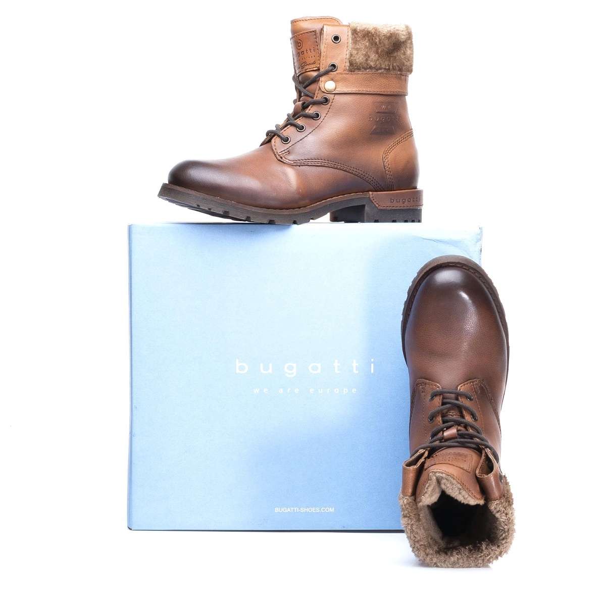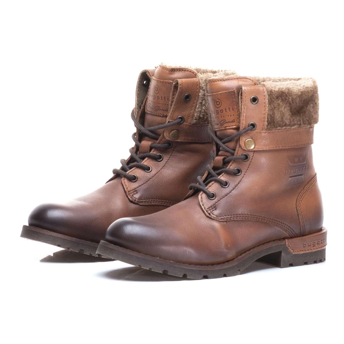 Kožená obuv v hnědé barvě značky Bugatti s kožíškovým lemem horního okraje a logem značky na vnější straně. Tkaničky na šněrování slouží pro lepší přizpůsobení přímo na Vaši nohu a prošívání dolaďuje celkový vzhled obuvi. Tyto stylové boty se budou hodit snad ke každému Vašemu outfitu.