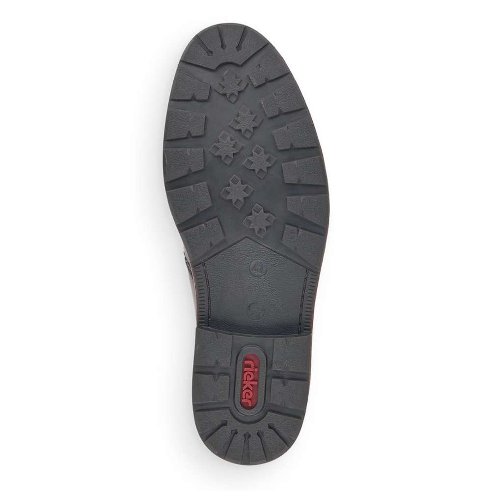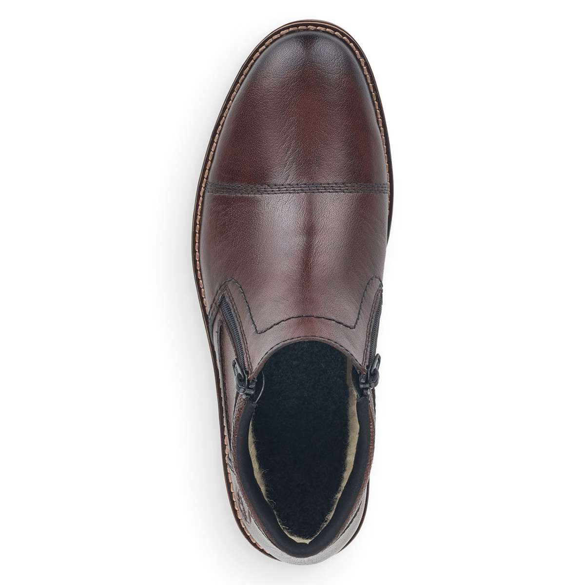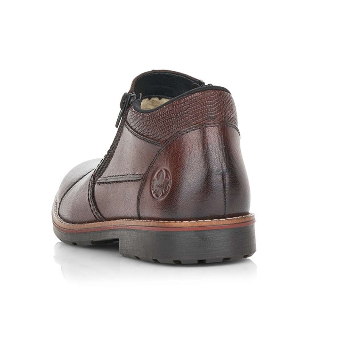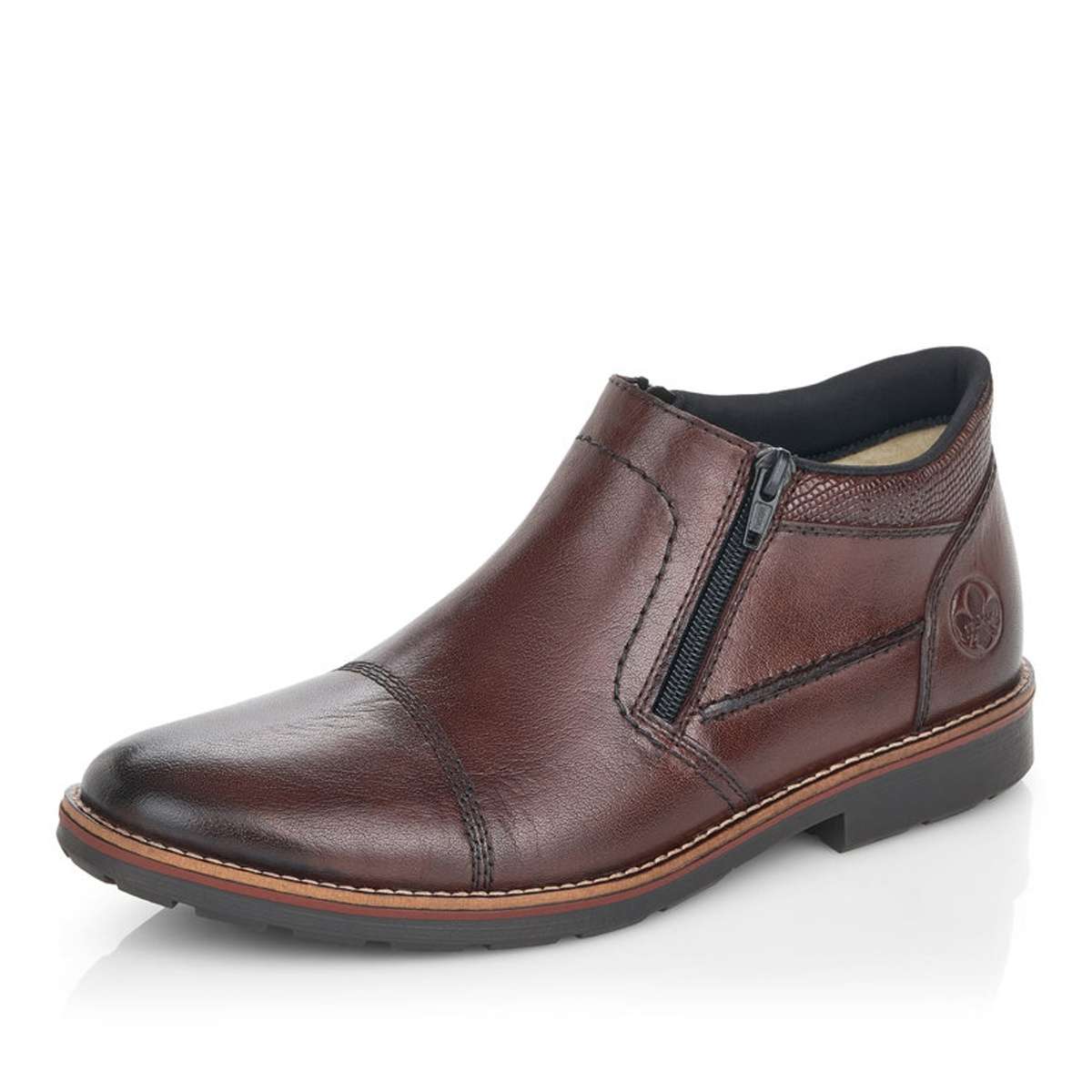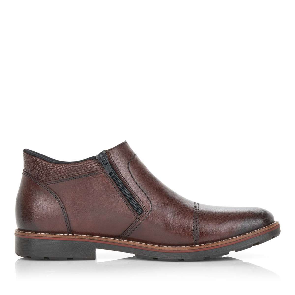 Pánská kotníková obuv z hnědé přírodní usně zaujme především svým výrazným prošitím a decentním logem značky Rieker. Po stranách jsou použity funkční zipy pro snadné obutí.