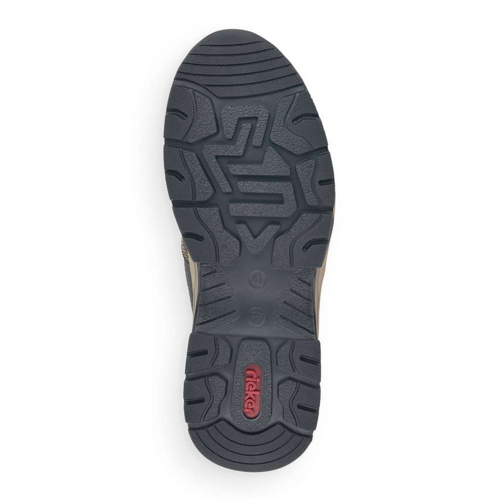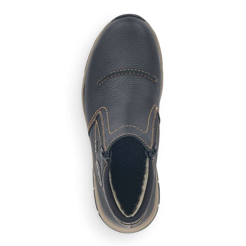 Černý kožený svršek je ozdoben kontrastním prošíváním, logem značky a po stranách funkčními zipy, které Vám umožní snadné nazouvání. Funkční vrstva Rieker TEX činí botu nepromokavou přesto prodyšnou.