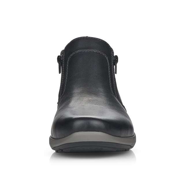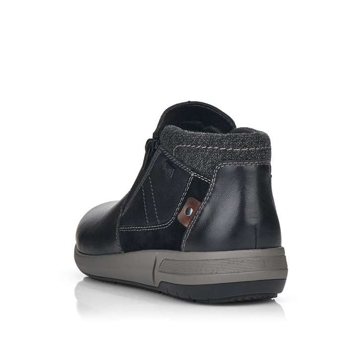 Černý hladký svršek vyrobený z pravé kůže je ozdoben nejen prošíváním, které vytváří na obuvi zajímavé linie, ale také textilním lemem horního okraje obuvi či kontrastním hnědým prvkem. Díky použité funkční vrstvě Rieker TEX se budete cítit příjemně i v nepříznivém počasí. Funkční zipy po stranách obuvi Vám umožní snadné nazouvání.