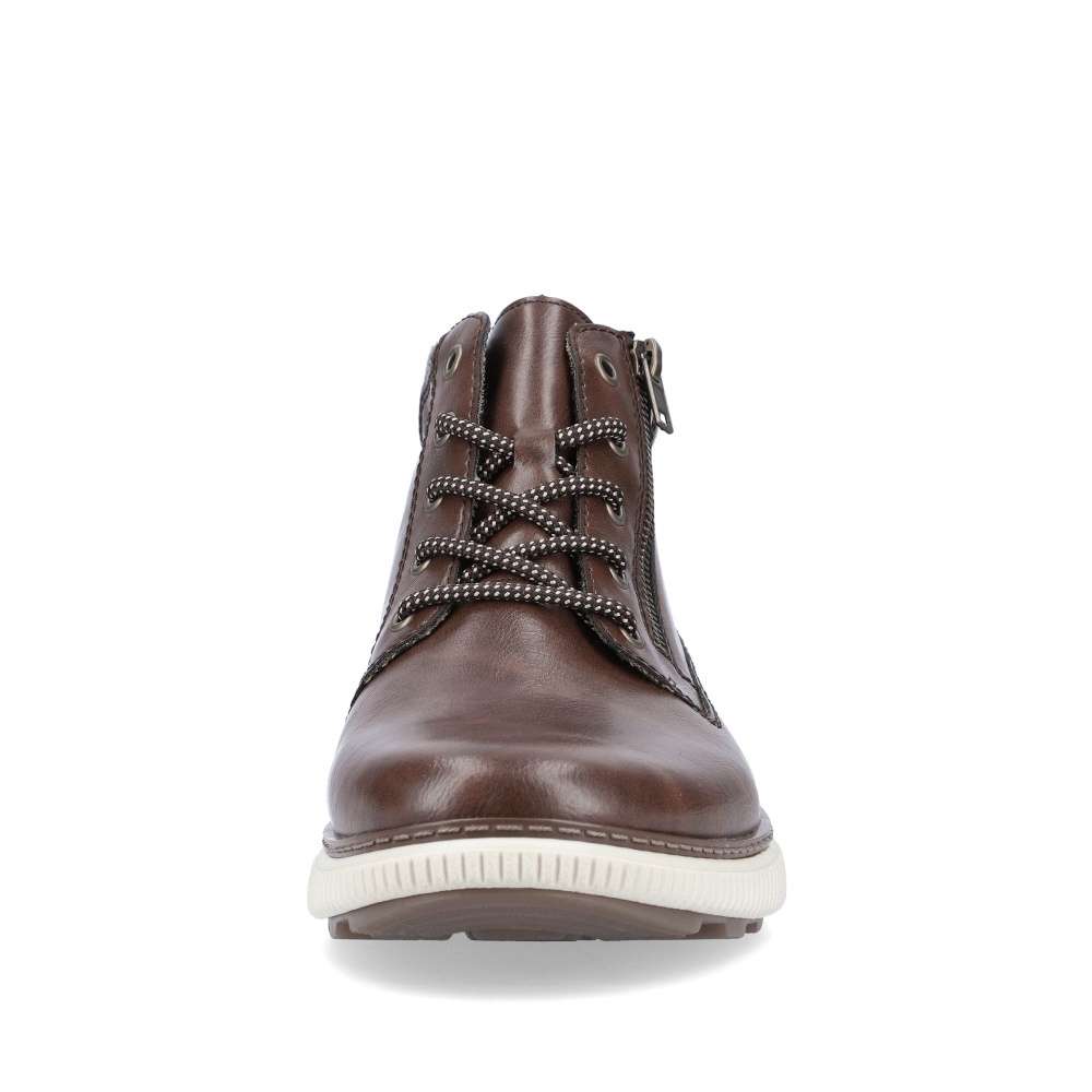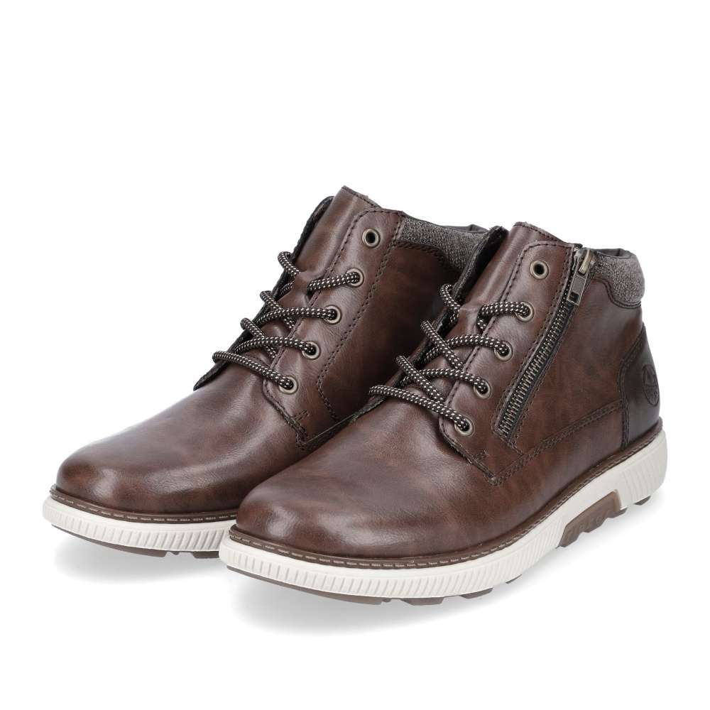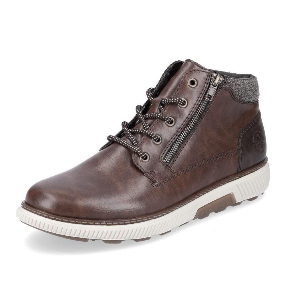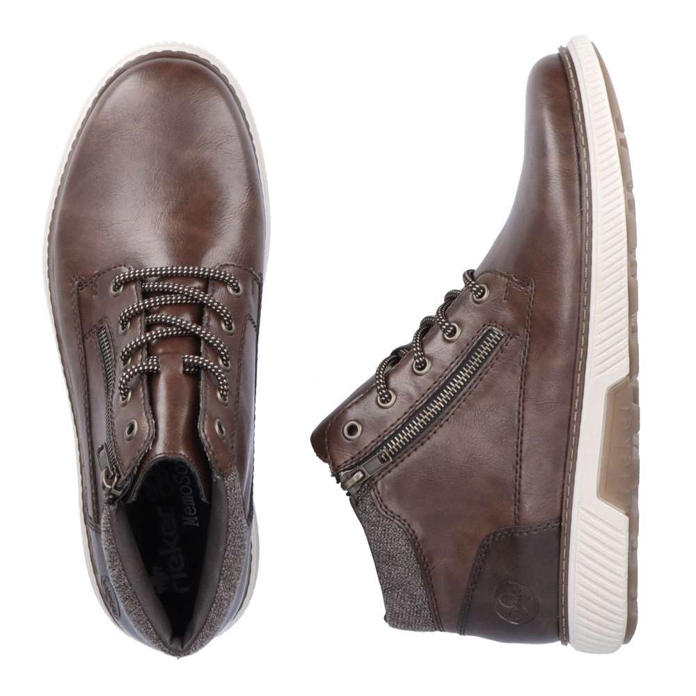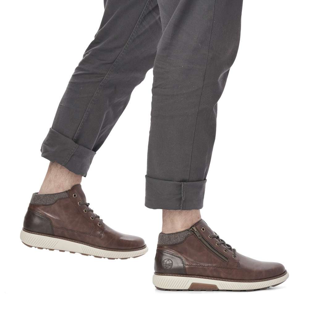 Detailní informace Sportovní kotníková pánská teniska značky RIEKER, je nezaměnitelnou součástí každého muže. Krásná hnědá barva, funkční zip, podešev s technologií antistress, to vše u této pánské sportovní obuvi najdete. Šněrování a zip zajistí lepší nazouvání a kontrastní podešev jistotu při každém Vašem kroku. K jeansům a sportovnímu kabátku bude tato obuv vždy vypadat skvěle.