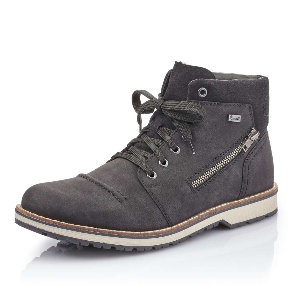 Obuv v šedé barvě značky RIEKER je jemně prošita a obohacena zdobným zipem po boku, má také designový textilní lem v horním okraji. Boty jsou navíc vybavené funkční vrstvou, díky které jsou nepromokavé, a přesto prodyšné. Tkaničky na šněrování slouží pro lepší přizpůsobení přímo na Vaši nohu. Skvěle je využijete například na procházku zimní krajinou.