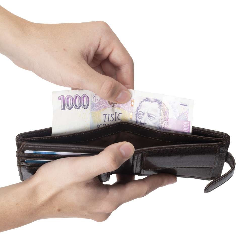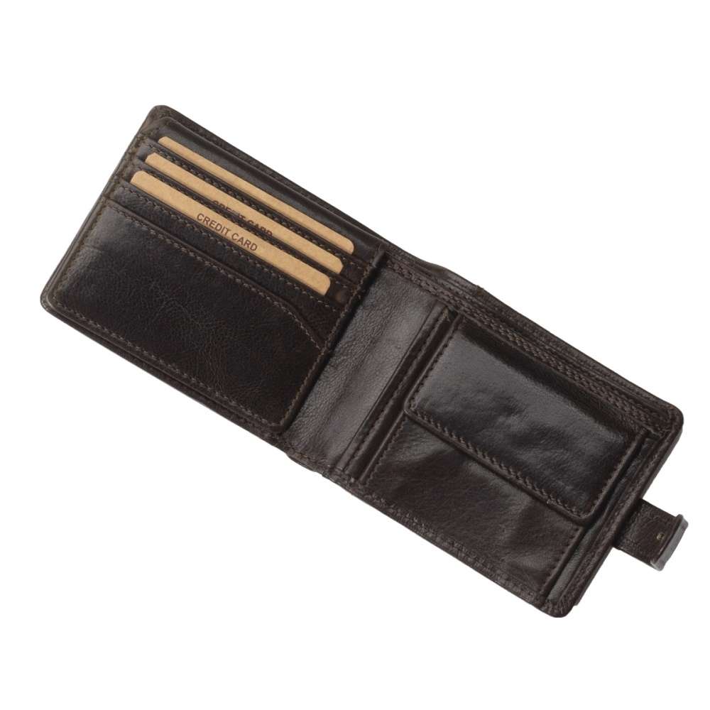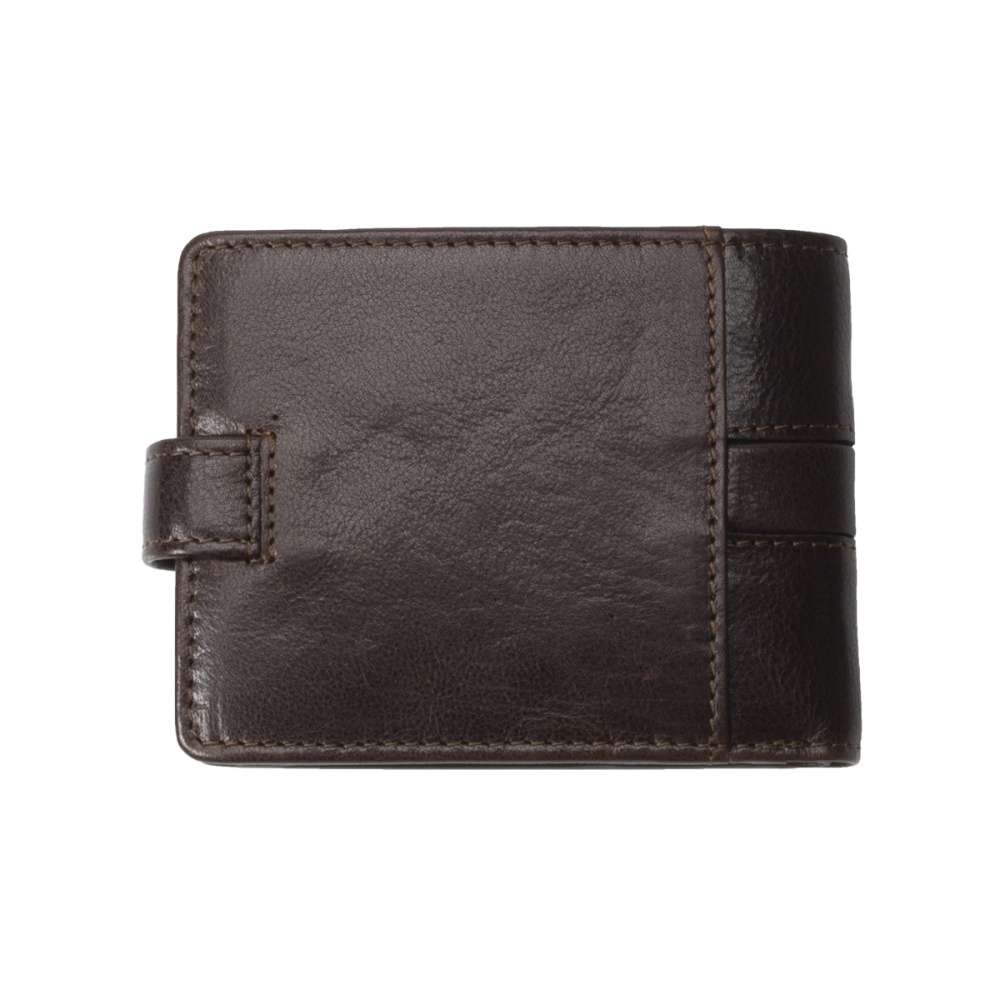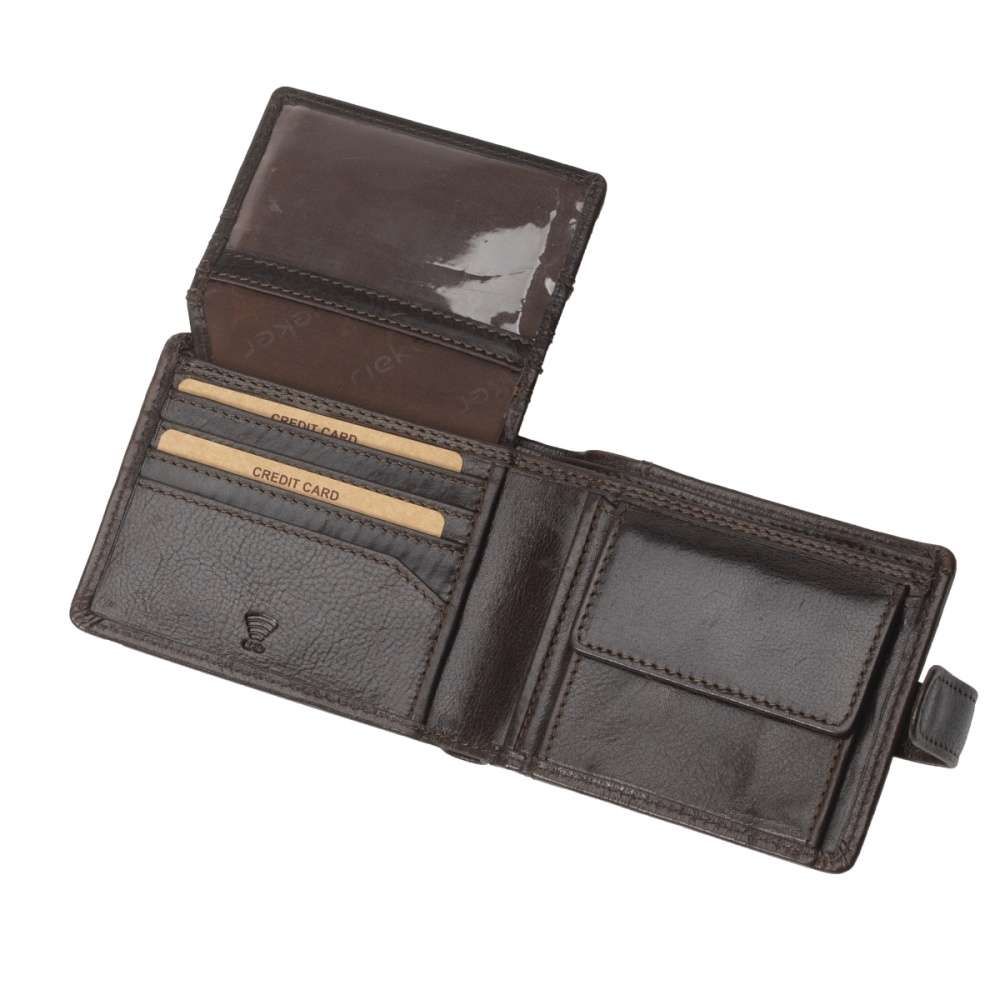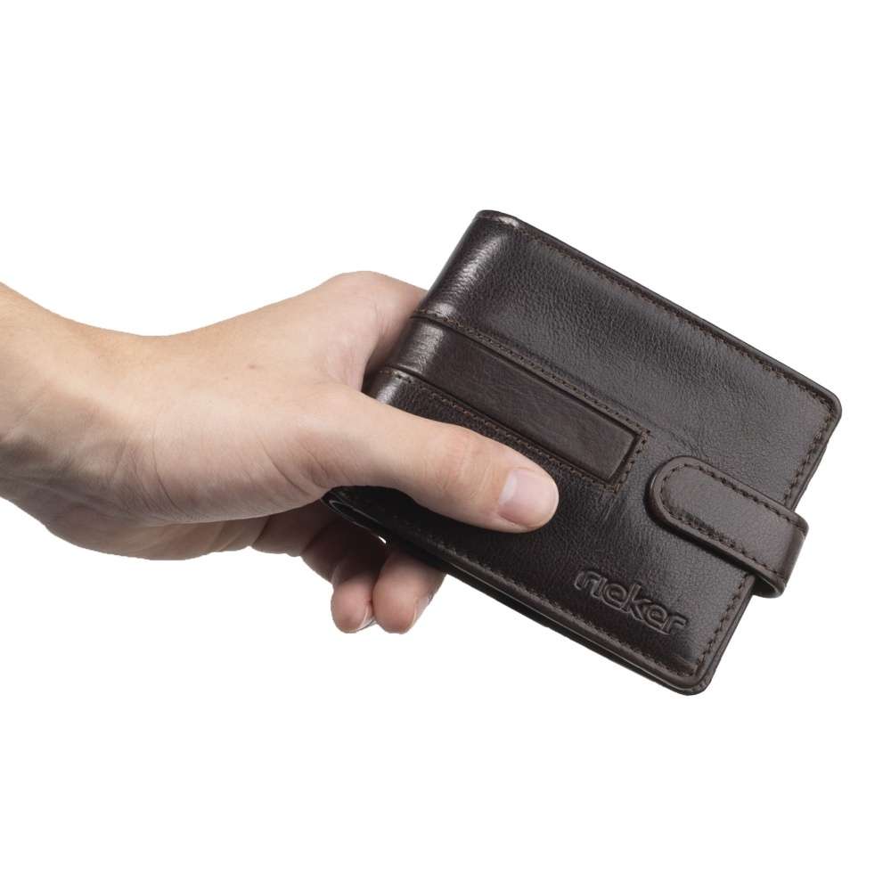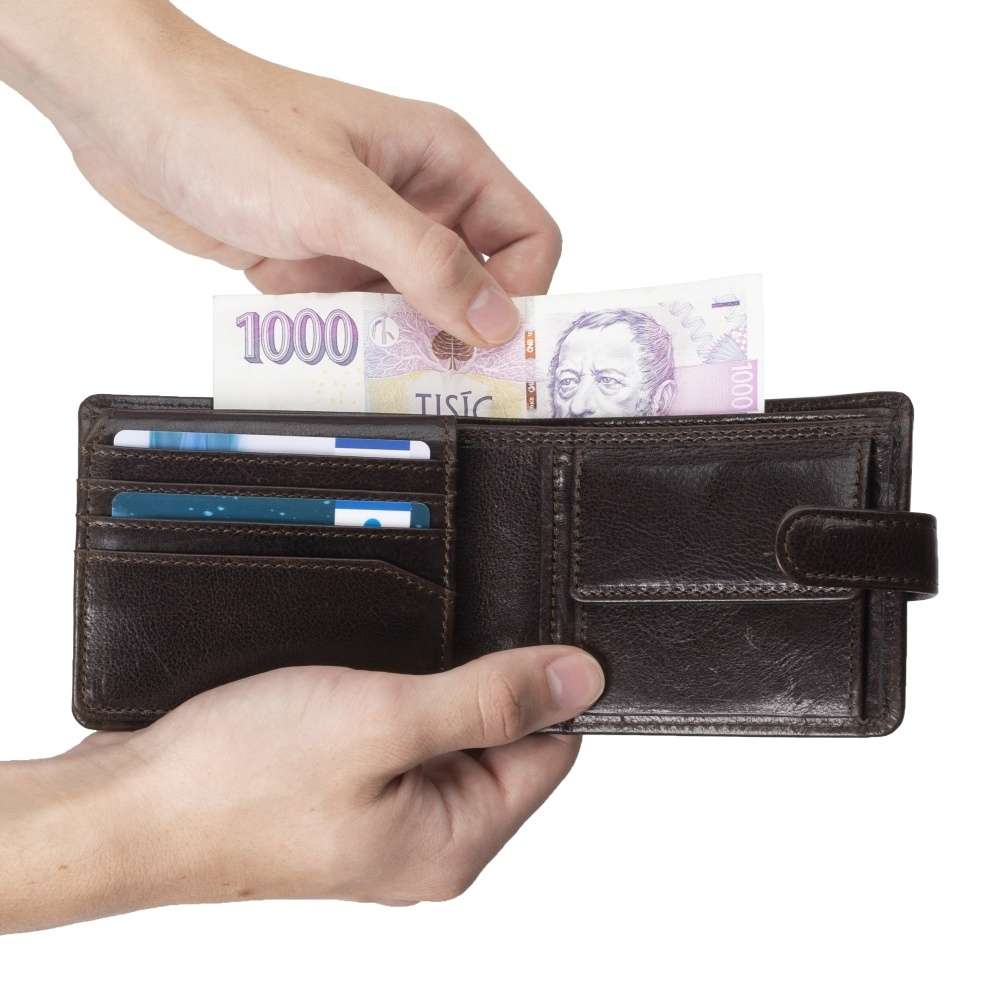 Elegantní peněženka šitá z pravé hovězí kůže je zde pro Vás všechny. Hnědý svršek je na přední straně ozdoben lehce vystouplým nápisem značky, barevně sladěným proužkem i elegantním šitím. Po otevření zapínání páskem s kovovým drukem zde najdeme praktické kapsičky na karty, papírové peníze, přihrádku na fotky i kapsičku na kovový druk, vhodnou třeba na drobné mince. Ať je léto nebo zima, každý den s tímto kouskem bude prima.