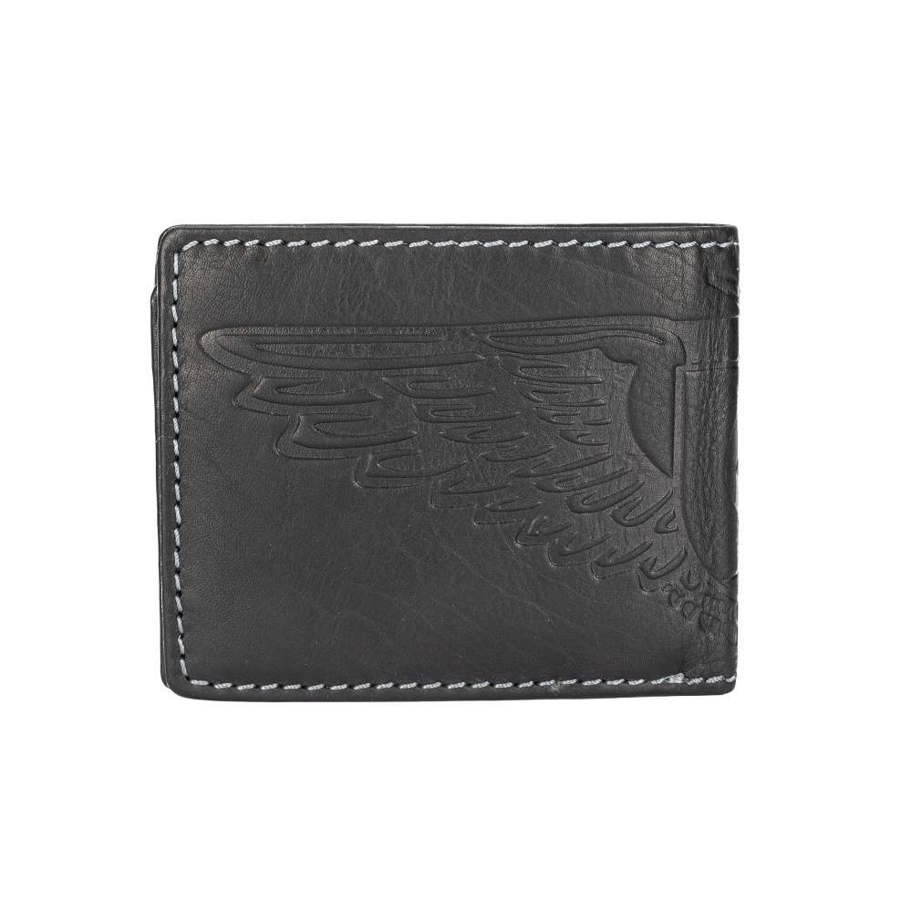 Tato pánská kožená peněženka od značky RIEKER je určena pro všechny milovníky "motorek". Černý kožený svršek zdobí po celé vnější straně vyrážená křídla a v pravém rohu nápis značky. Tento model má spoustu kapes a přihrádek. Samozřejmostí je jedna na mince se zapínáním na cvok a další, kam uschováte bankovky, karty i doklady. Rozměry: cca v 10 cm x š 12,3 cm