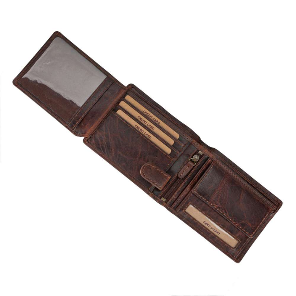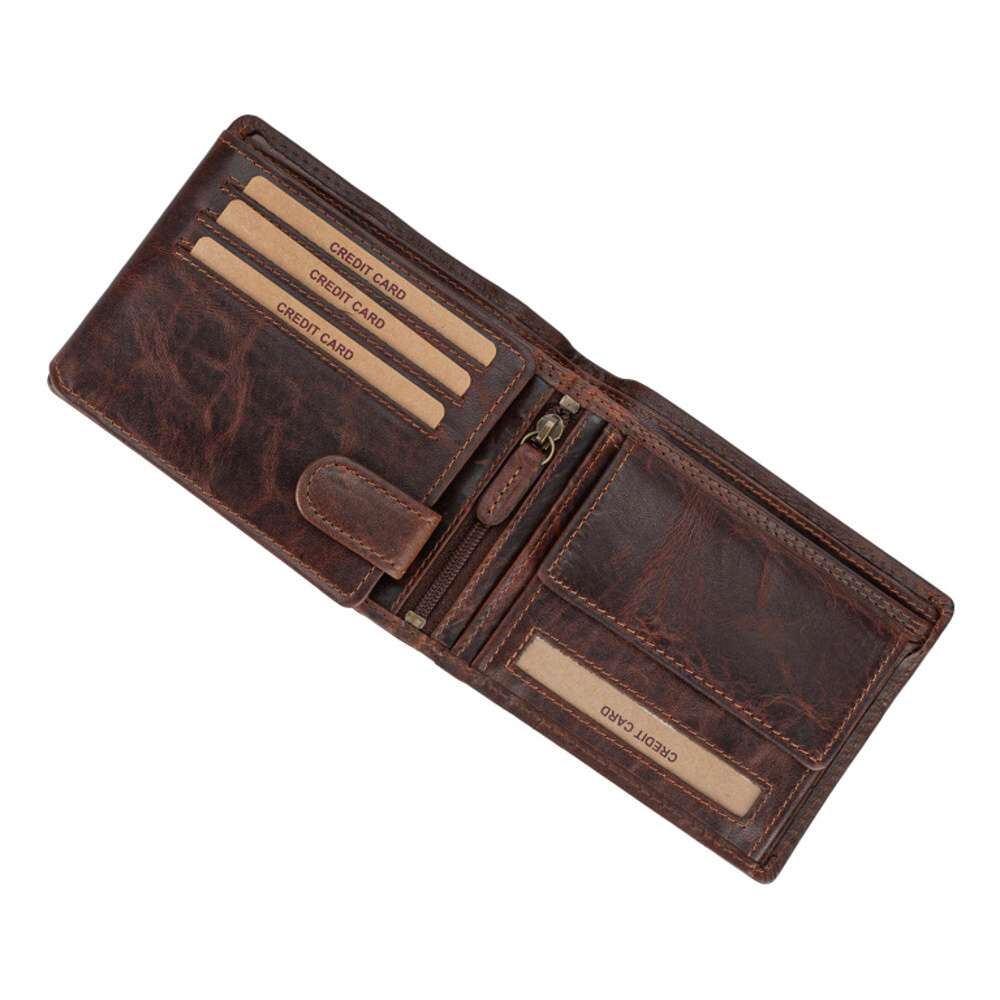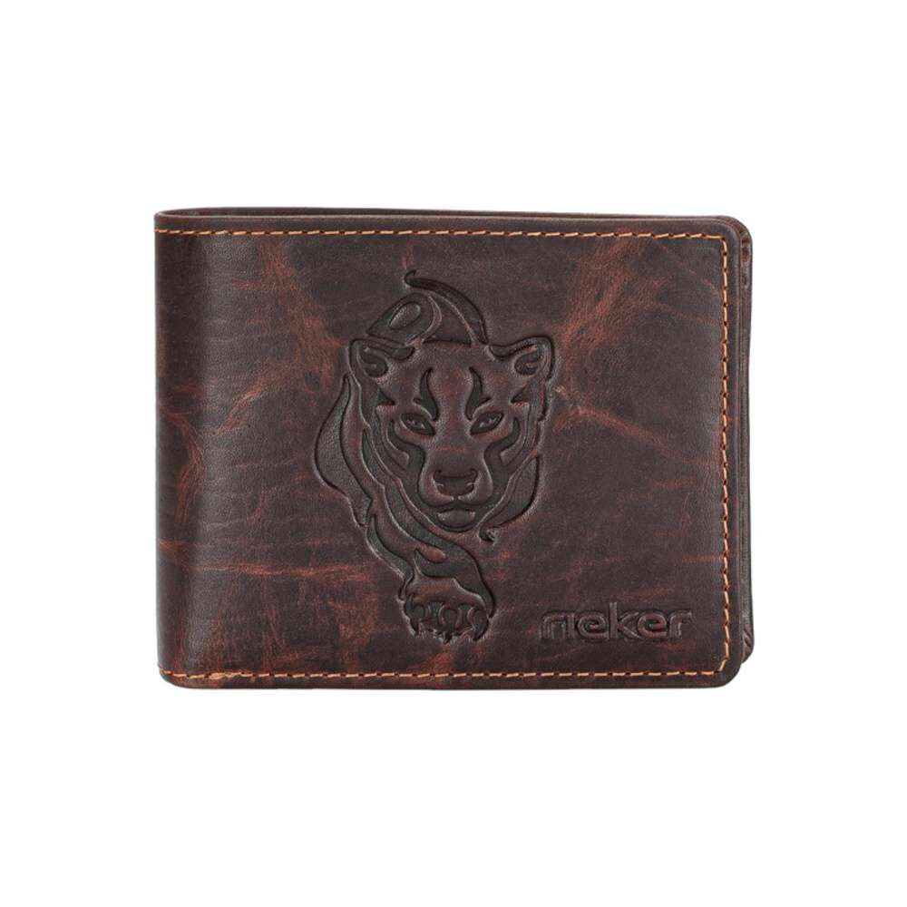 Pánská kožená peněženka značky RIEKER Vás zaujme na první pohled vytištěným obrázkem lva a logem značky. Po rozevření peněženky zde najdete spoustu kapsiček na platební karty, kapsu s drukem ideální na drobné mince, a také oddělené přihrádky na bankovky. Po odepnutí pásku s drukem se otevře další místo pro uschování Vašich karet či fotek. Tento kousek Vás bude provázet každý den.