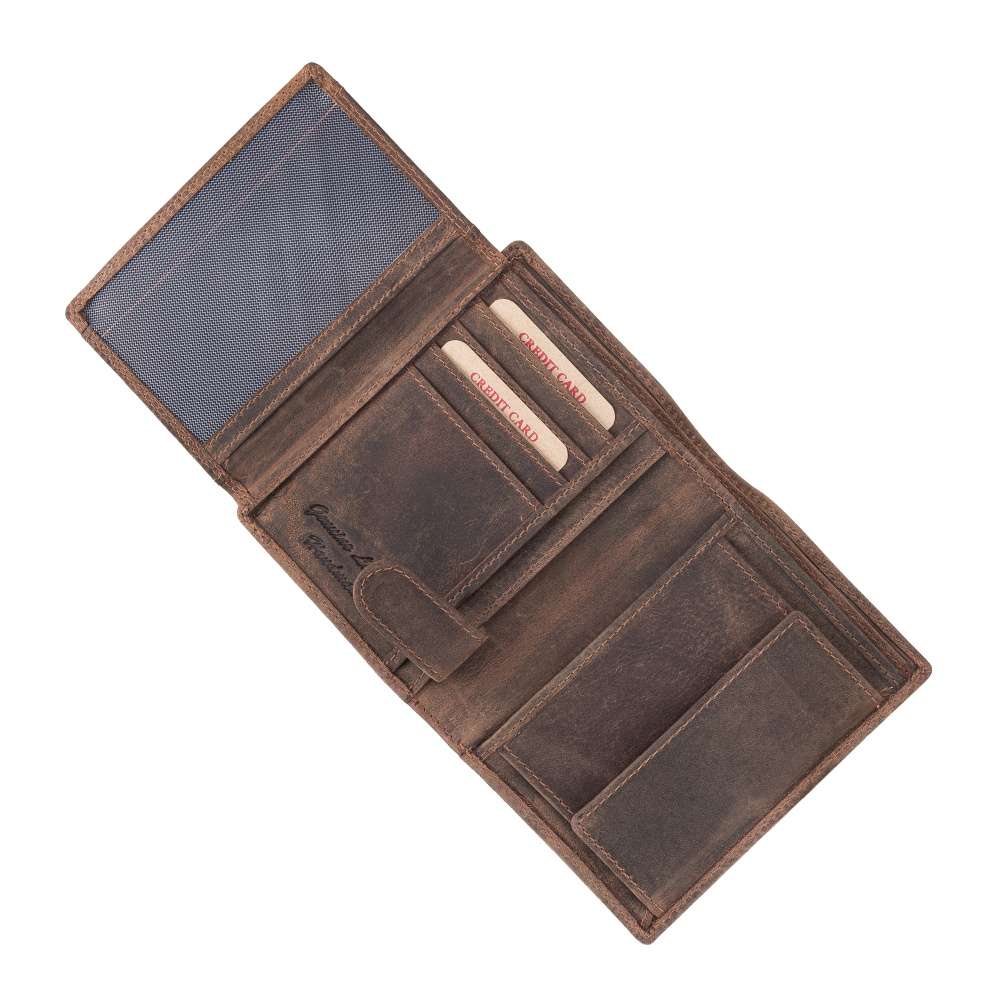 Tato hnědá kožená peněženka RIEKER je nadčasovým doplňkem pro moderního muže. Módní design podtrhuje decentní logo značky, zatímco kvalitní zpracování zaručuje dlouhou životnost. Praktické vnitřní uspořádání poskytuje dostatek prostoru pro bankovky, karty i mince, přičemž přihrádky jsou promyšleně rozloženy pro snadnou organizaci a rychlý přístup k potřebným věcem. Průhlednou část můžete využít k uložení oblíbené fotografie nebo identifikačních dokumentů. Tento model je skvělá volba pro moderního muže, který oceňuje kvalitu a praktičnost. Rozměry: cca V 12,5 cm x Š 9,5 cm x H 2,5 cm