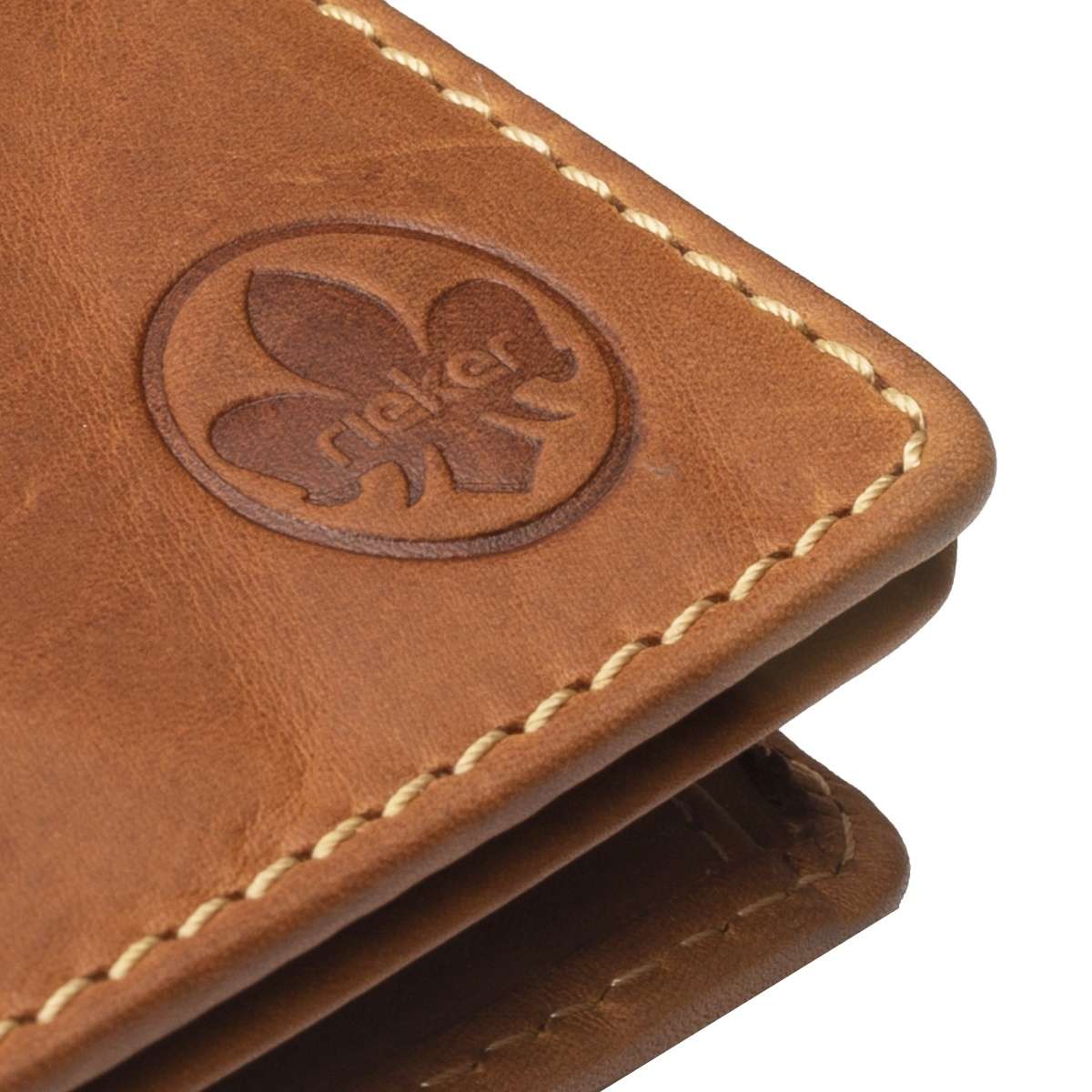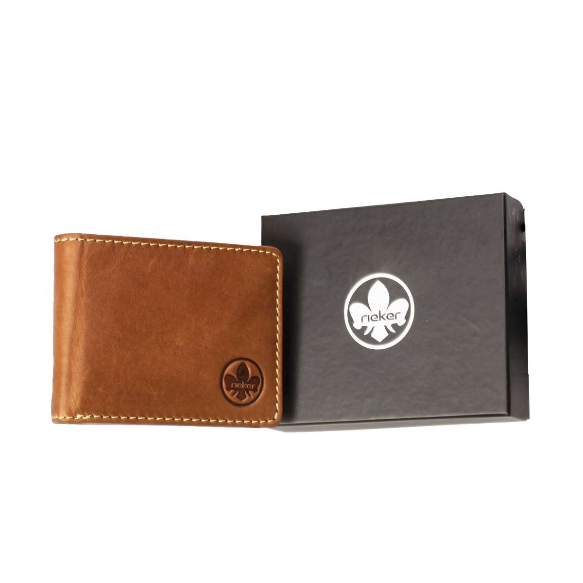 Nádherná pánská peněženka Rieker si Vás získá hned na první pohled. Svršek peněženky vyrobený z kvalitní hovězí kůže světle hnědé barvy je na přední straně ozdoben jemně vytlačeným logem značky. Po otevření zde najdeme praktické kapsičky na karty, papírové peníze, přihrádku na fotky, kapsičku uzavíratelnou zipem i kapsičku na kovový cvok, vhodnou třeba na drobné mince. Tato peněženka bude Vaším parťákem při všech příležitostech.