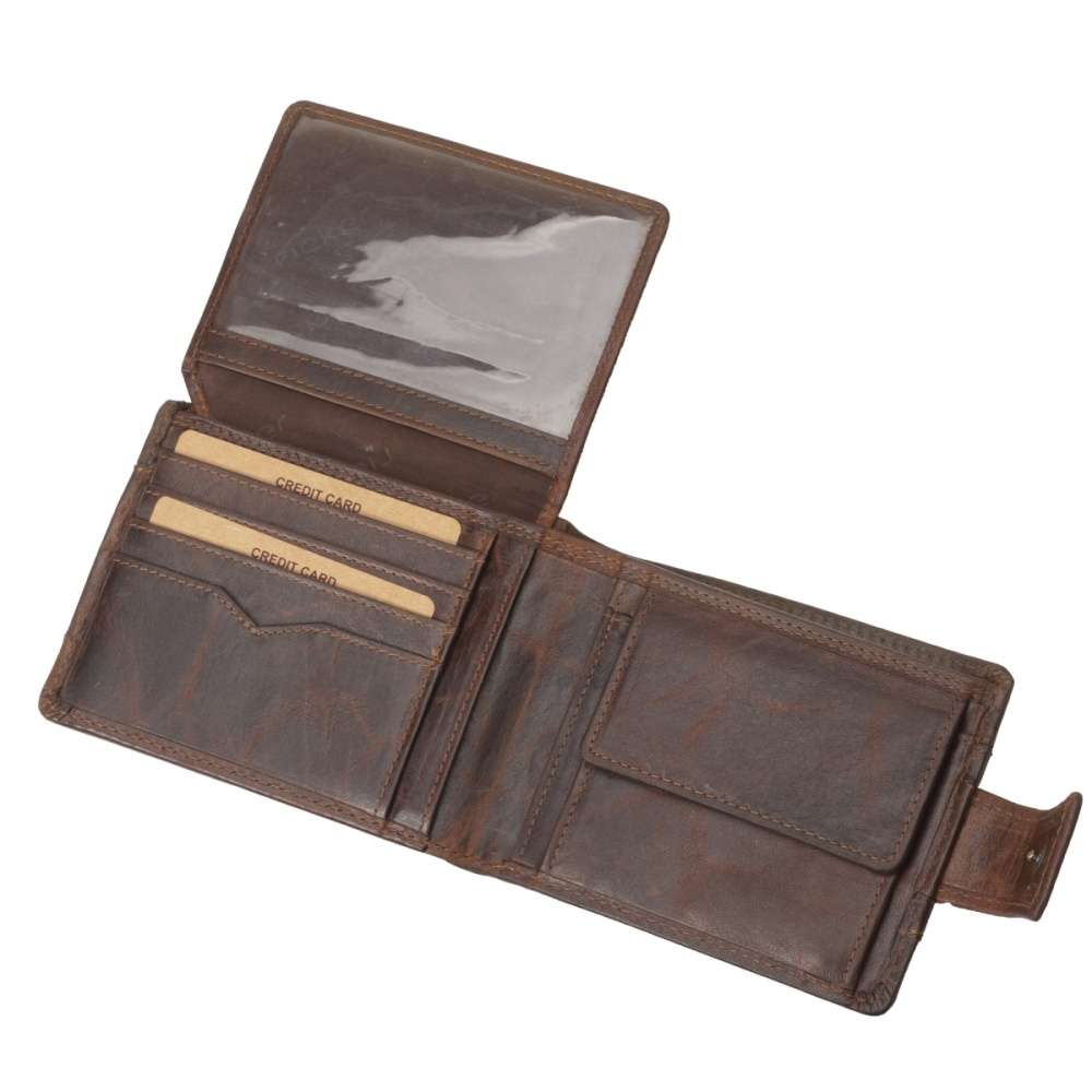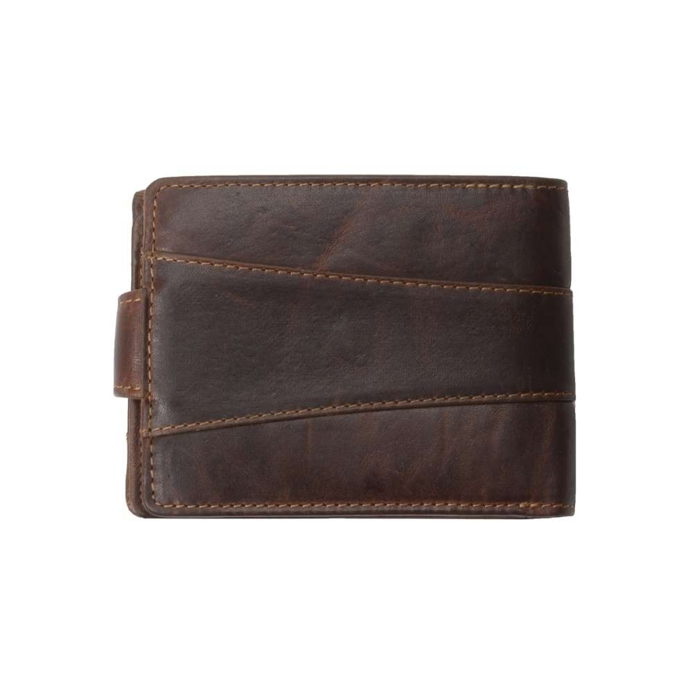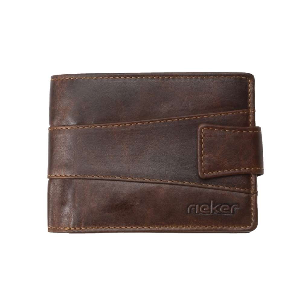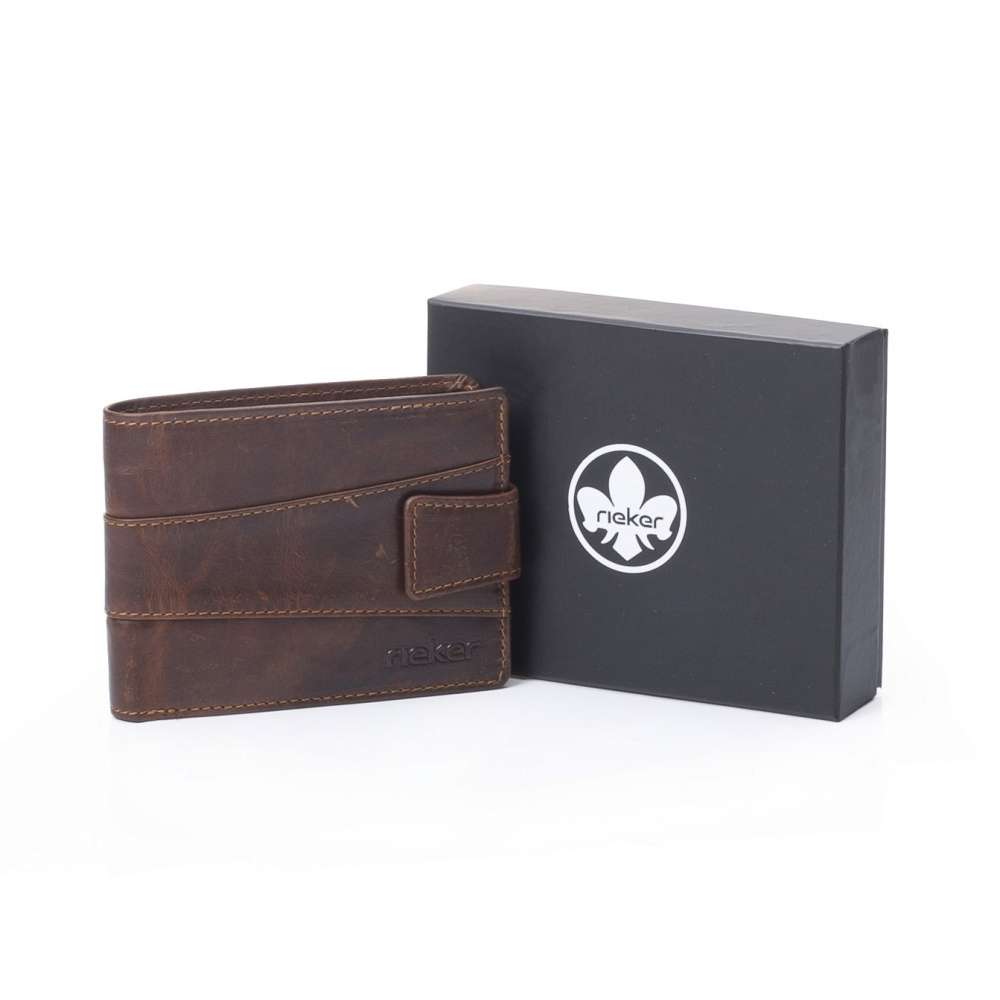 Pánská peněženka Rieker z pravé kůže. Hnědý stínovaný svršek zdobí elegantní prošívání a v pravém rohu nápis značky. Tento model má zapínání na druk a uvnitř spoustu kapes a přihrádek. Samozřejmostí je jedna na mince se zapínáním a další, kam uschováte bankovky, karty i doklady.