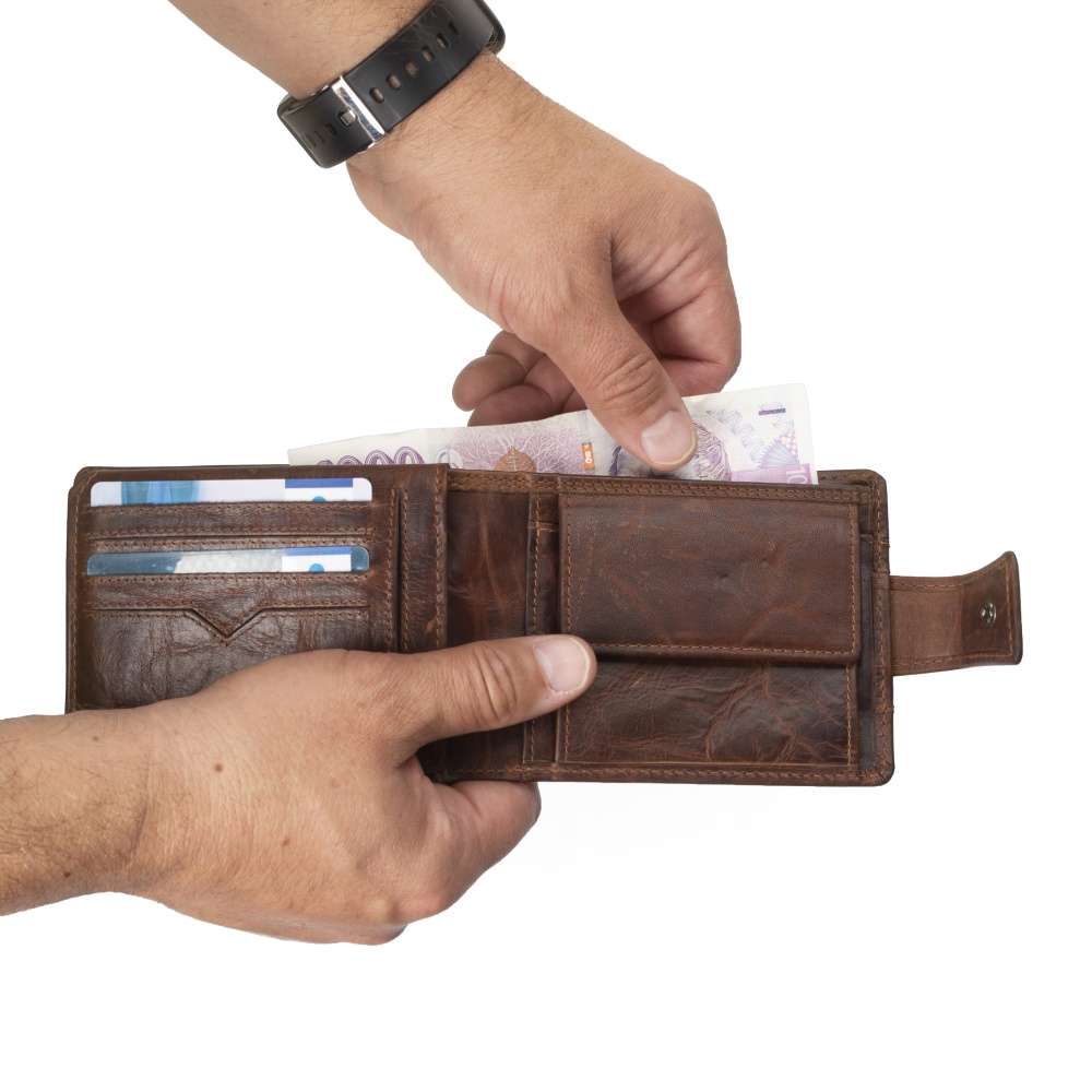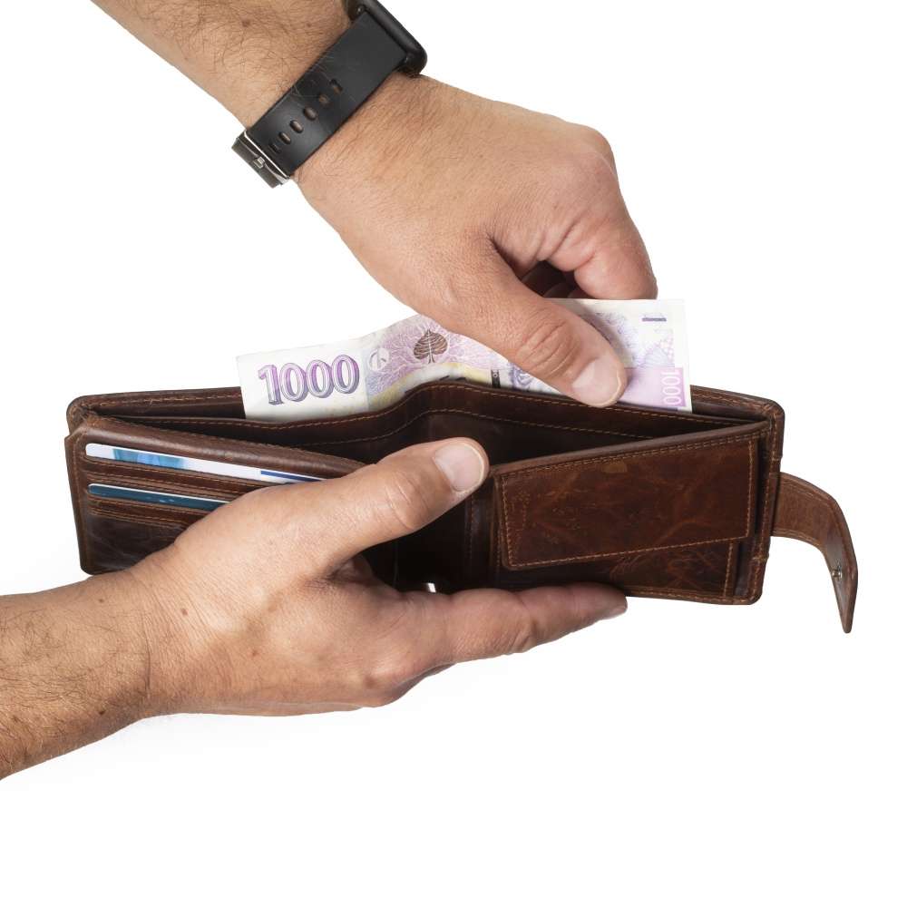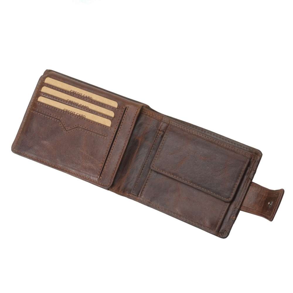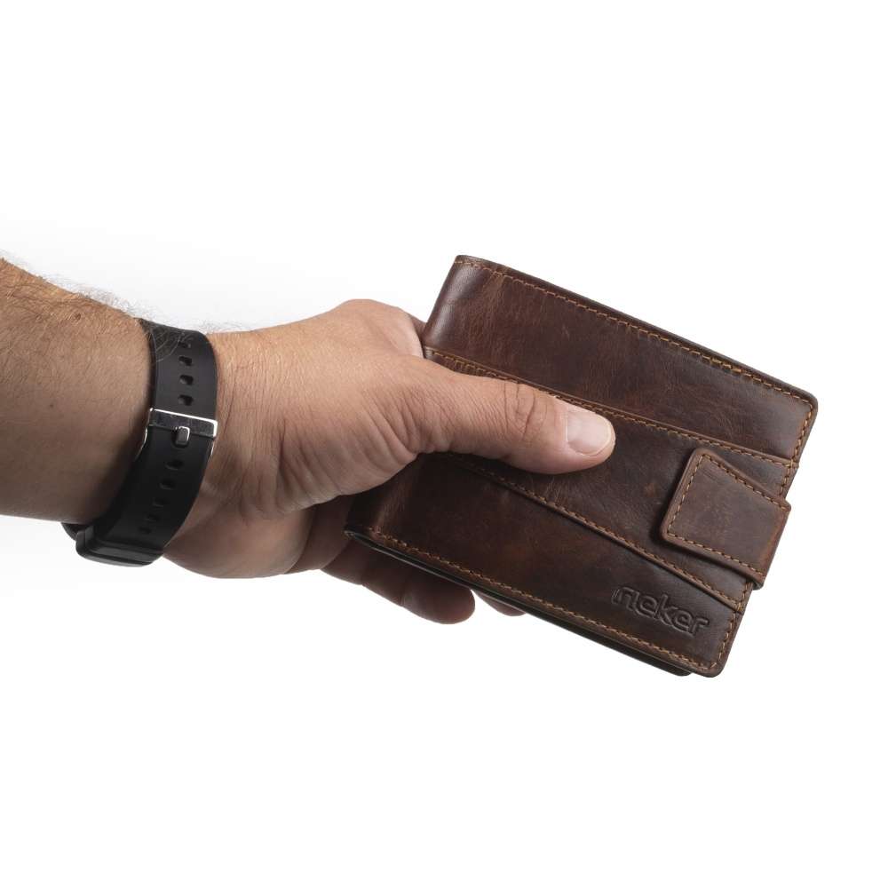 Pánská peněženka Rieker z pravé kůže. Hnědý stínovaný svršek zdobí elegantní prošívání a v pravém rohu nápis značky. Tento model má zapínání na druk a uvnitř spoustu kapes a přihrádek. Samozřejmostí je jedna na mince se zapínáním a další, kam uschováte bankovky, karty i doklady.