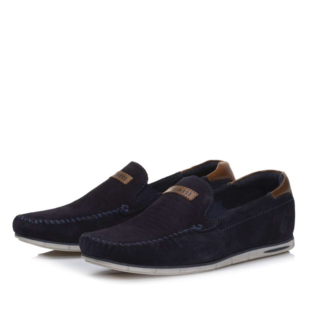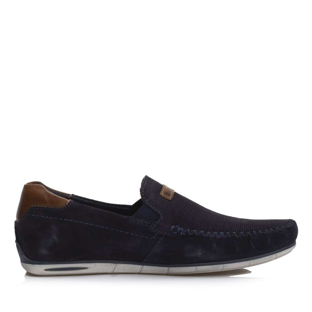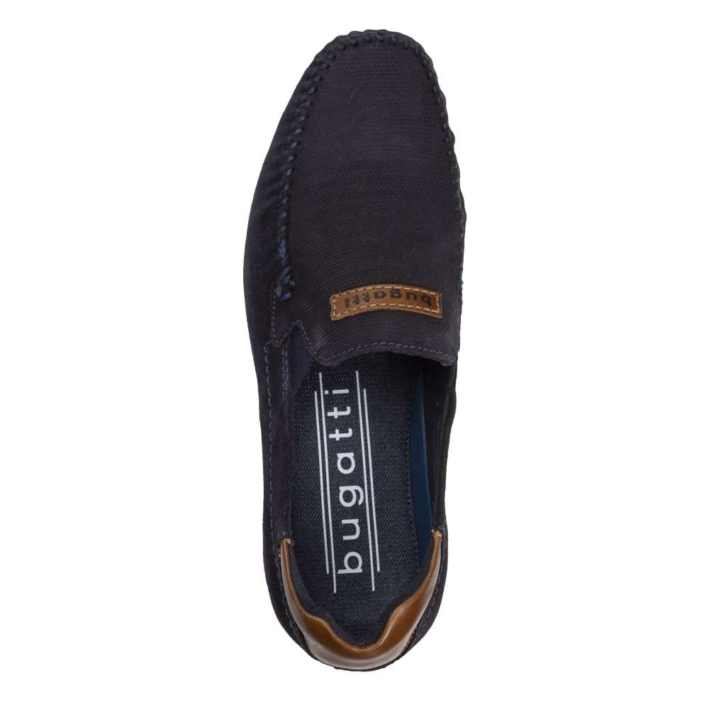 Svršek tmavě modré barvy je v oblasti paty a na nártu doplněn o hnědou část. Pro snadné nazouvání jsou zde po stranách všity pružné gumičky.