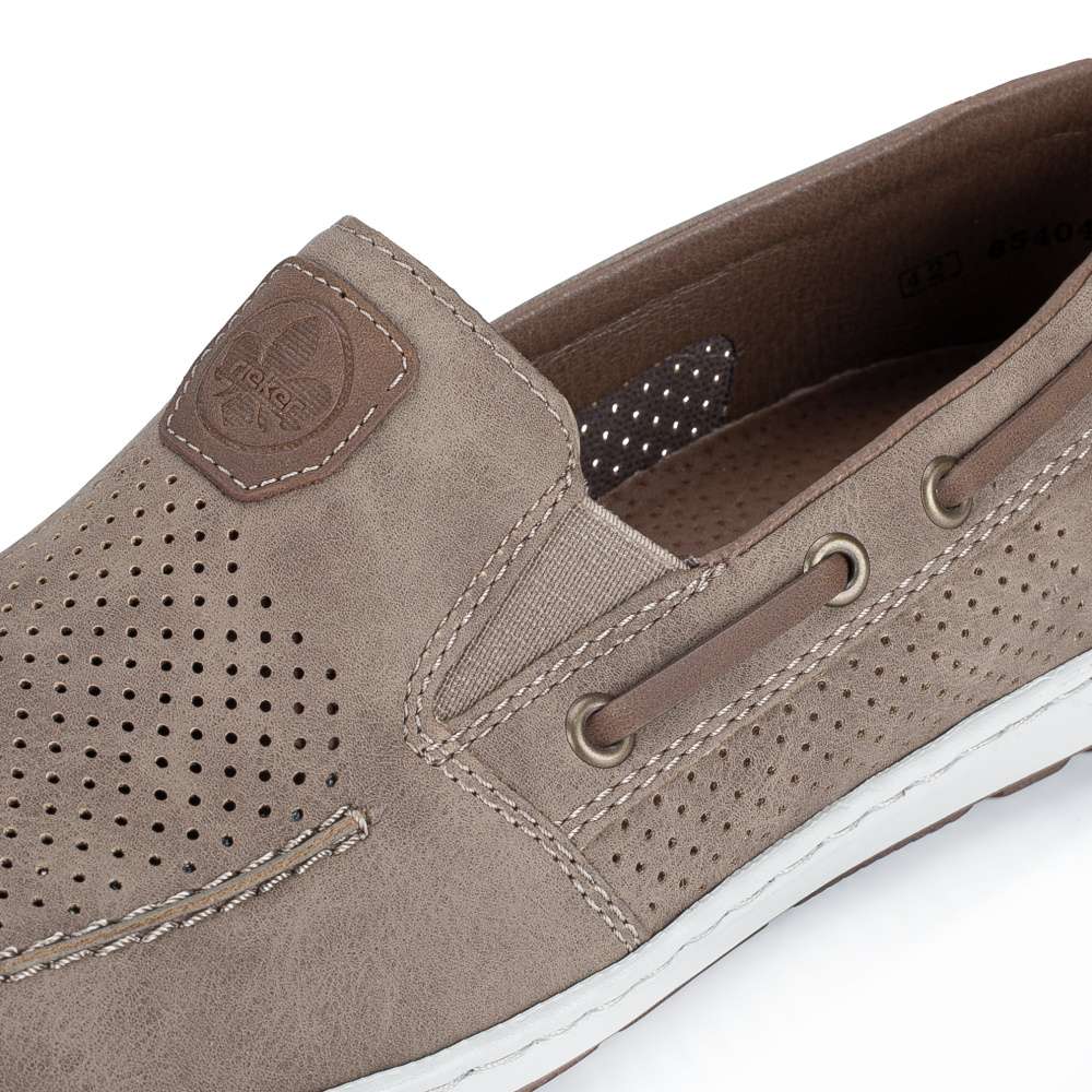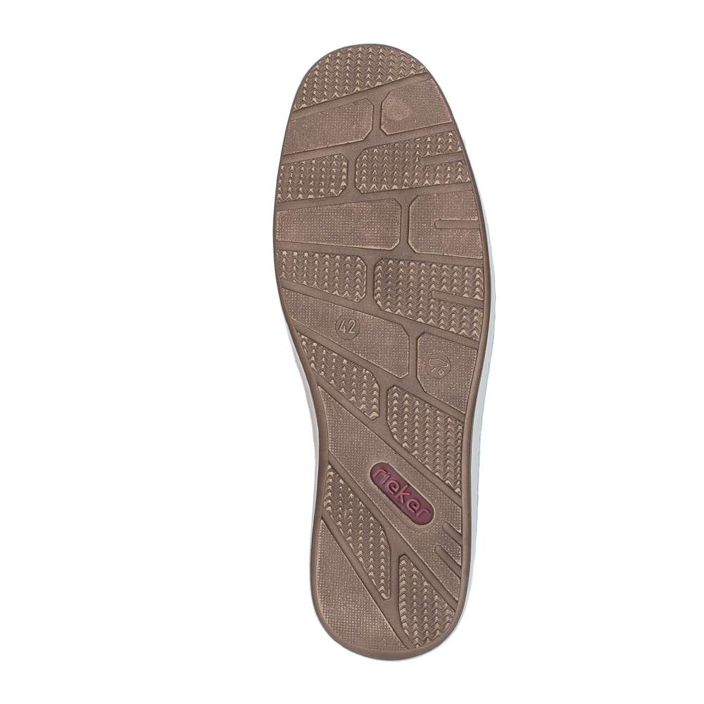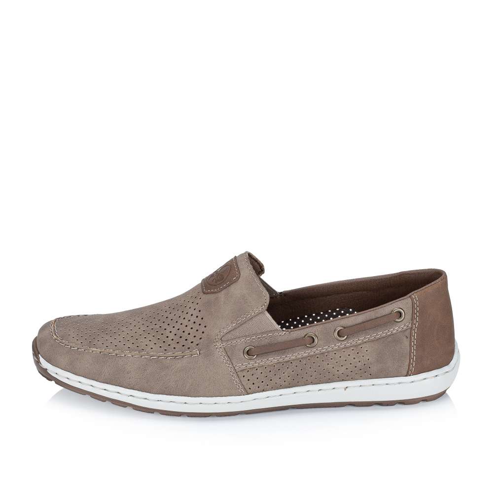 Tyto pánské mokasíny značky RIEKER nabízí dokonalou rovnováhu mezi stylem a pohodlím. Design mokasín je nadčasový a univerzální, díky čemuž se hodí pro každodenní nošení, do práce i pro volný čas. Béžový svršek bot je doplněn perforovaným vzorem, efektními aplikacemi a nášivkou s logem značky, které přidávají modelu atraktivní vzhled. Pružné gumičky po stranách nártu zajišťují snadné obouvání a zároveň umožňují optimální přizpůsobení noze. Flexibilní podešev s tlumením nárazů zajišťuje pohodlnou chůzi během celého dne a dodává pocit stability při každém kroku. Tento model je ideální volbou pro muže, kteří nechtějí dělat kompromis mezi atraktivním vzhledem a komfortem.