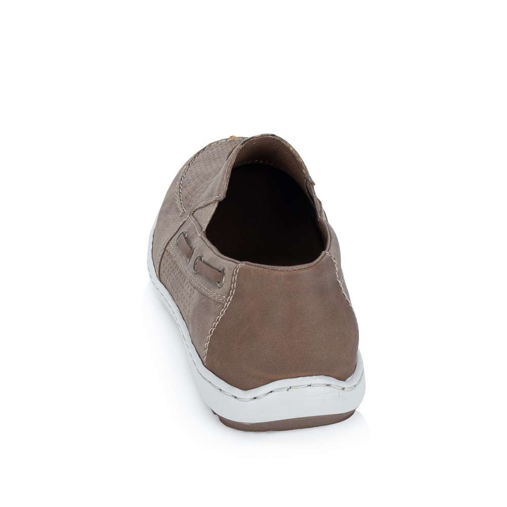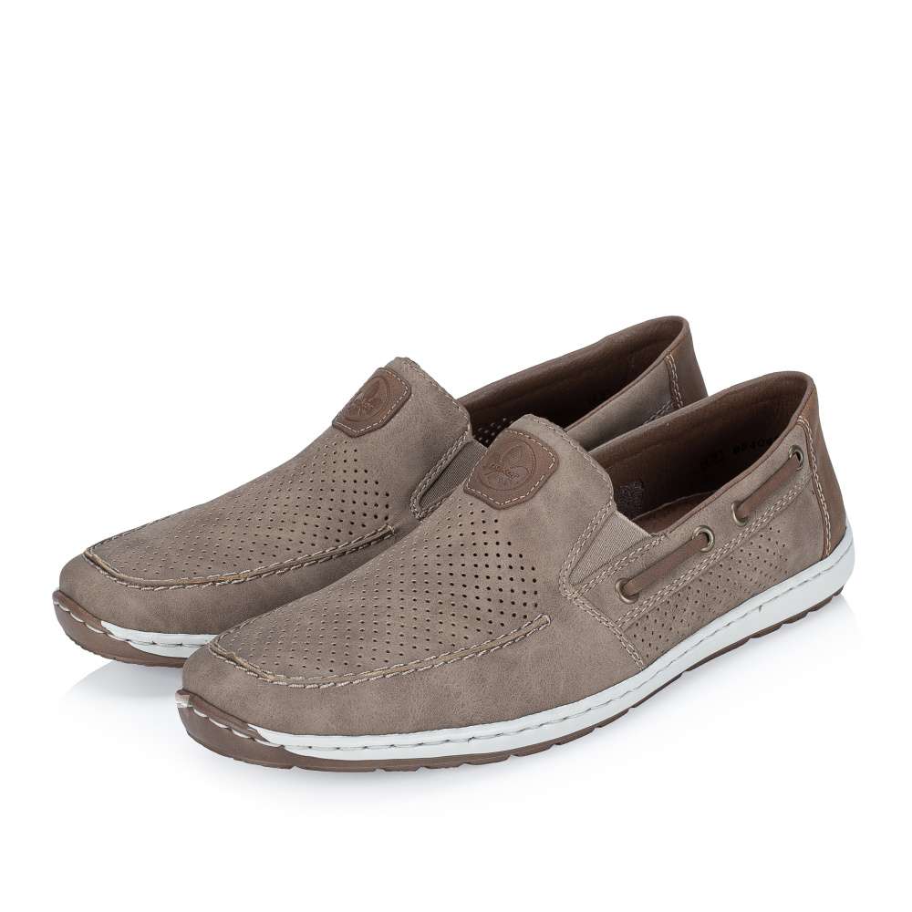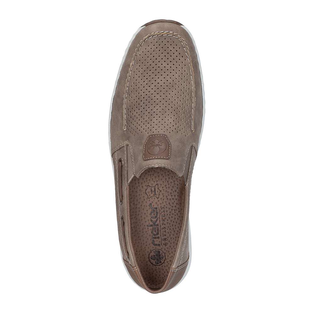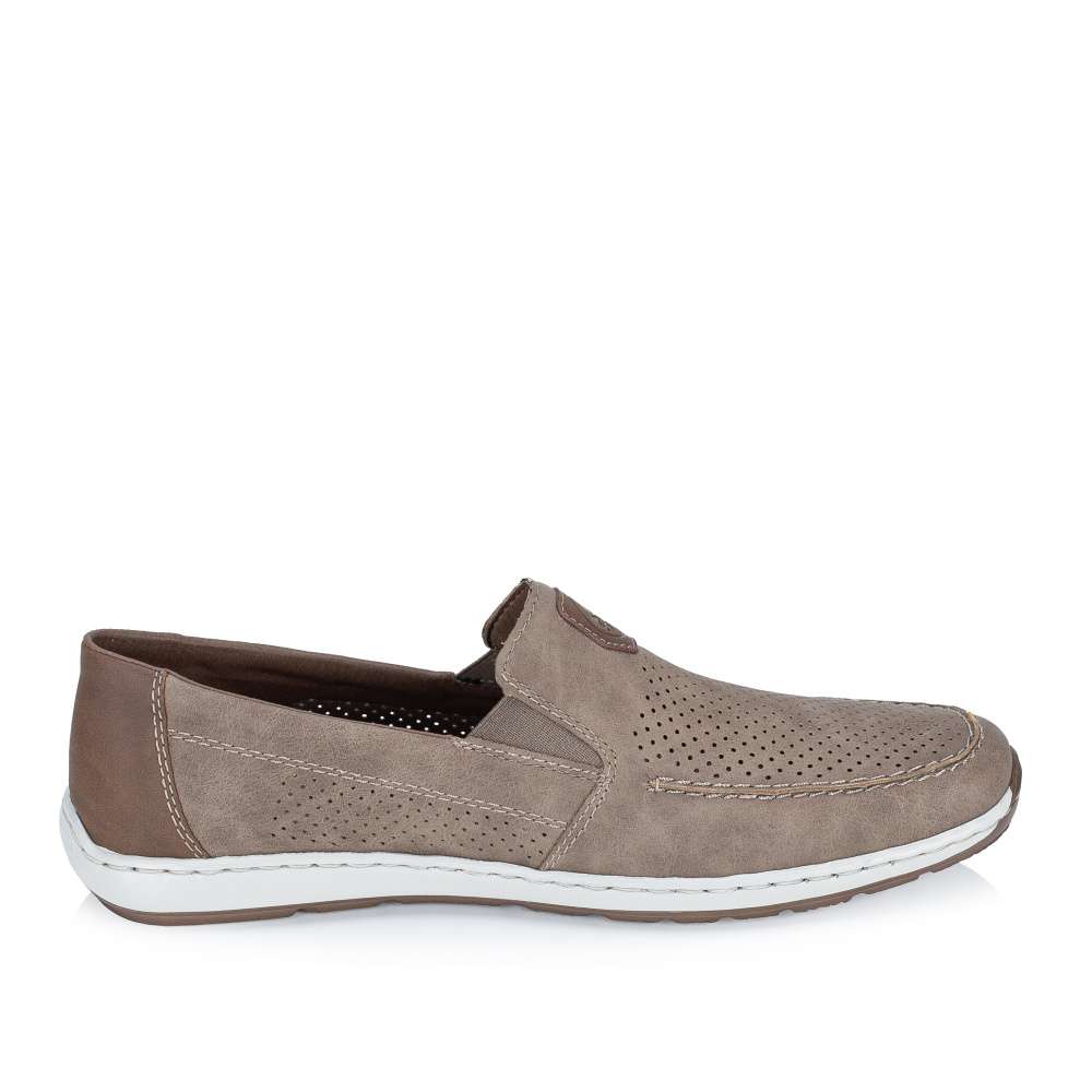 Tyto pánské mokasíny značky RIEKER nabízí dokonalou rovnováhu mezi stylem a pohodlím. Design mokasín je nadčasový a univerzální, díky čemuž se hodí pro každodenní nošení, do práce i pro volný čas. Béžový svršek bot je doplněn perforovaným vzorem, efektními aplikacemi a nášivkou s logem značky, které přidávají modelu atraktivní vzhled. Pružné gumičky po stranách nártu zajišťují snadné obouvání a zároveň umožňují optimální přizpůsobení noze. Flexibilní podešev s tlumením nárazů zajišťuje pohodlnou chůzi během celého dne a dodává pocit stability při každém kroku. Tento model je ideální volbou pro muže, kteří nechtějí dělat kompromis mezi atraktivním vzhledem a komfortem.