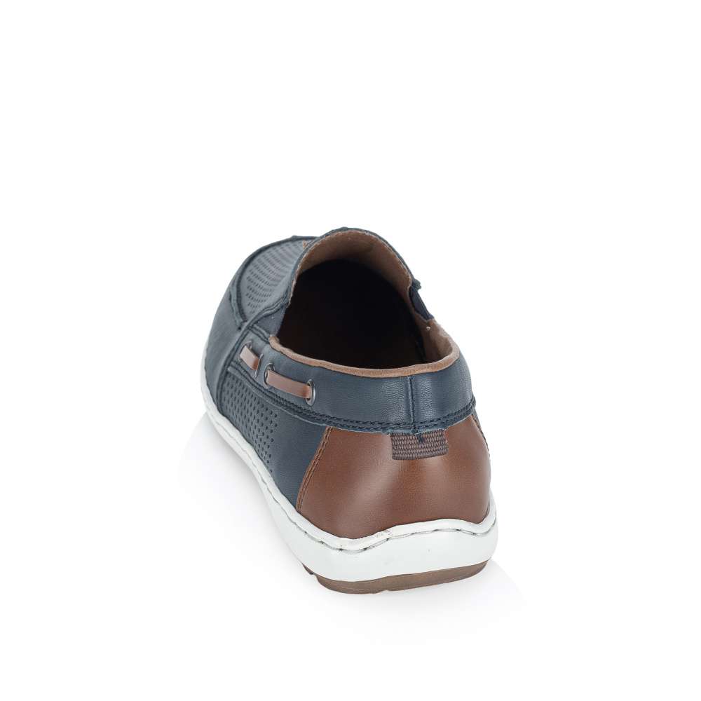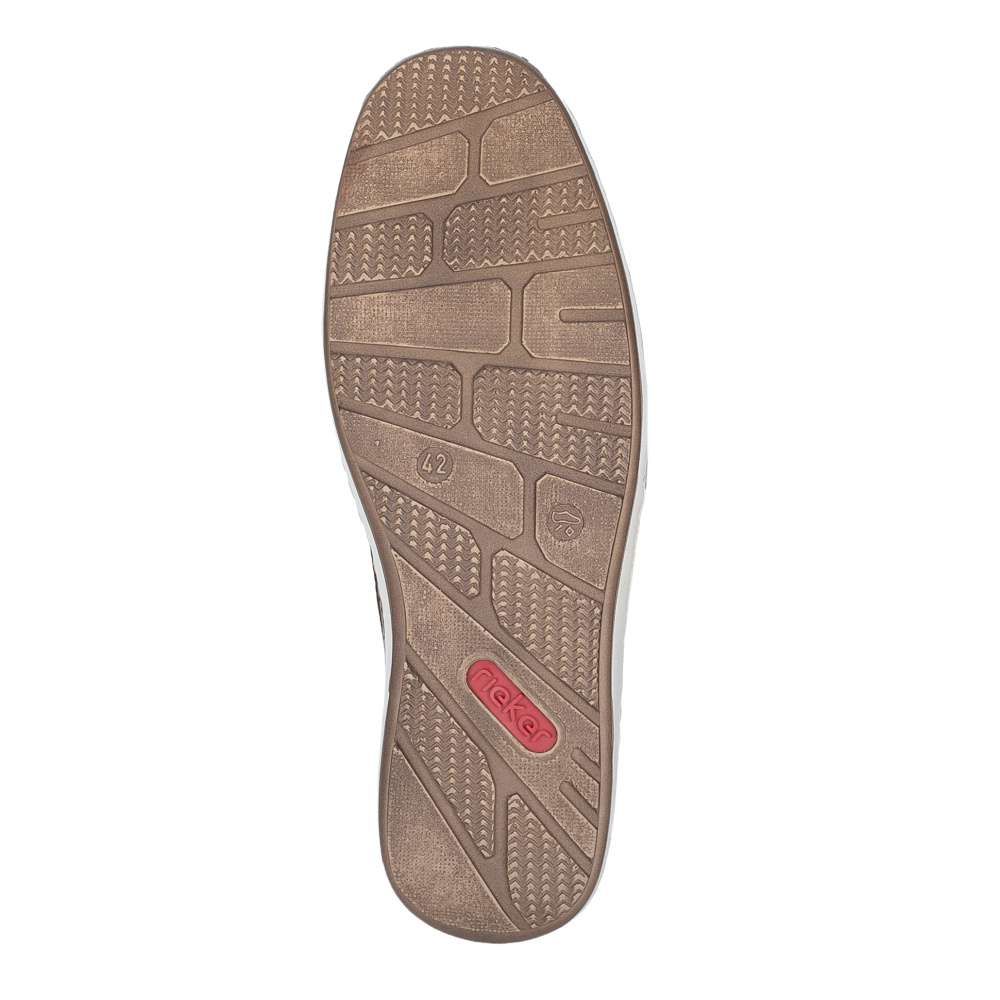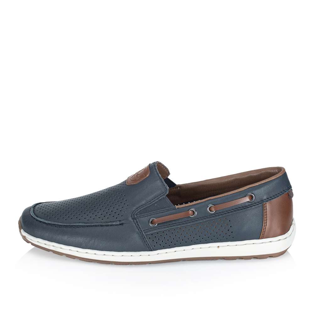 Tyto pánské mokasíny značky RIEKER nabízí dokonalou rovnováhu mezi stylem a pohodlím. Design mokasín je nadčasový a univerzální, díky čemuž se hodí pro každodenní nošení, do práce i pro volný čas. Kožený svršek bot je doplněn perforovaným vzorem, efektními aplikacemi a nášivkou s logem značky, které přidávají modelu atraktivní vzhled. Pružné gumičky po stranách nártu zajišťují snadné obouvání a zároveň umožňují optimální přizpůsobení noze. Flexibilní podešev s tlumením nárazů zajišťuje pohodlnou chůzi během celého dne a dodává pocit stability při každém kroku. Tento model je ideální volbou pro muže, kteří nechtějí dělat kompromis mezi atraktivním vzhledem a komfortem.